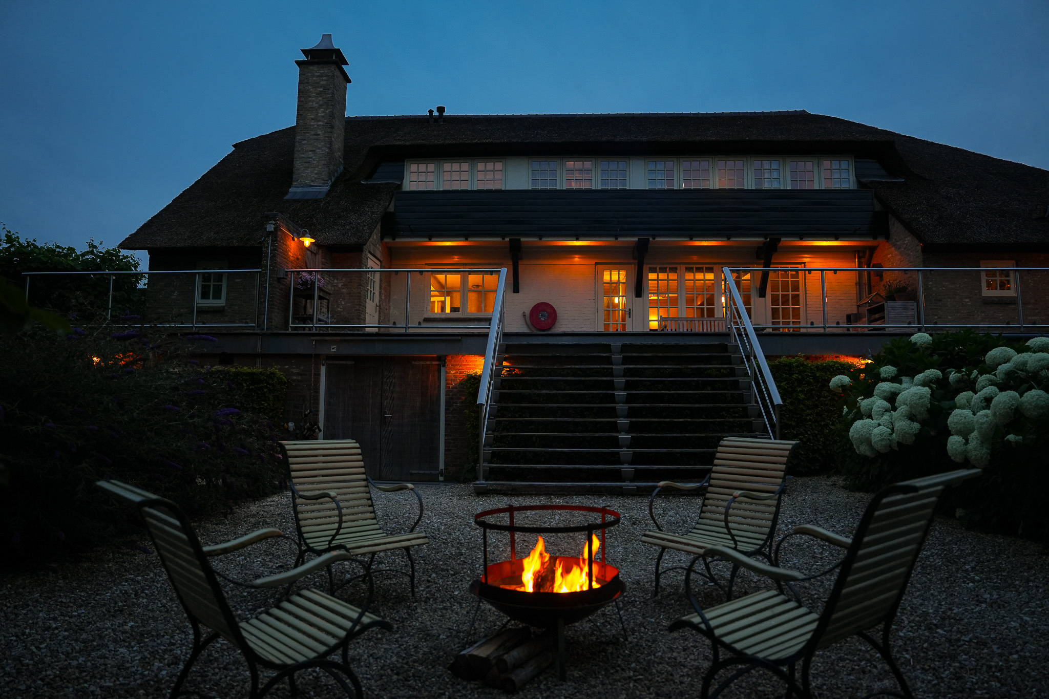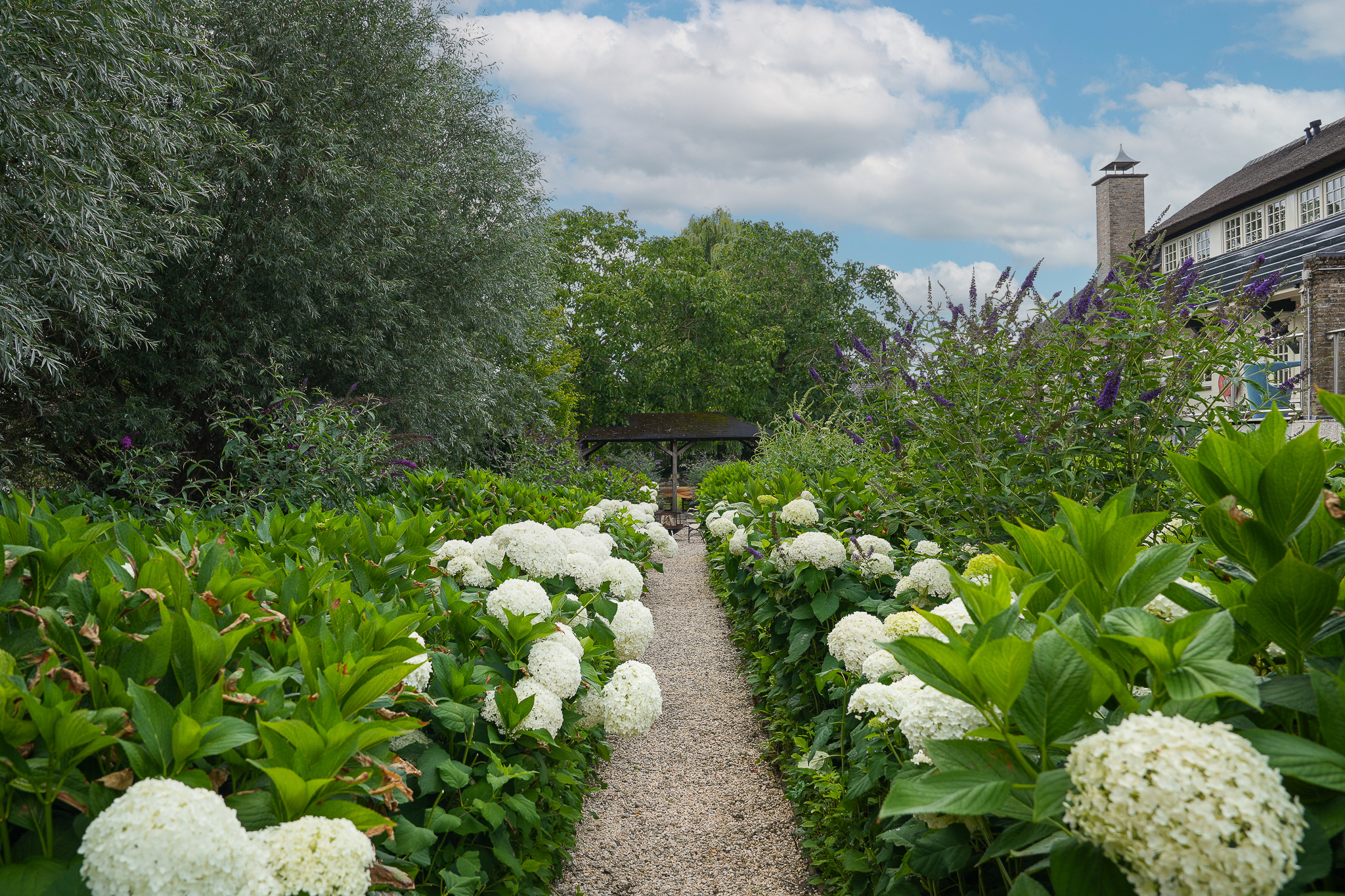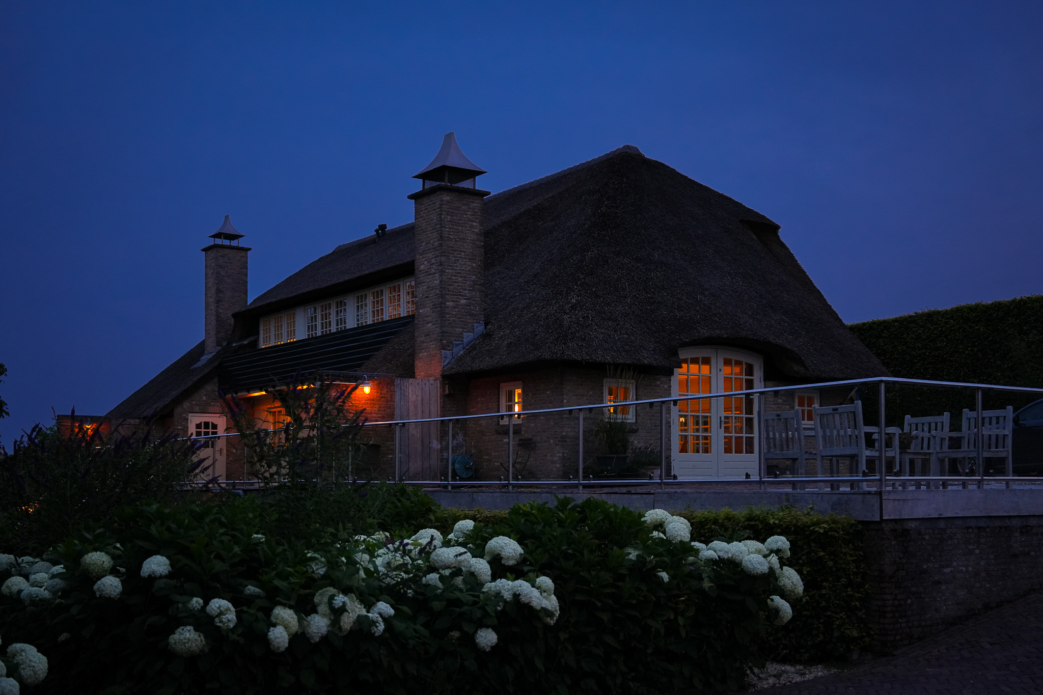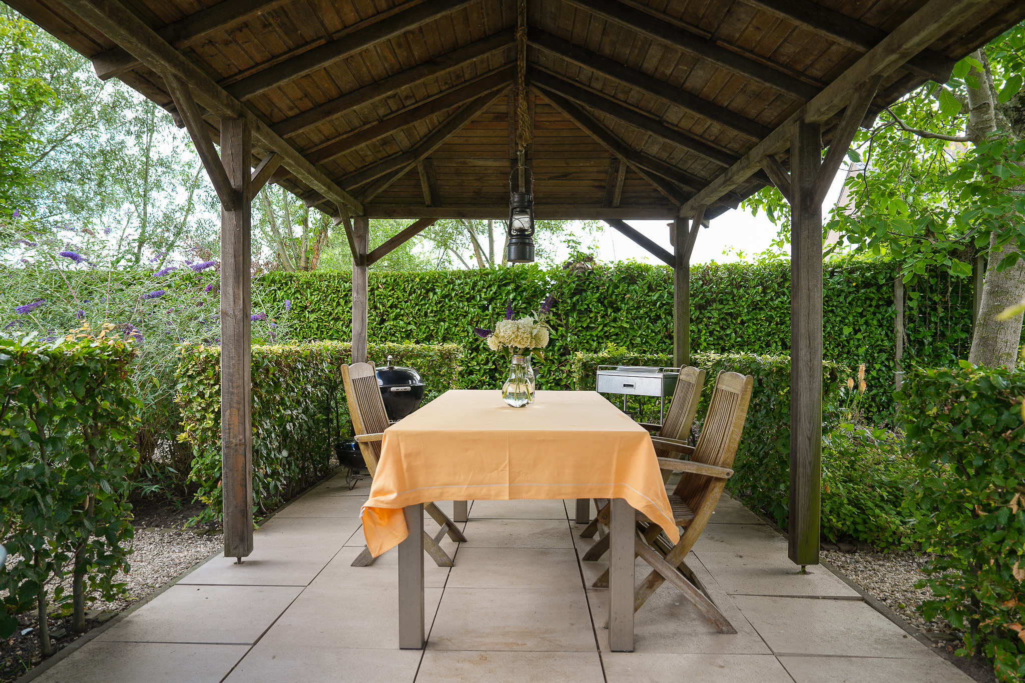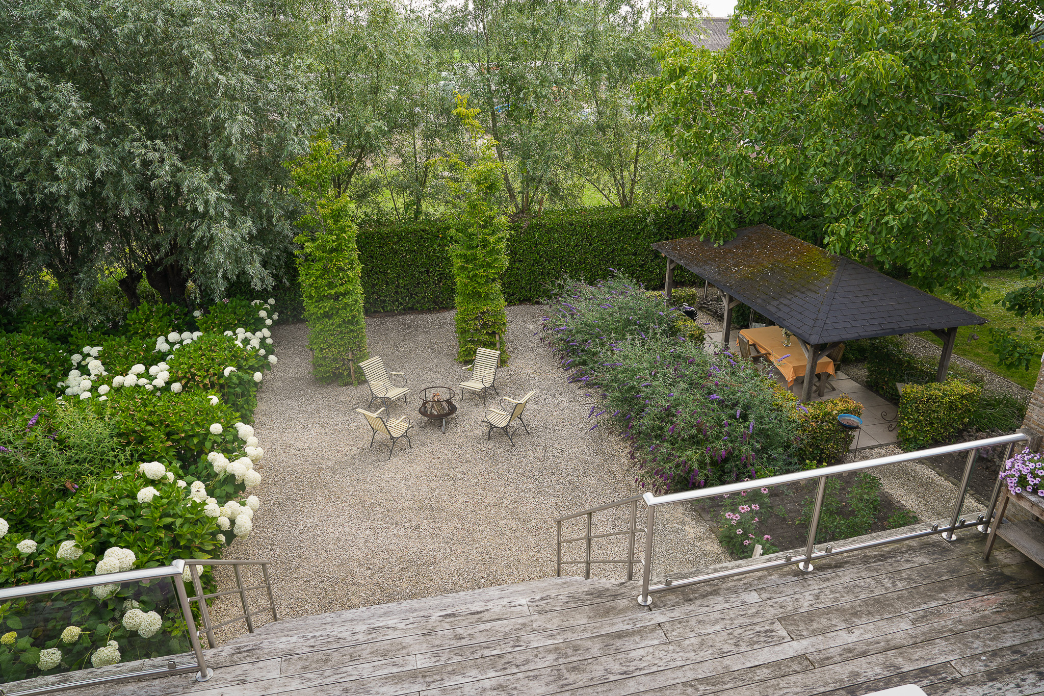 To the left of the driveway stands a solid outbuilding with a tiled roof, including a double carport, garage, and storage for motorcycles and bicycles. The garden has been landscaped for easy maintenance, with large hardwood terraces, transparent stainless-steel balustrades, decorative hydrangea borders, and a lawn with mature planting. The sloping bank along the dike is planted with, among others, periwinkle and barren strawberry.