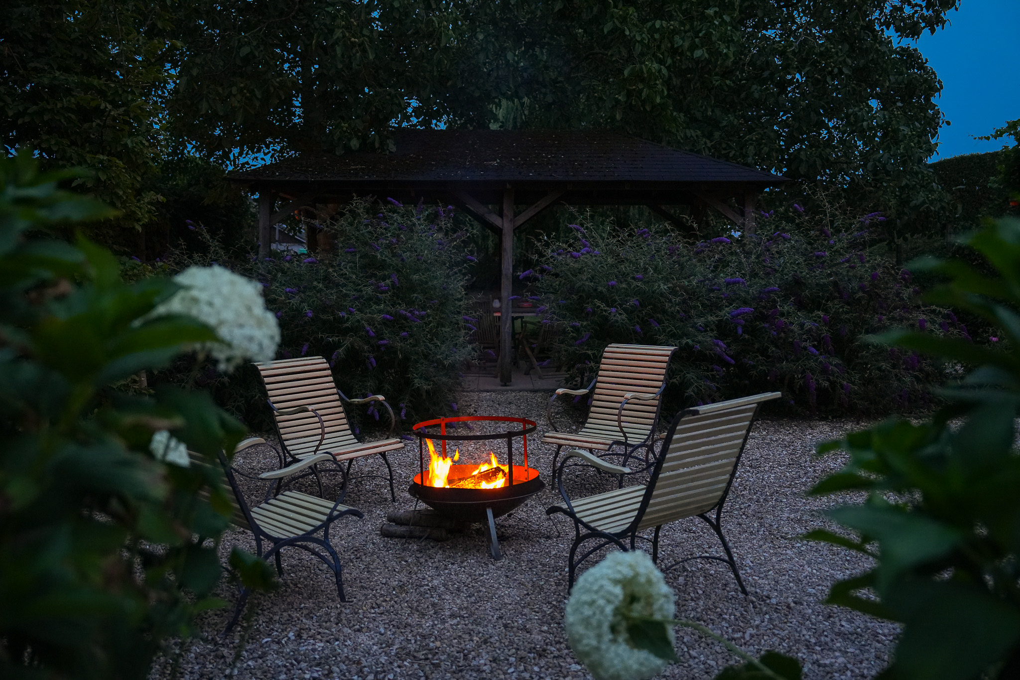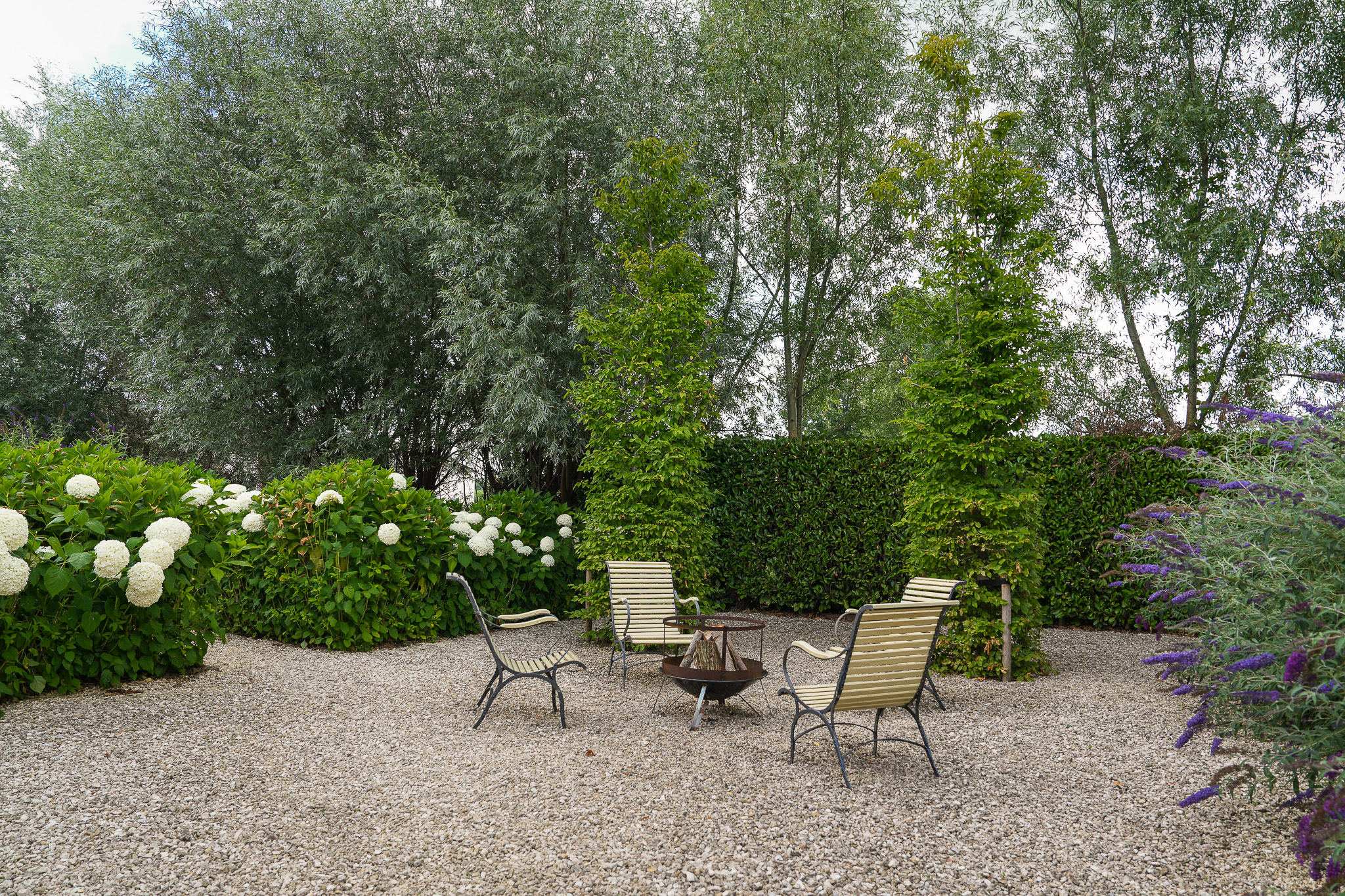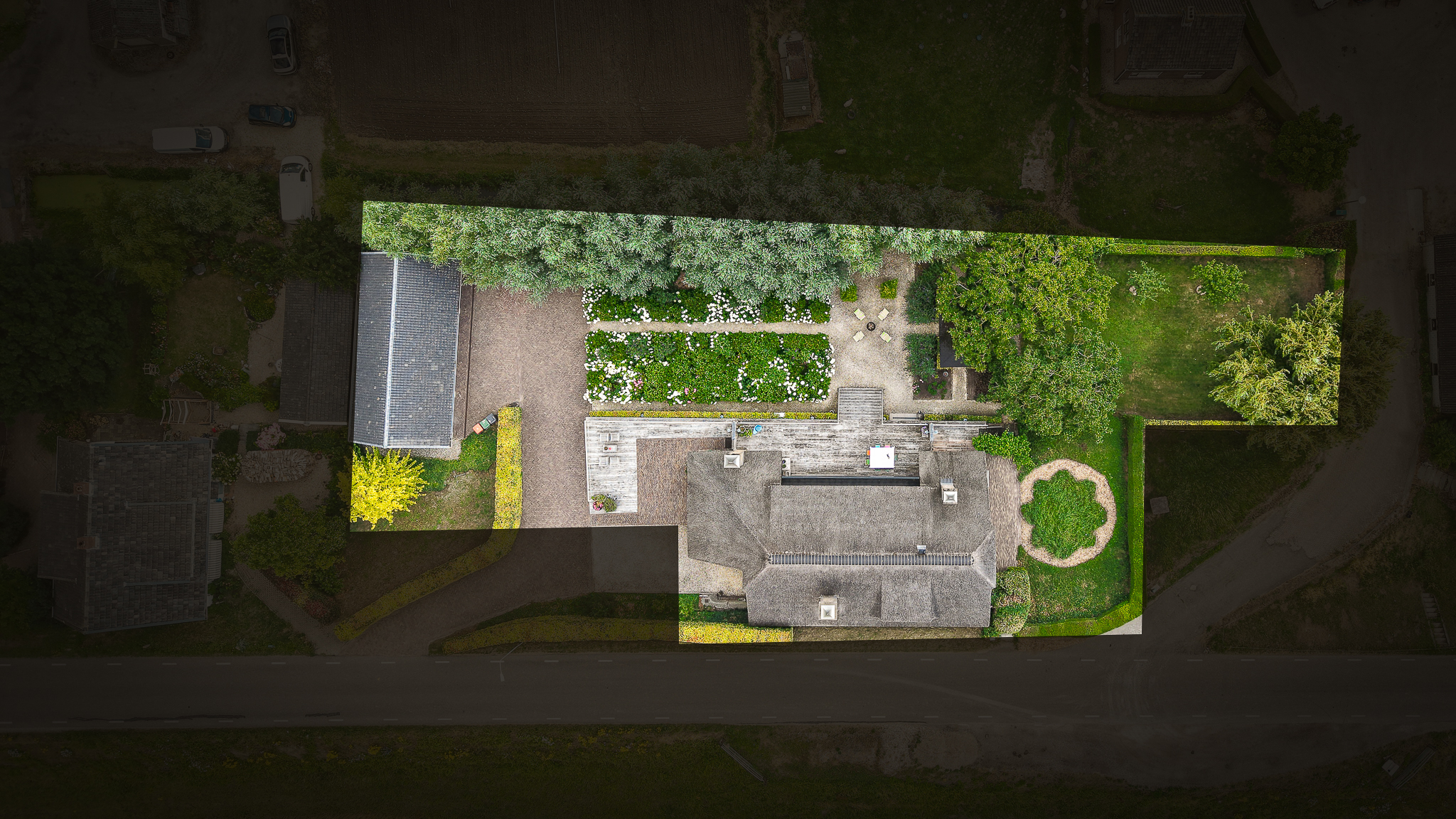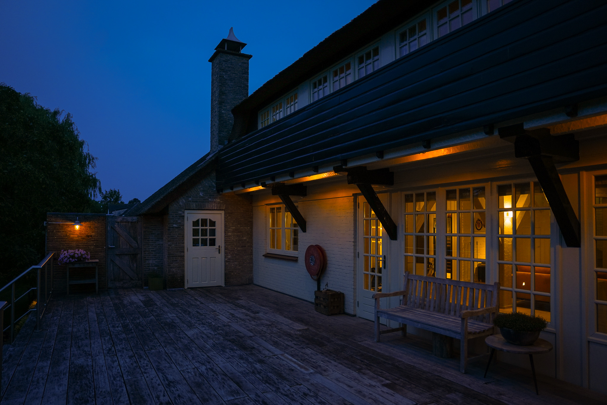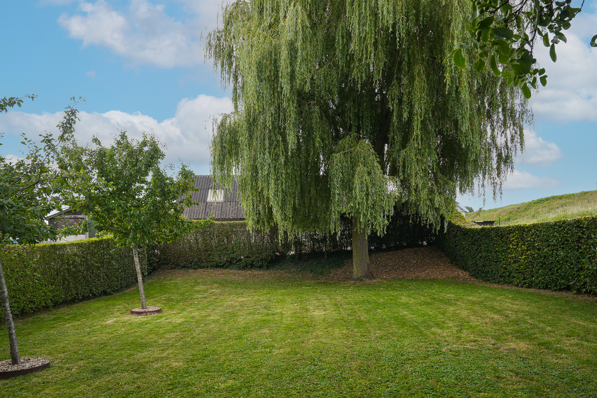 To the left of the driveway stands a solid outbuilding with a tiled roof, including a double carport, garage, and storage for motorcycles and bicycles. The garden has been landscaped for easy maintenance, with large hardwood terraces, transparent stainless-steel balustrades, decorative hydrangea borders, and a lawn with mature planting. The sloping bank along the dike is planted with, among others, periwinkle and barren strawberry.