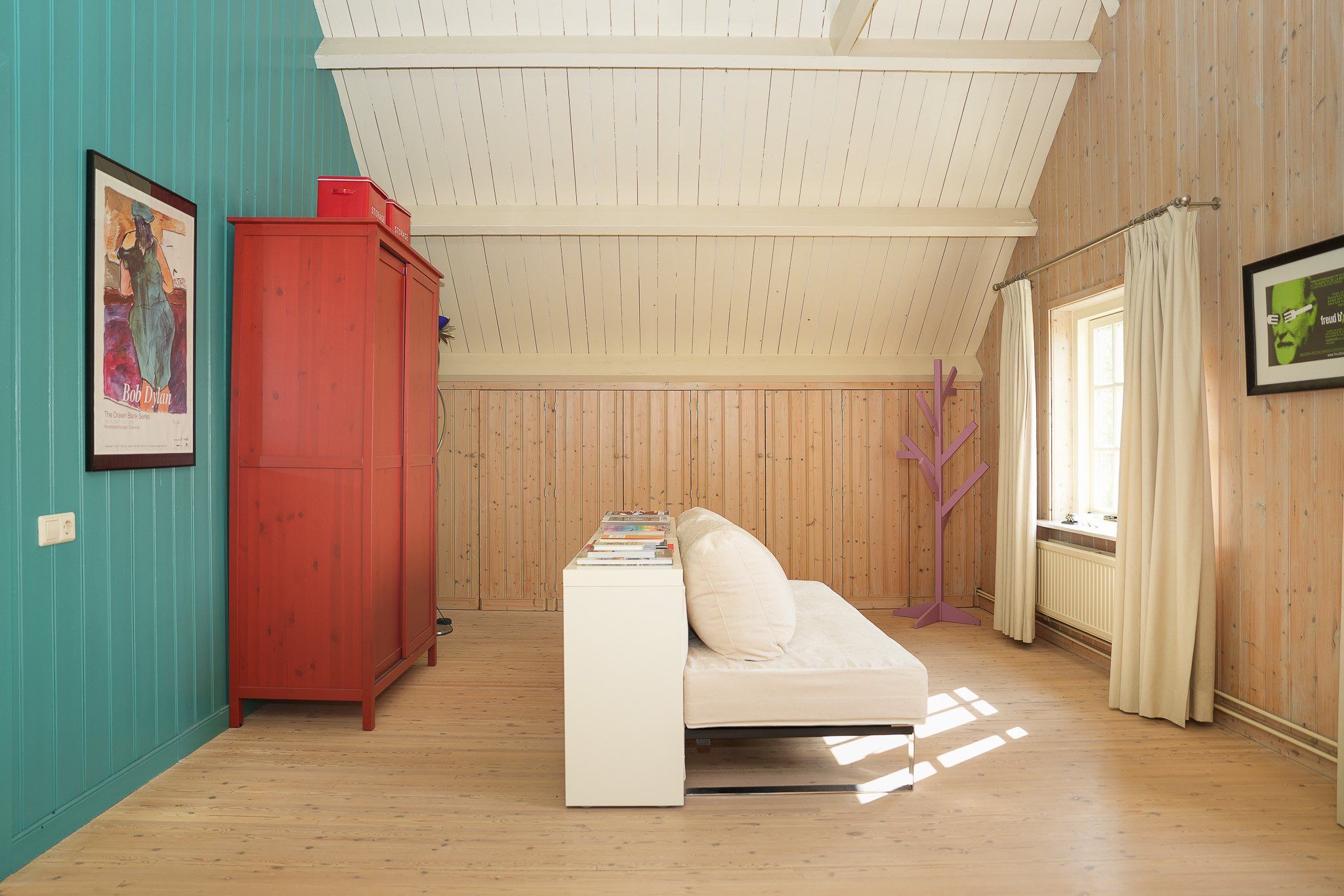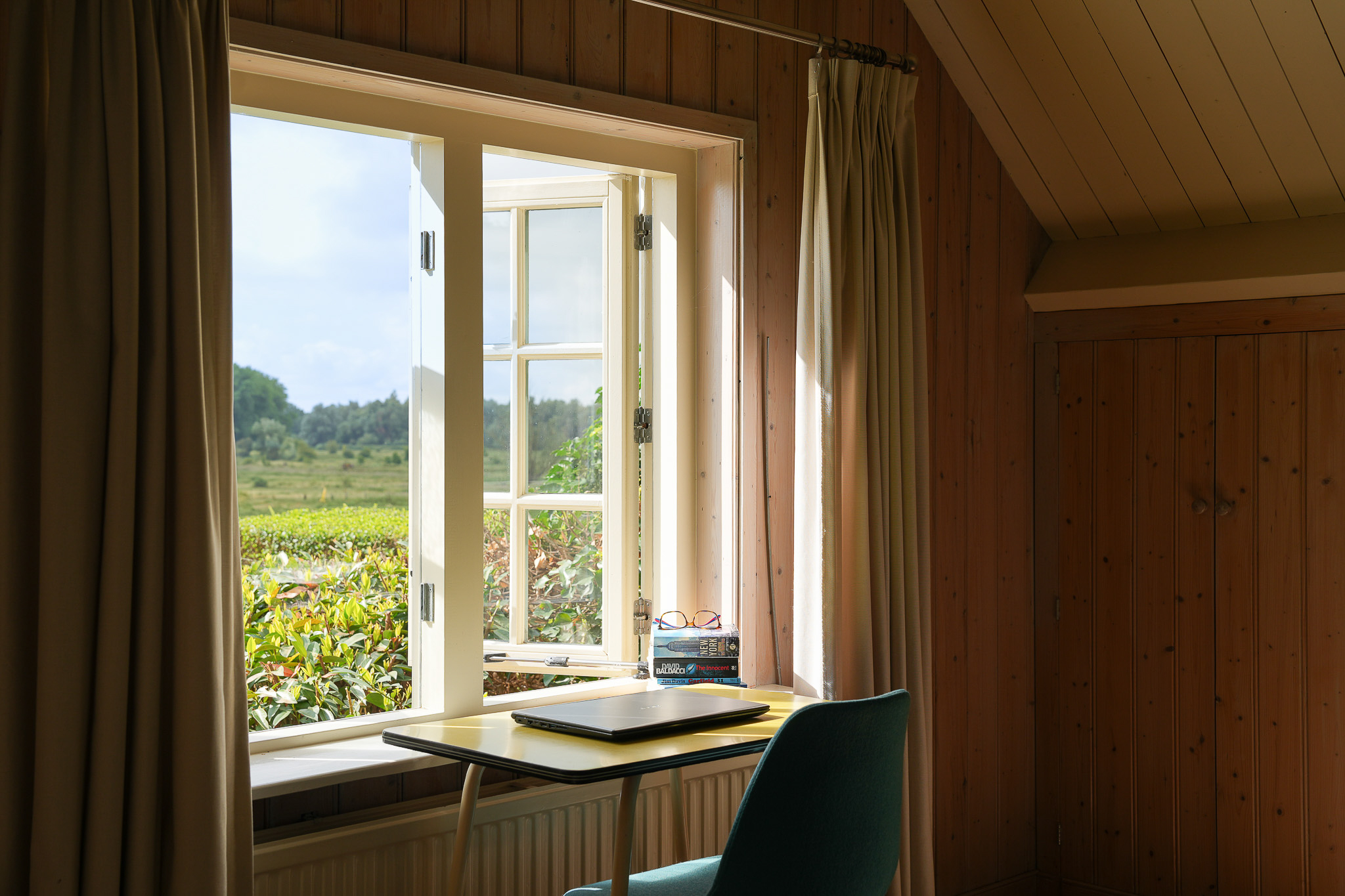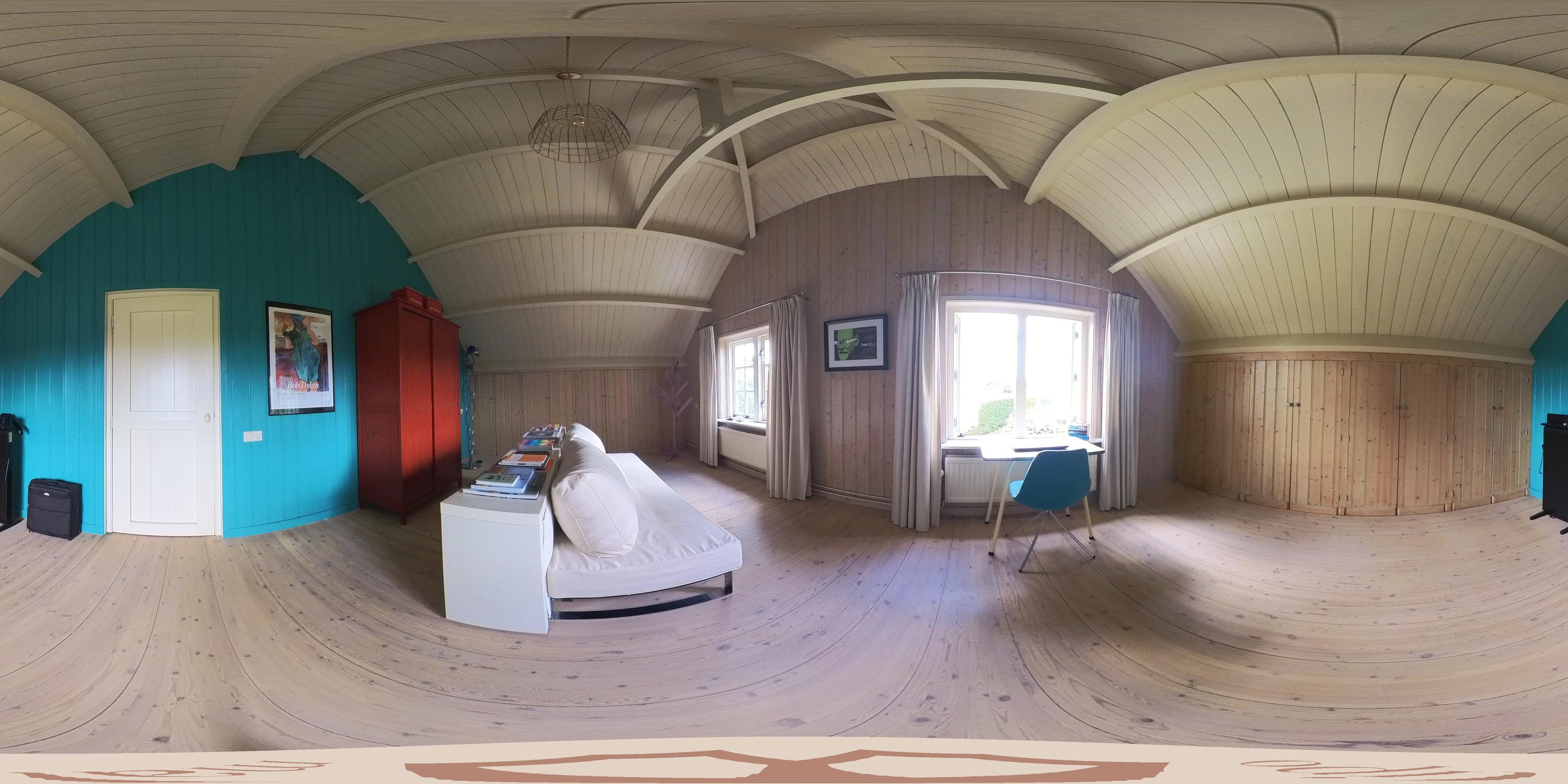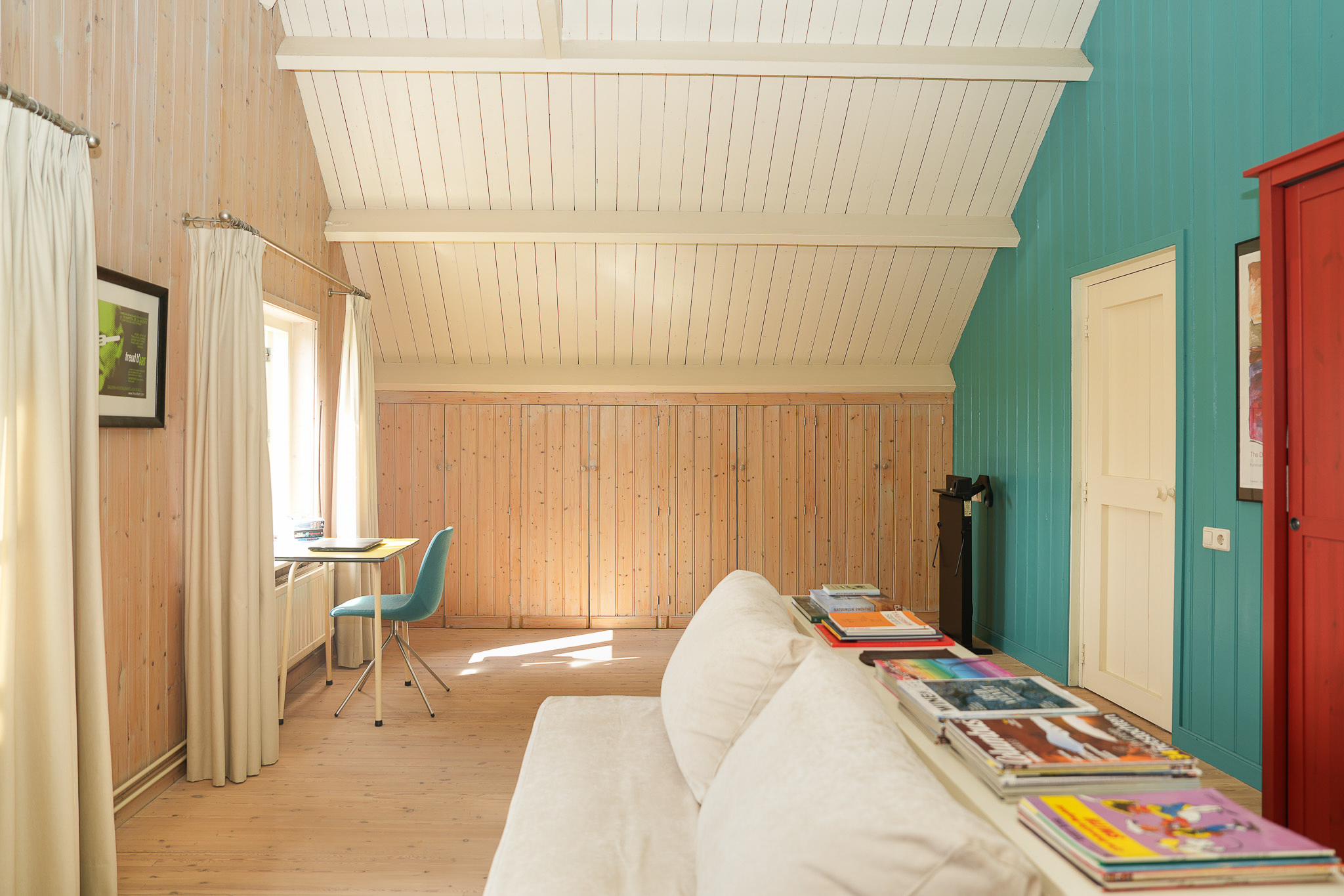 One currently serves as a study; the other makes an ideal guest room thanks to the adjoining shower and toilet. In the study, a hatch leads to a cellar.