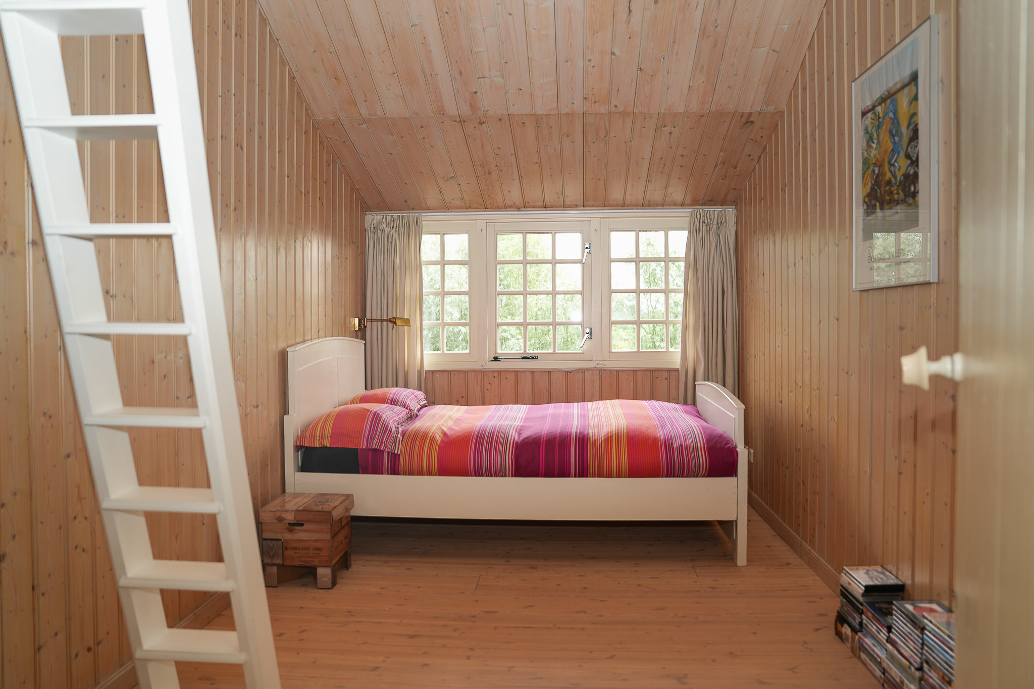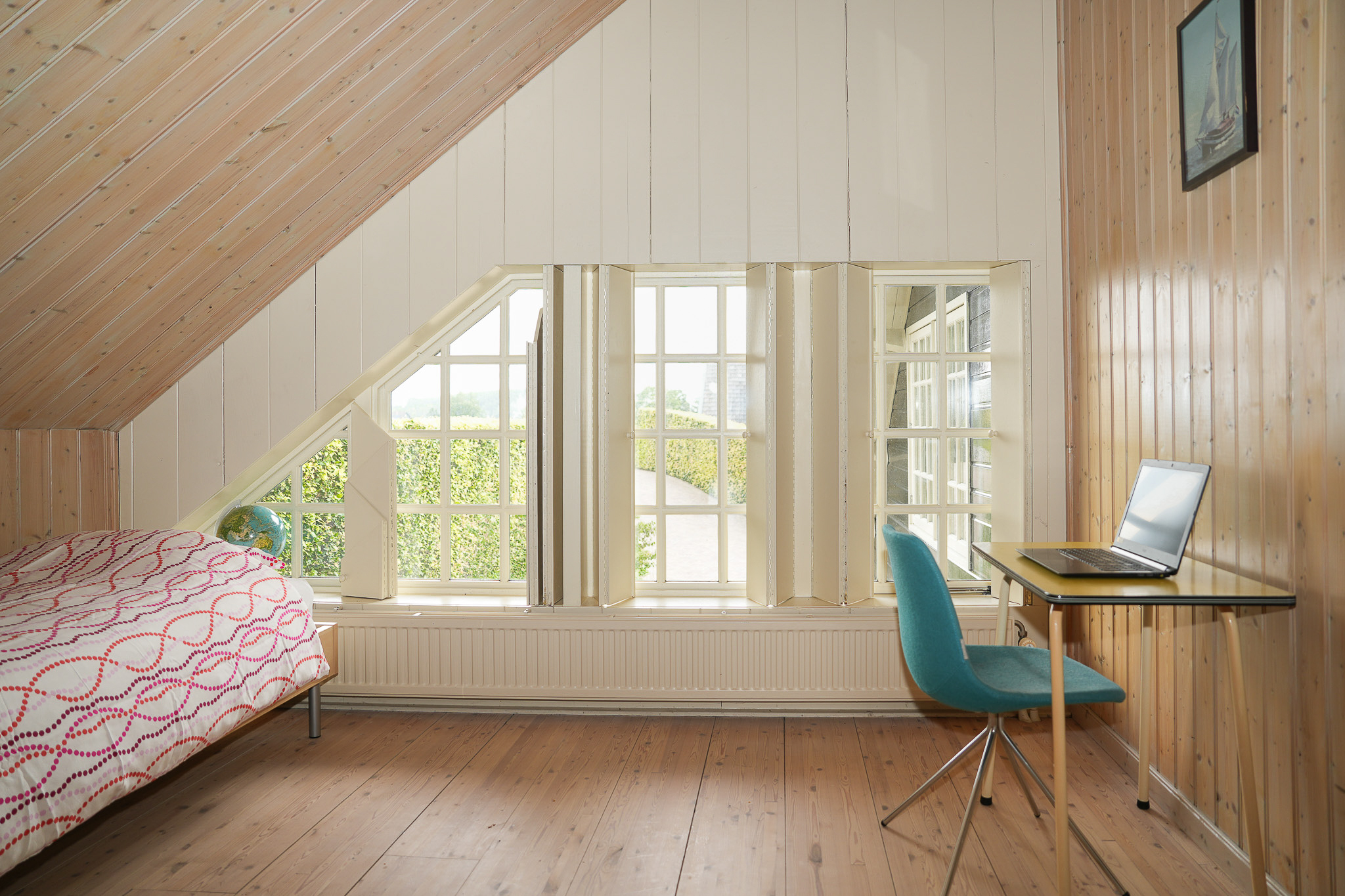 The east-facing bedroom spans the full depth of the house and is fitted with built-in wardrobes under the eaves. The master bedroom opens onto a wide balcony and an adjoining dressing room, currently in use as such but equally suited as an additional study or bathroom.