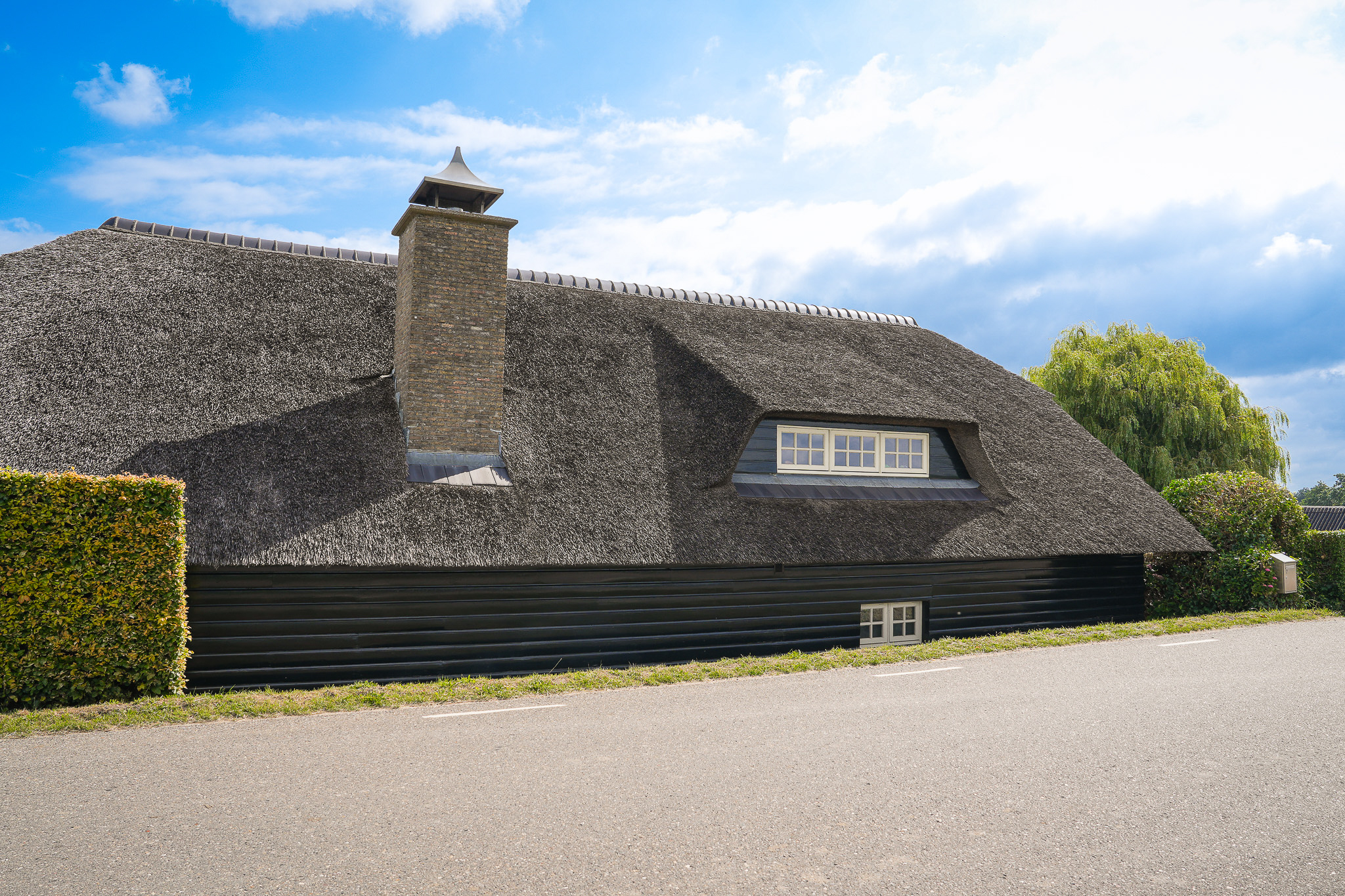 The house is fully insulated and in excellent condition. The thatched roof was completely renewed ten years ago. On the ground floor, beams and trusses have been left exposed, enhancing the warm, rural feel. Upstairs, all rooms are finished with tongue-and-groove boarding and wide floorboards.