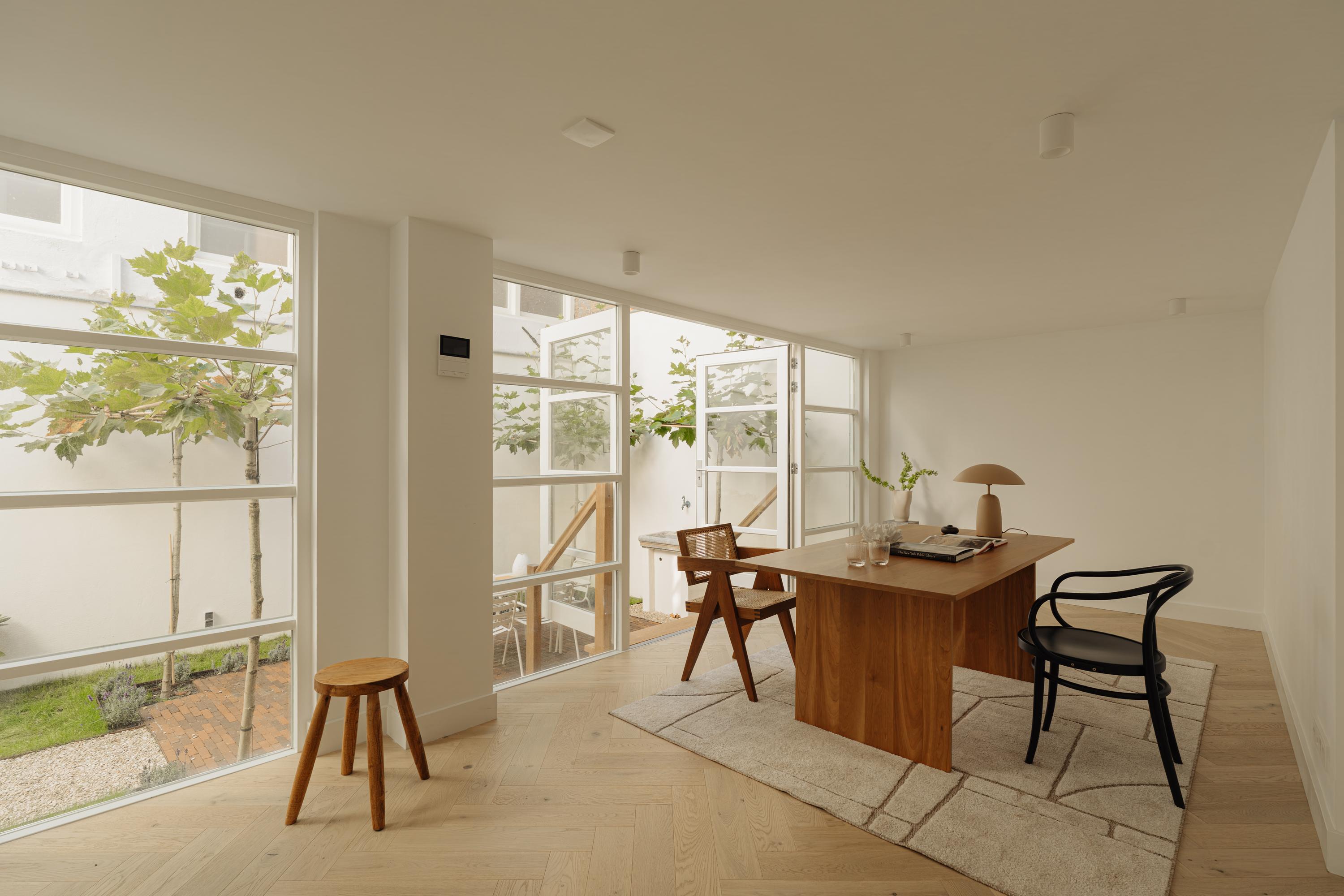 La planta semisótano alberga una cocina y comedor definidos por materiales naturales y mobiliario a medida, realzados con una chimenea y acceso al tranquilo jardín urbano. La funcionalidad y la elegancia se entrelazan en los electrodomésticos de alta gama, la isla de piedra natural y el suelo de roble en espiga. La planta baja elevada introduce un vestíbulo de mármol y un salón con techos superiores a 3,4 metros, vistas al canal y dos chimeneas, fusionando majestuosidad e intimidad de forma armoniosa.