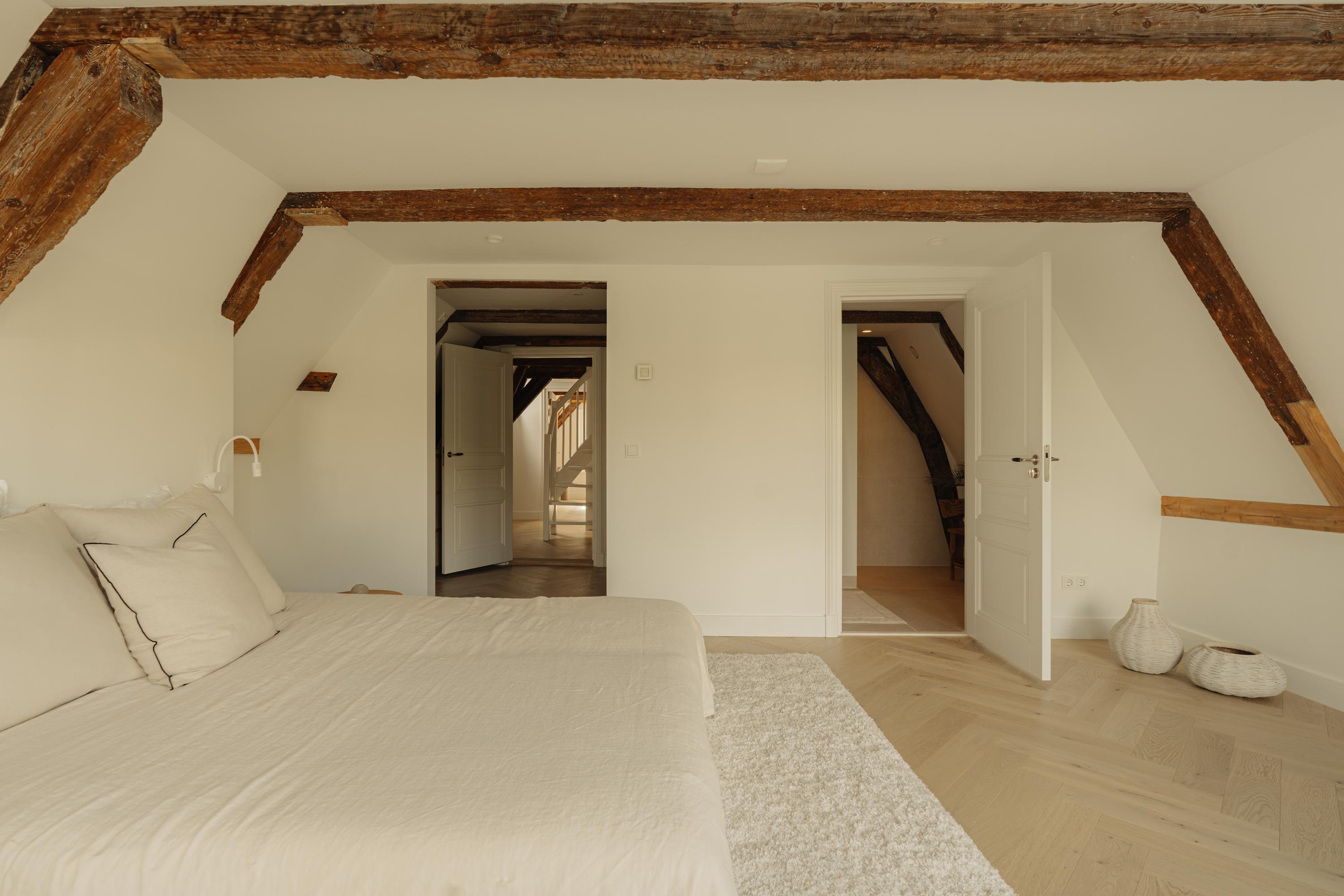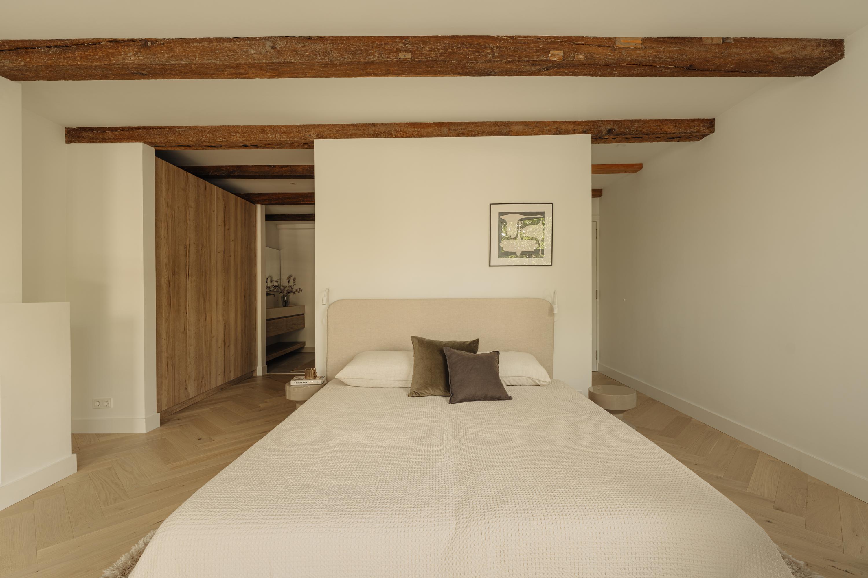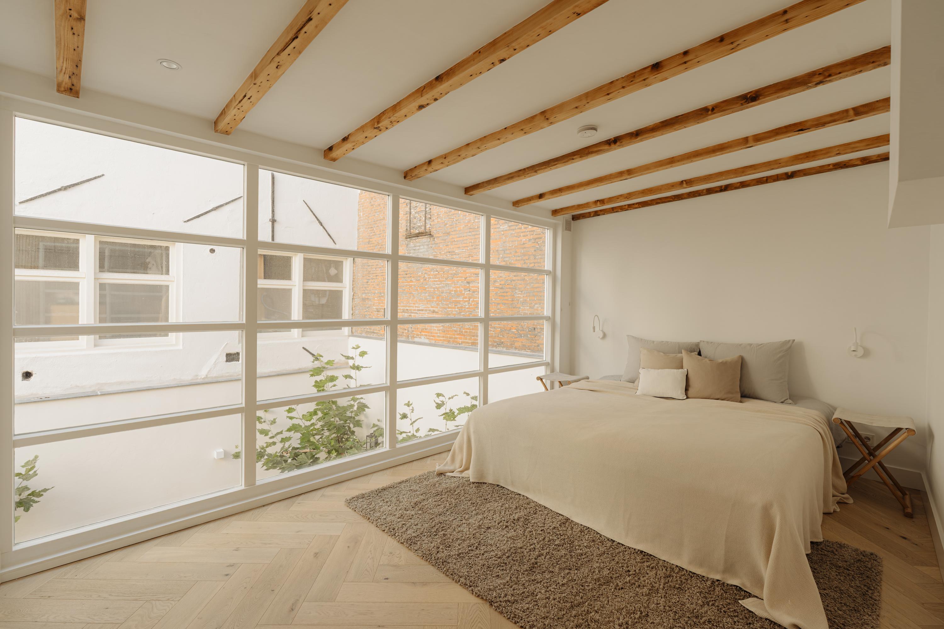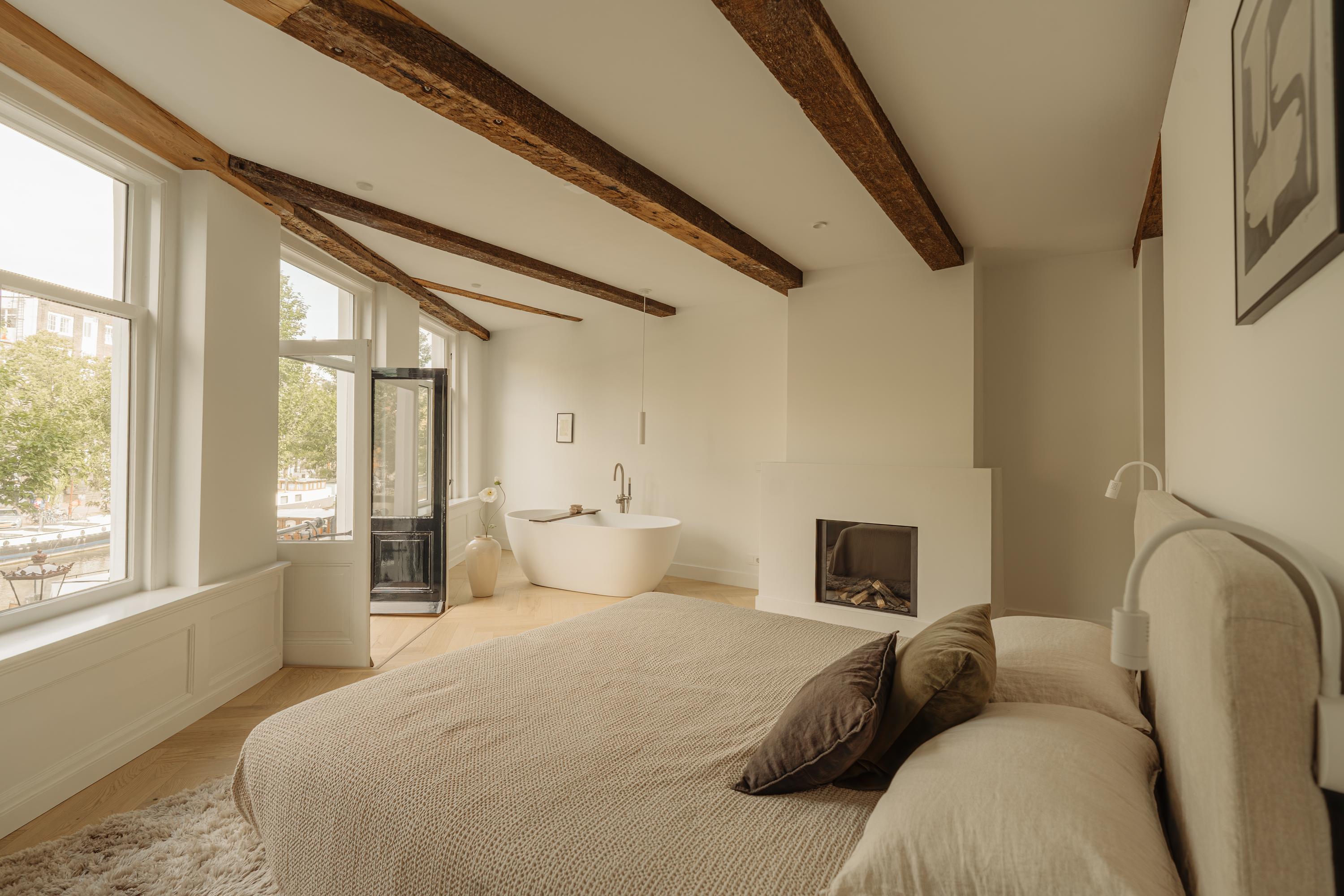 El primer y segundo piso albergan una serie de dormitorios, todos acabados con materiales serenos y armarios a medida. La suite principal da al canal, incorpora un balcón francés, bañera exenta y un baño en suite elaborado en piedra natural y madera. Otros dormitorios miran a los jardines interiores, adecuados para invitados o para una distribución flexible. La tercera planta incluye dos habitaciones adicionales; la trasera permite el acceso a la azotea con vistas al skyline histórico de la ciudad.