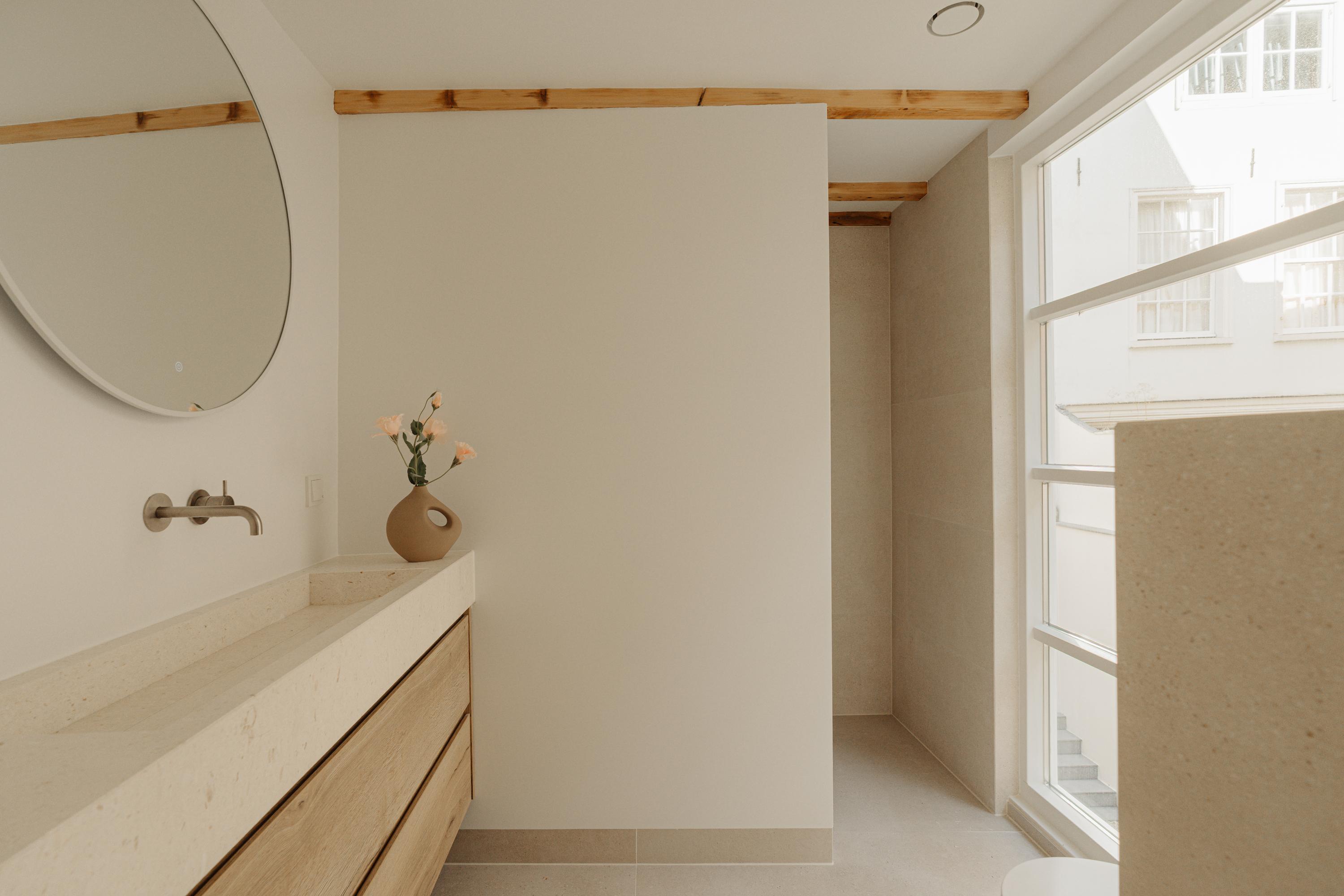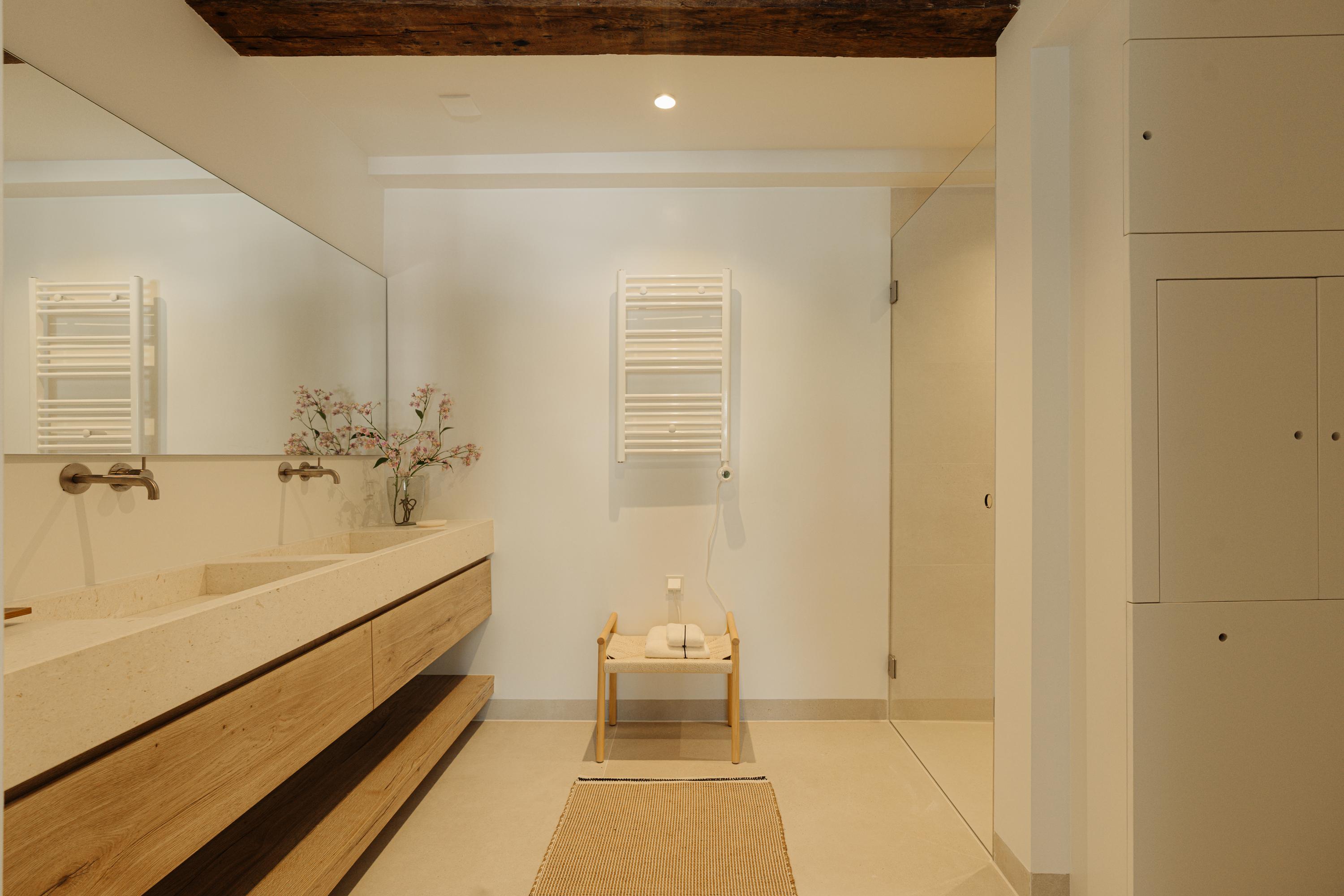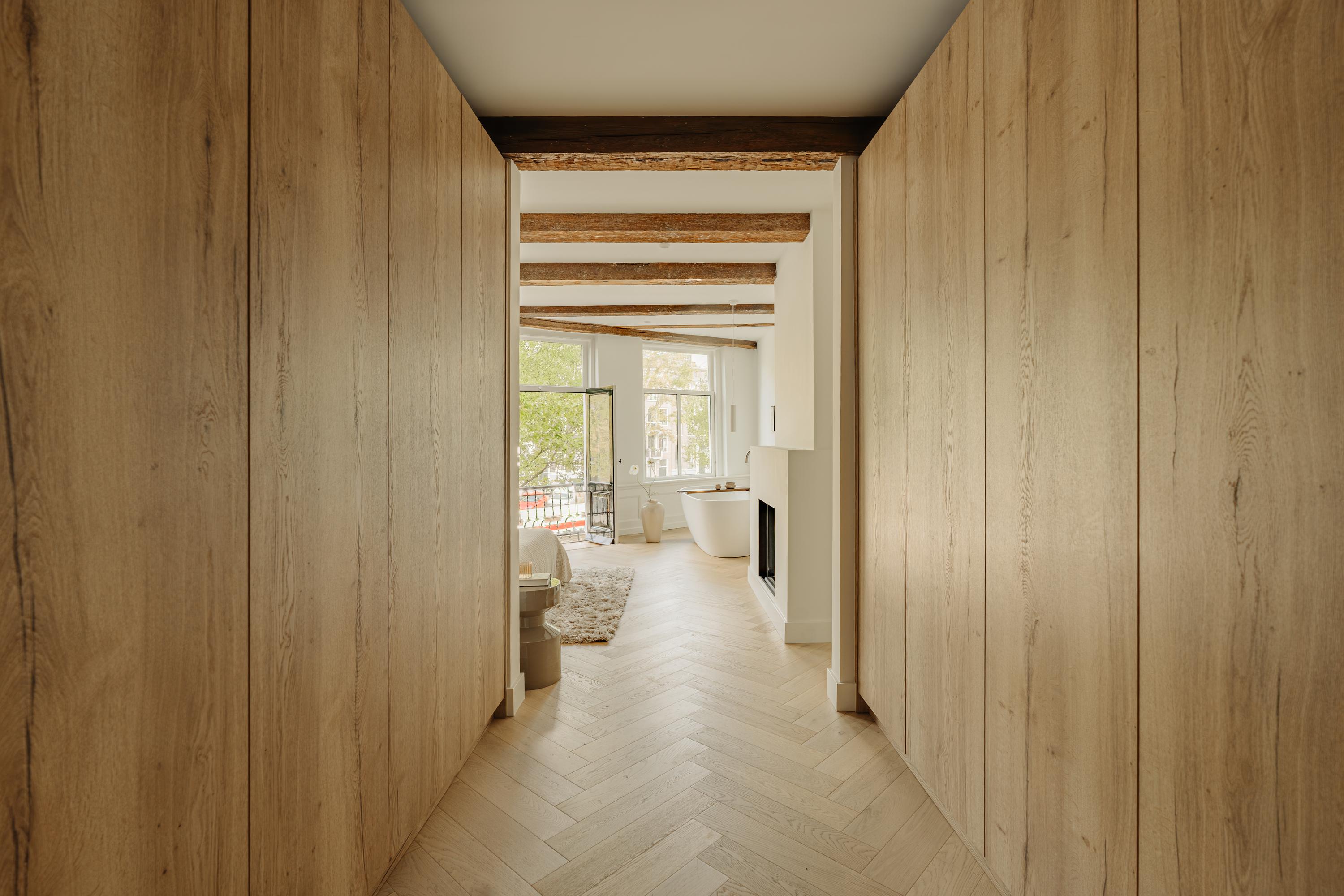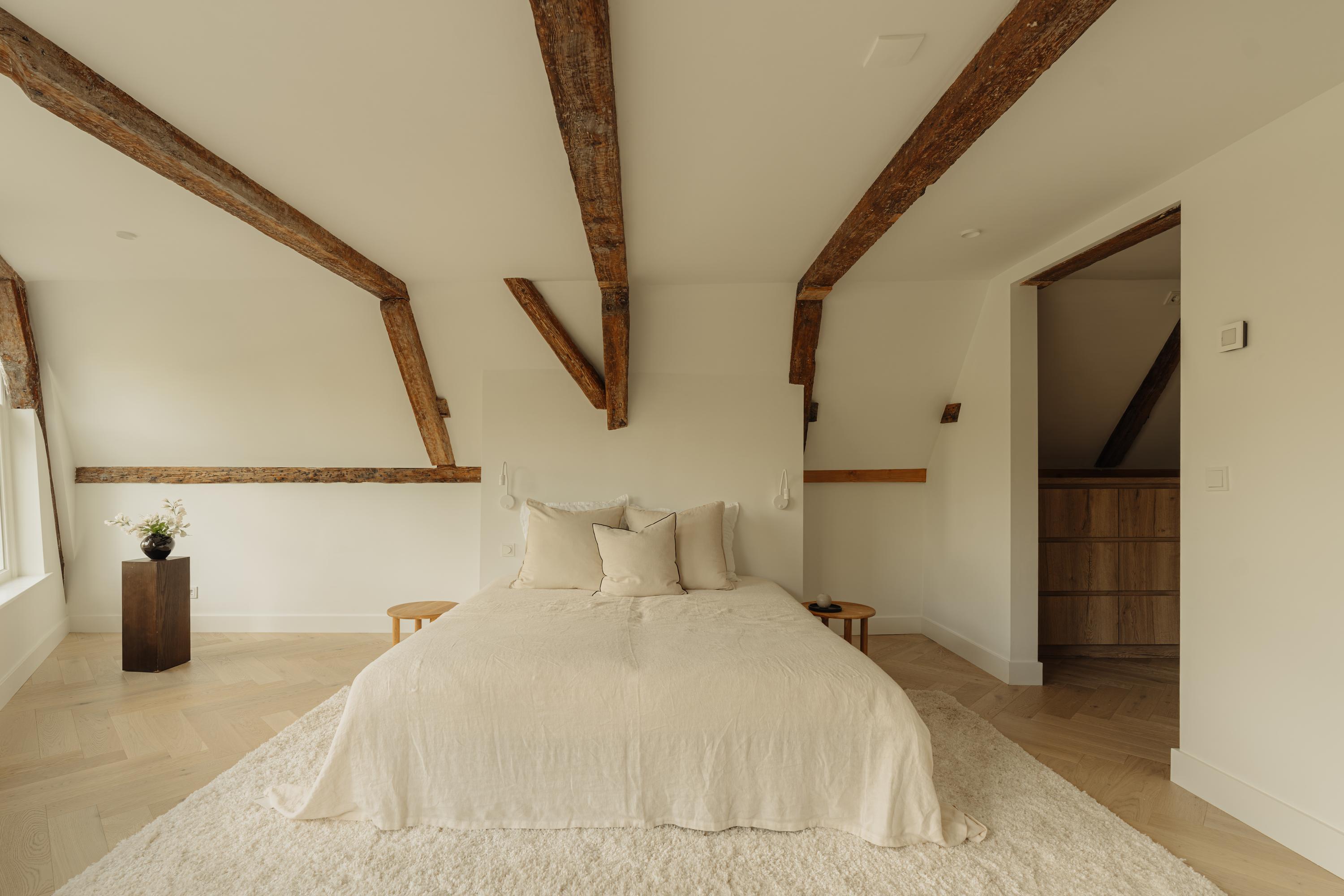 El primer y segundo piso albergan una serie de dormitorios, todos acabados con materiales serenos y armarios a medida. La suite principal da al canal, incorpora un balcón francés, bañera exenta y un baño en suite elaborado en piedra natural y madera. Otros dormitorios miran a los jardines interiores, adecuados para invitados o para una distribución flexible. La tercera planta incluye dos habitaciones adicionales; la trasera permite el acceso a la azotea con vistas al skyline histórico de la ciudad.