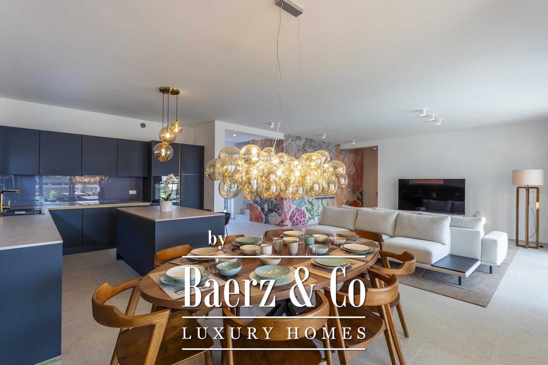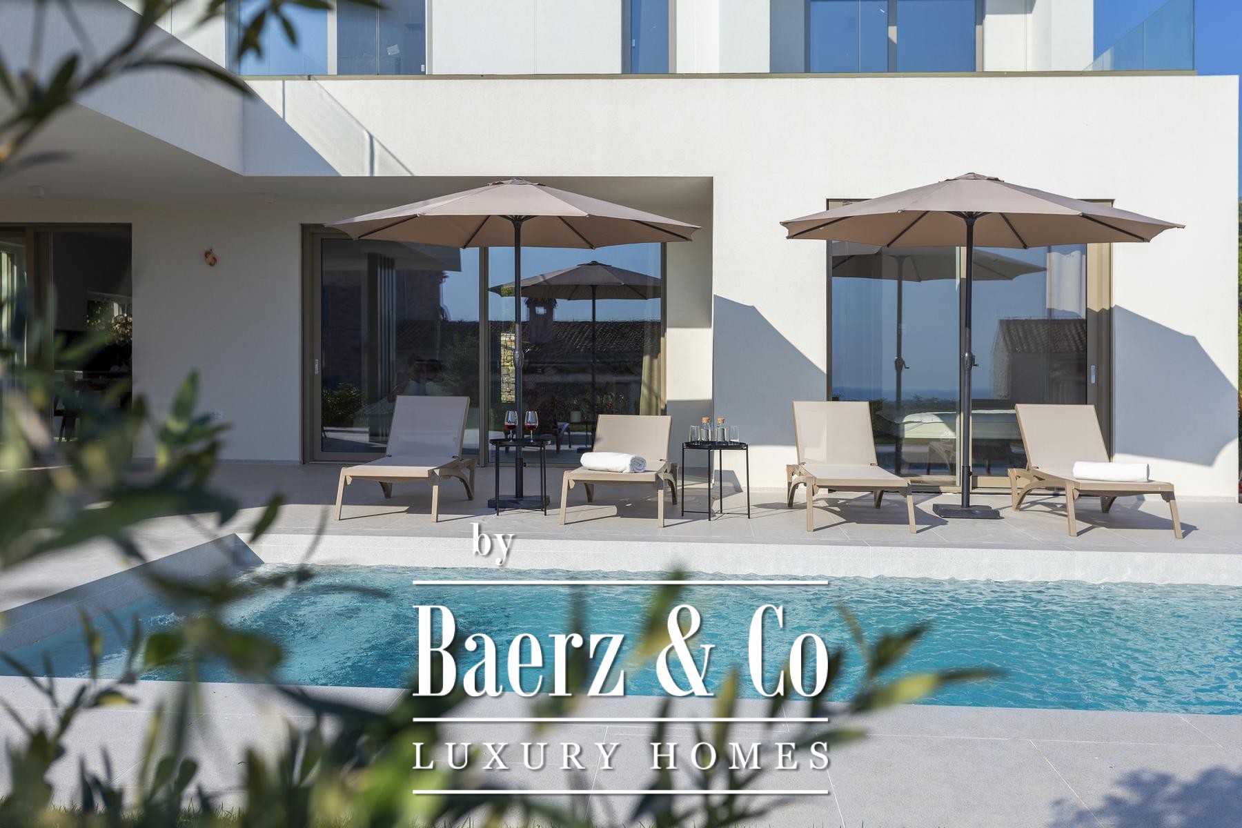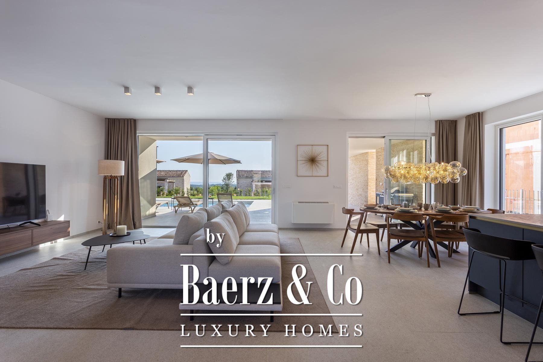 La zona de estar de planta abierta integra un comedor con una cocina totalmente equipada, dotada de electrodomésticos de alta gama de fabricantes internacionales reconocidos. El mobiliario de diseño del salón ha sido realizado a medida para la villa, proporcionando confort y vistas directas al mar. Los grandes ventanales de suelo a techo permiten la entrada de luz natural y conectan con una generosa terraza cubierta, un espacio perfecto para el entretenimiento, rodeado de jardines cuidados, una piscina de 30 m² y nuevas vistas al mar. Una barbacoa exterior amplía la experiencia al aire libre.