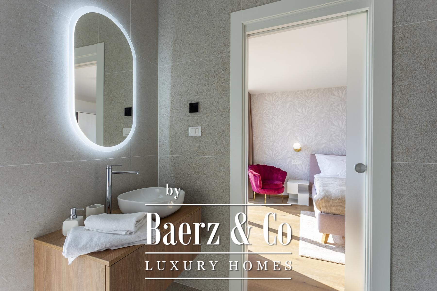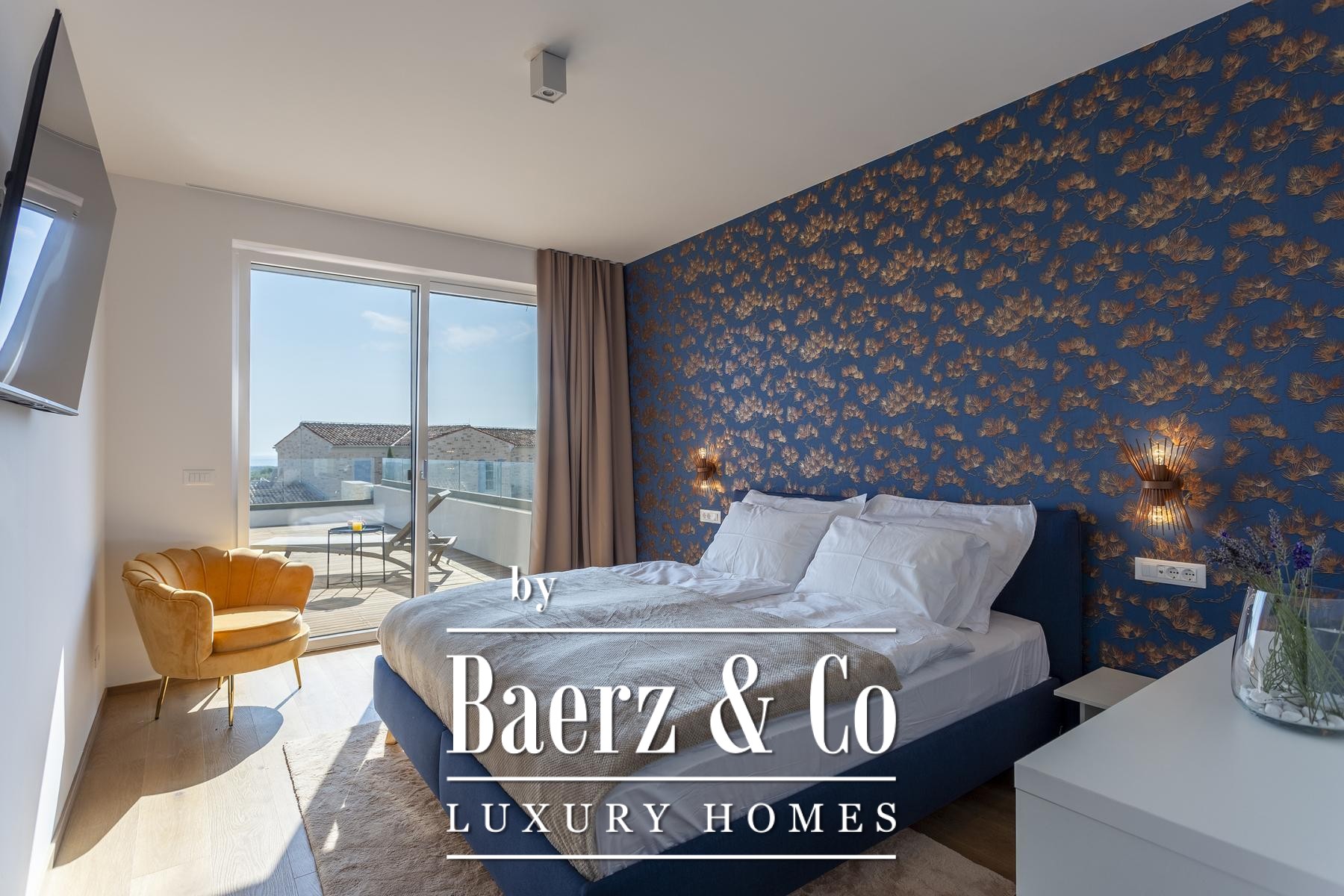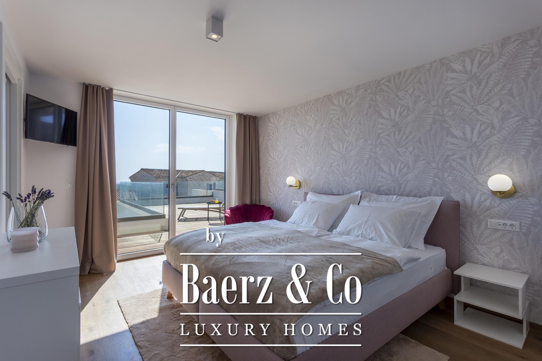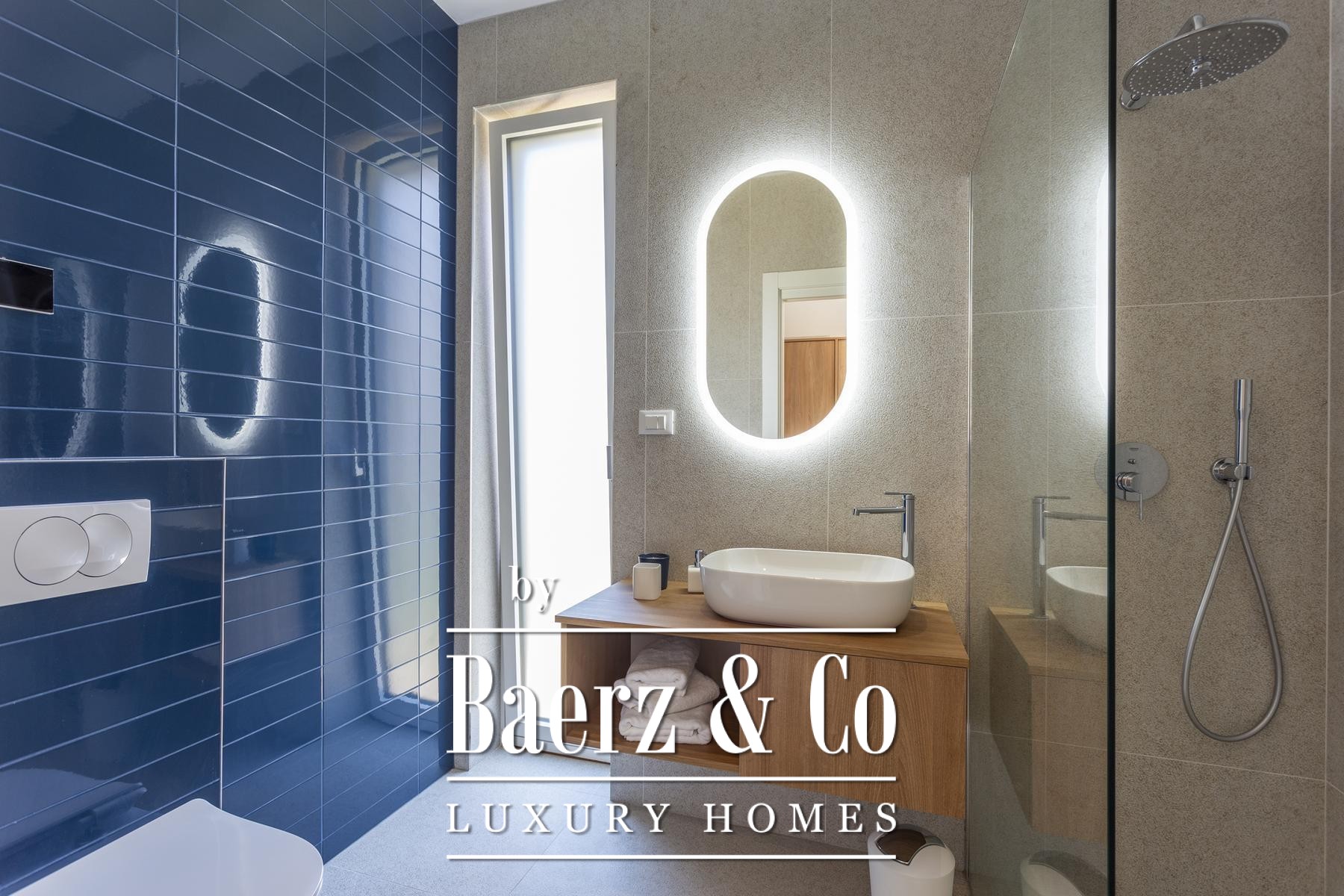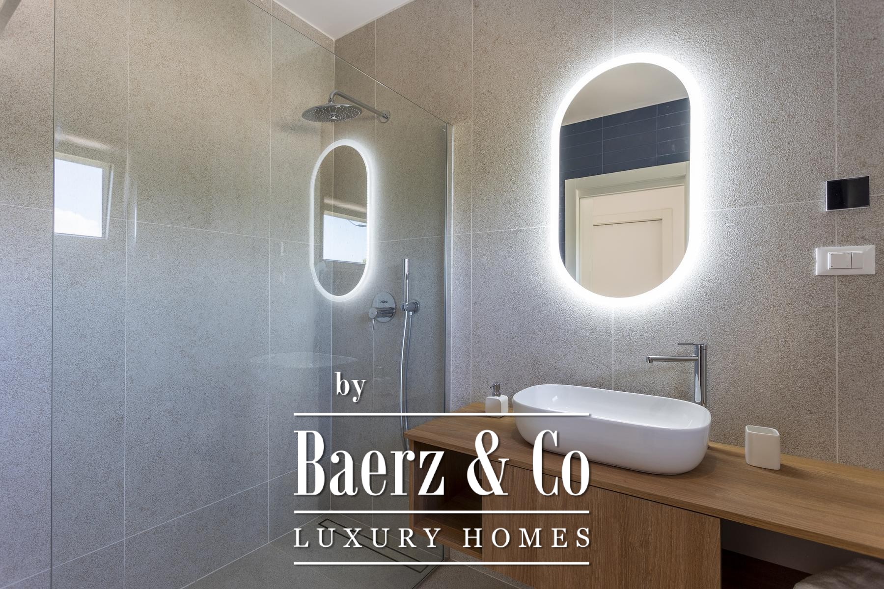 Las zonas privadas en planta baja incluyen un dormitorio con baño en suite, una sala técnica y un trastero. Al subir por la escalera interior, la primera planta alberga tres dormitorios adicionales, todos en suite y con acceso a una amplia terraza con vistas al Adriático, preparada para instalar un jacuzzi en el futuro. La calefacción por suelo radiante, el parquet de calidad y la cerámica de alta gama enriquecen el entorno, complementados por aire acondicionado en todas las estancias.