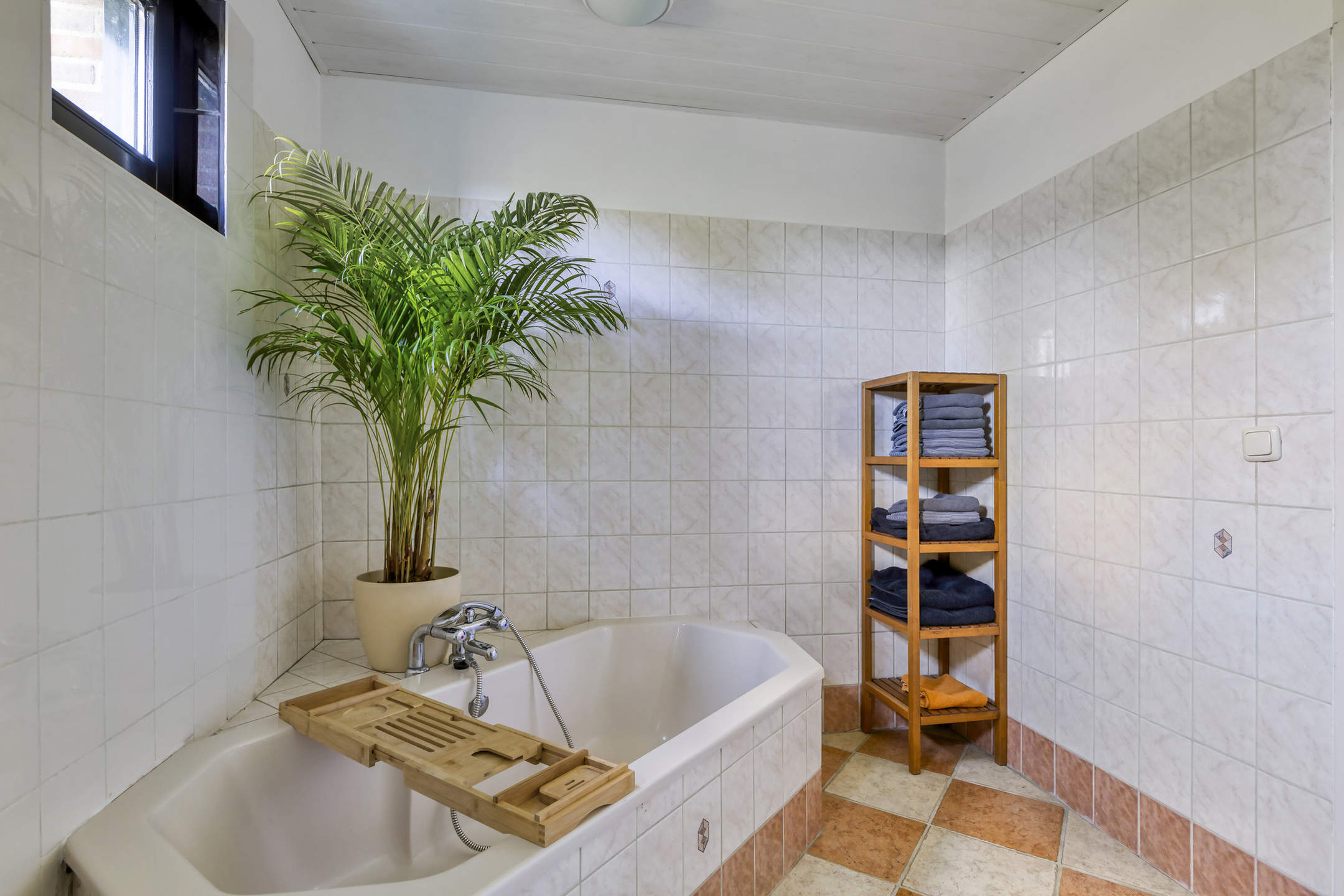 betegelde badkamer, voorzien van een ligbad, douchecabine en een badkamermeubel met een wastafel;