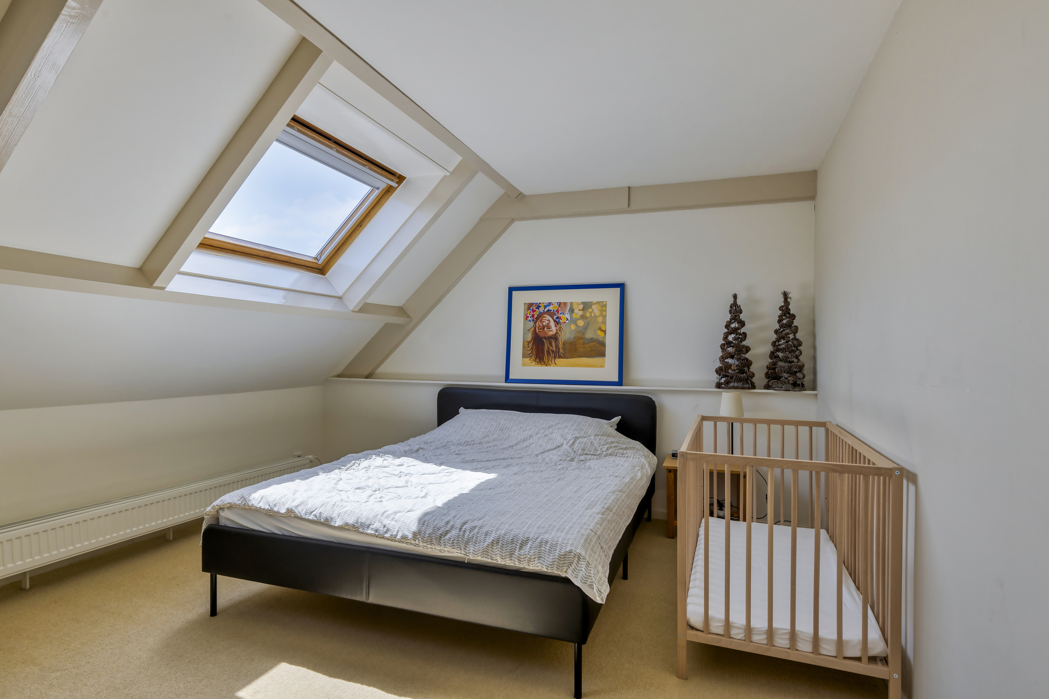 slaapkamer rechts midden, met 2-tal dakramen, wandafwerking stucwerk, vloer afgewerkt met tapijt, plafond afgewerkt met stucwerk;
