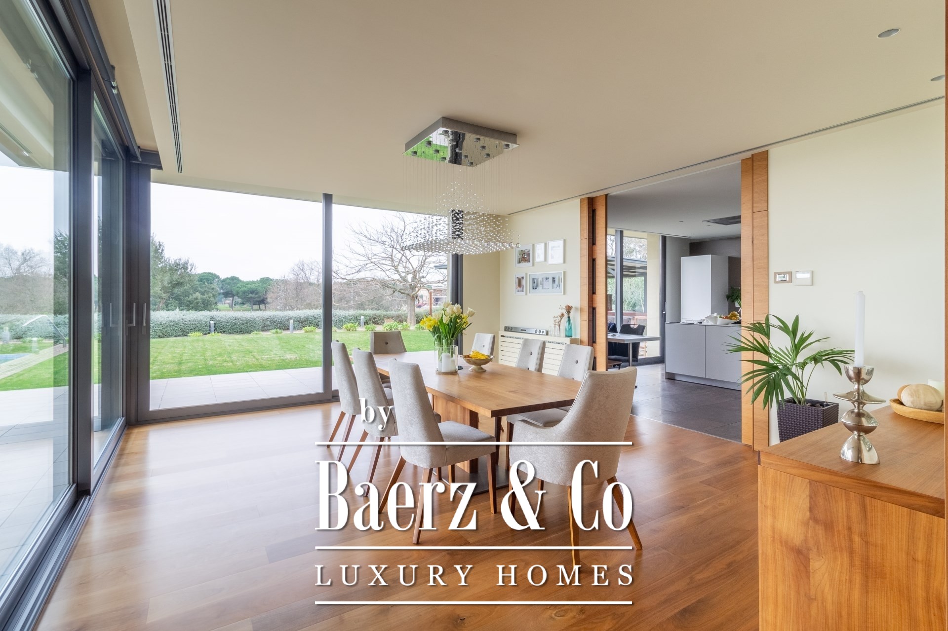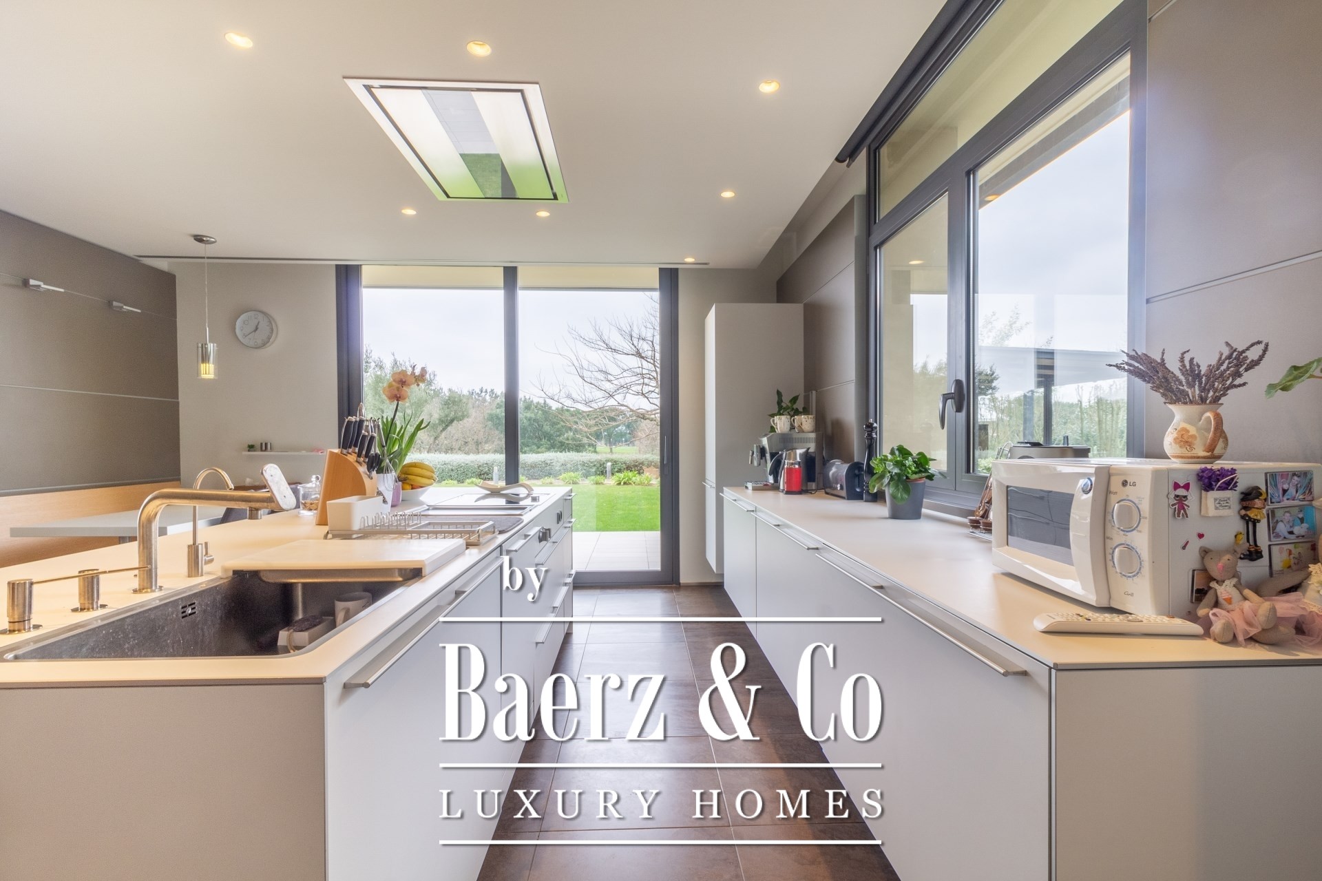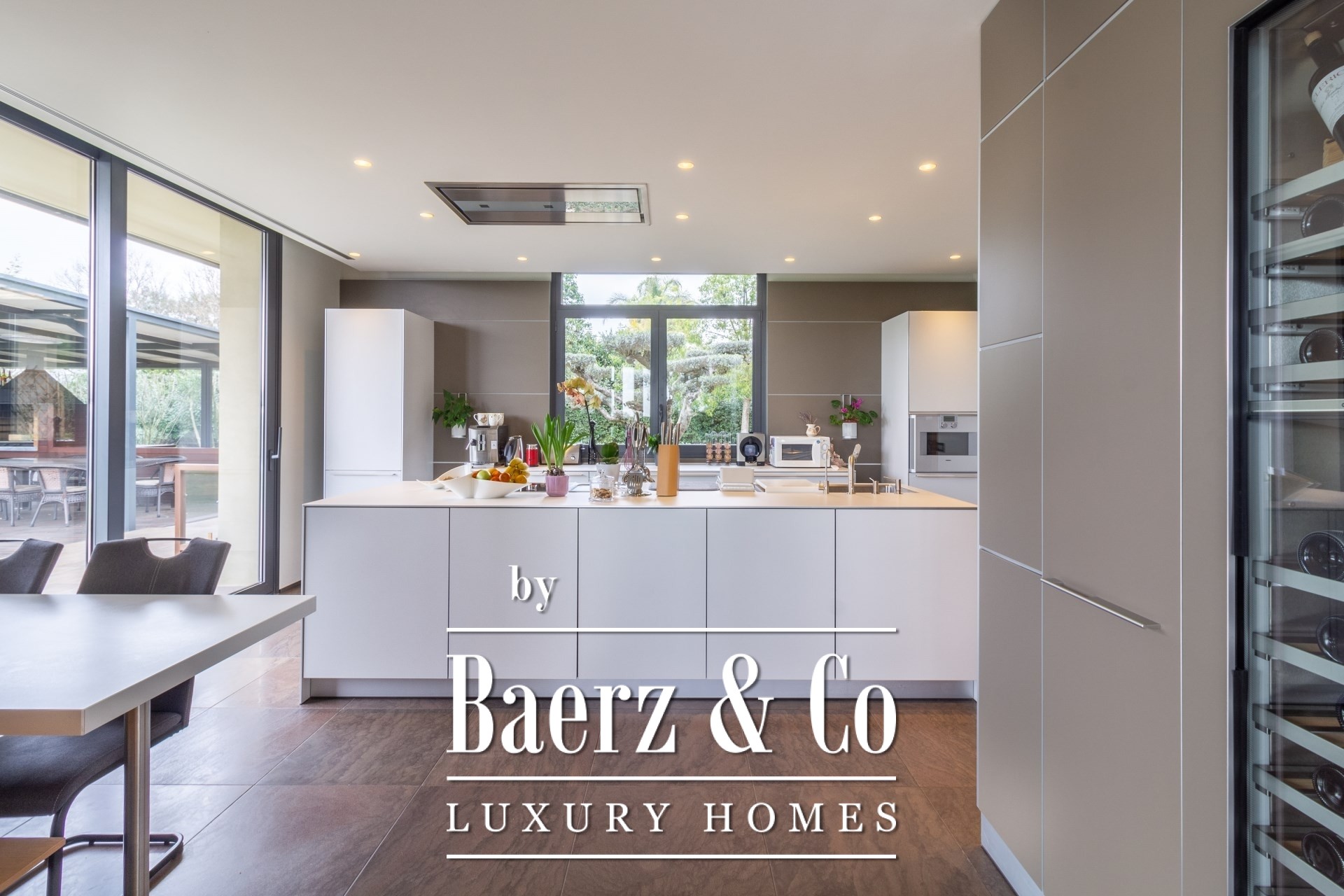 Dès l’entrée par le vaste hall, le rez-de-chaussée s’ouvre sur un grand salon salle à manger baigné de lumière naturelle, avec de larges vues sur le jardin et la piscine. Un coin lecture avec cheminée invite à la détente. La cuisine est remarquable par ses équipements haut de gamme et ses finitions immaculées, pensée pour une précision culinaire. Deux chambres en suite au rez-de-chaussée préservent l’intimité et la facilité de vie, complétées par une salle de bains invités et un bureau séparé.