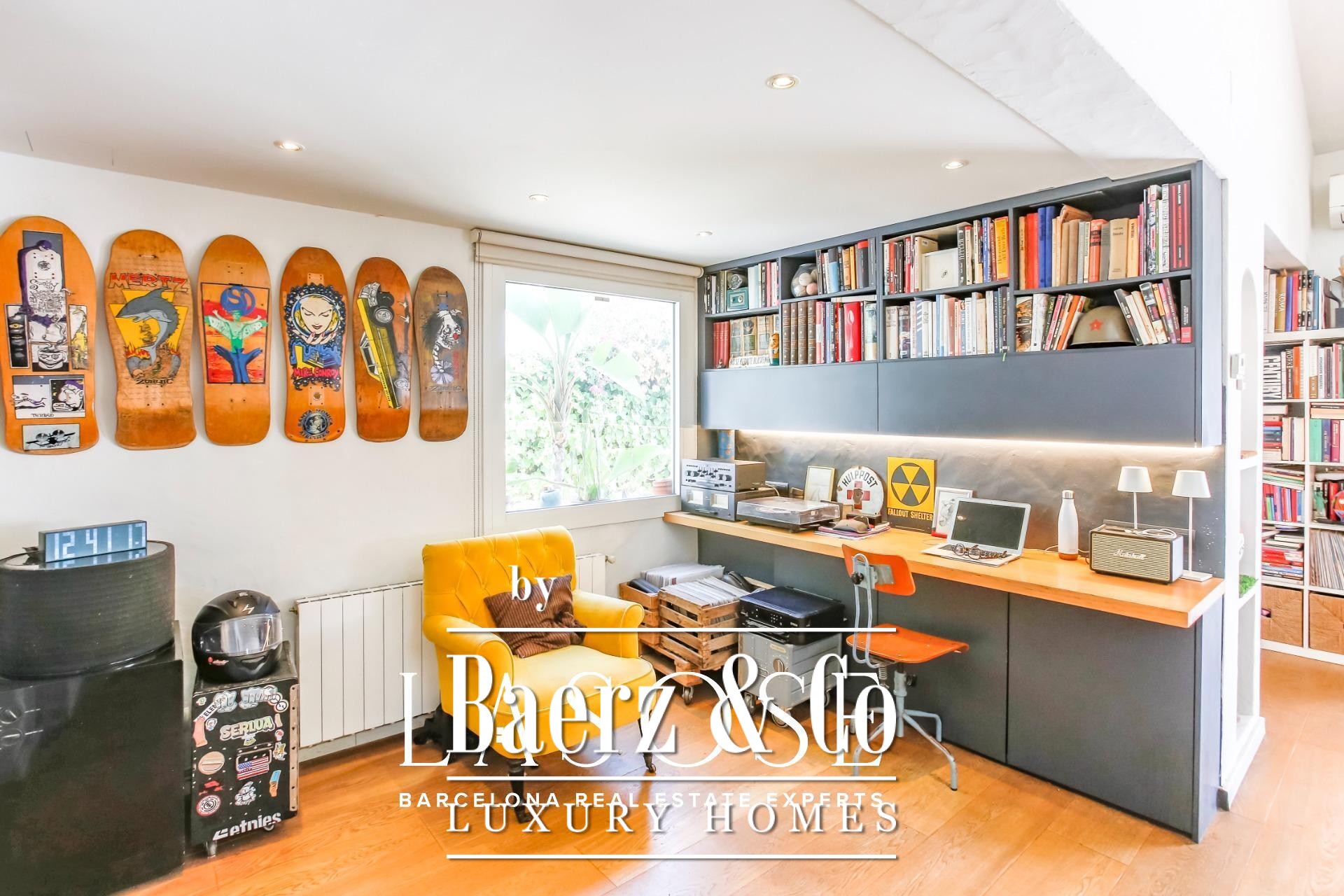 À l’intérieur, l’organisation des espaces offre un rythme harmonieux. Le séjour élégant avec cheminée s’ouvre directement sur le jardin, tandis que la cuisine entièrement équipée avec plan de travail central donne accès à un patio privé et à la zone de stationnement. Au rez-de-chaussée, une suite d’amis ou un bureau complète la flexibilité de vie, alors que l’étage accueille trois lumineuses chambres doubles, chacune profitant de vues sur le jardin et de plafonds à double hauteur. Partout, les finitions soignées et les tons neutres soulignent l’élégance naturelle de l’architecture.