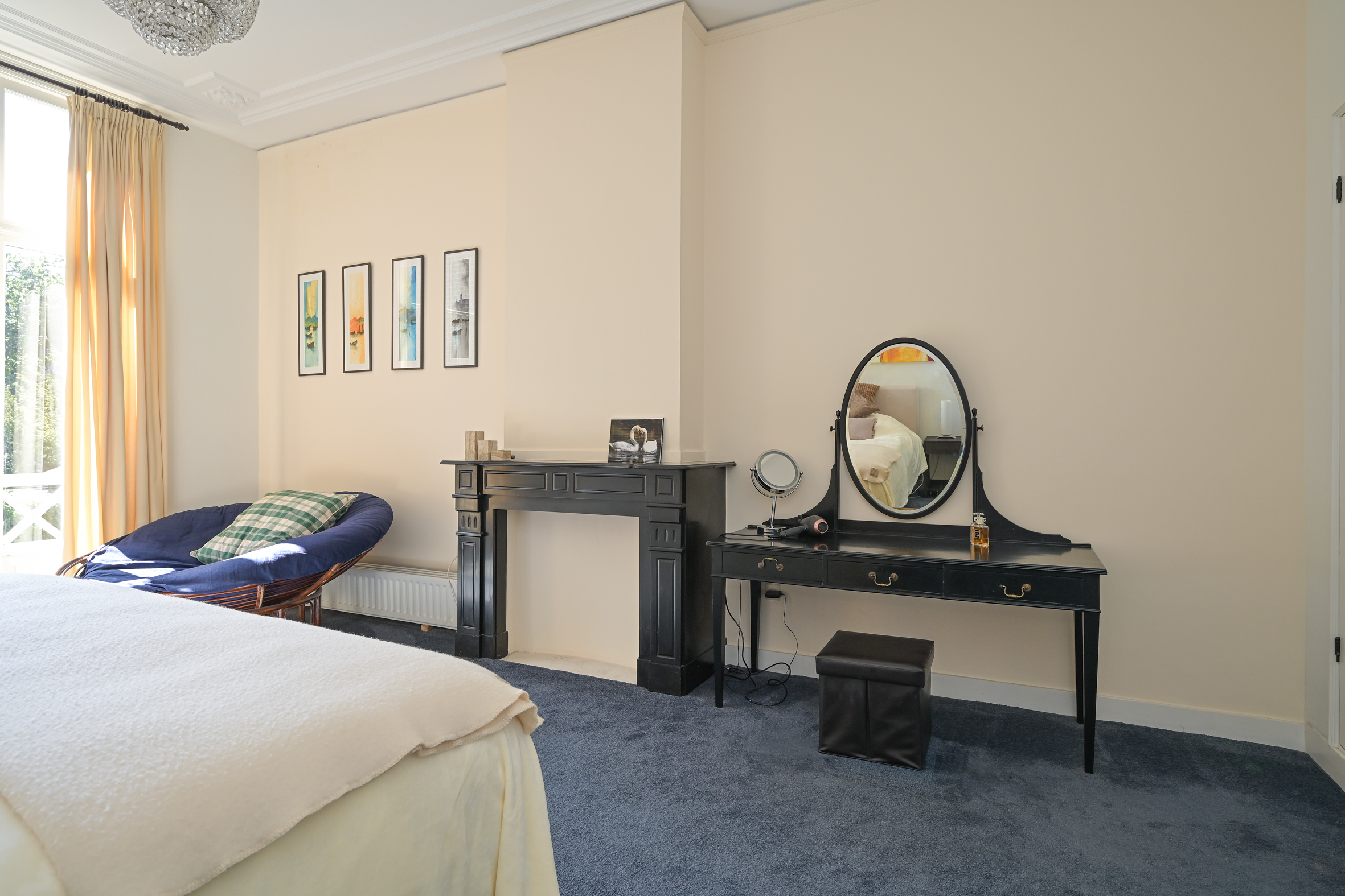 De fraaie trap leidt naar de overloop met moderne wc met fonteintje, de voorkamer biedt vrij zicht en heeft een fraaie parketvloer, hoog plafond met lijstwerk, marmeren schouw en ingebouwde kasten. De voorzijkamer is thans in gebruik als inloopgarderobekamer maar kan ook als studeerkamer of extra slaapkamer fungeren. De achterkamer heeft eveneens ingebouwde kasten, een fraai plafond en marmeren schouw en biedt enerzijds toegang tot het ruime achterbalkon en anderzijds toegang tot de moderne badkamer met design ligbad, dito wastafels met ombouw en inloopdouche. De badkamer is voorzien van elektrische vloerverwarming en is ook vanaf de overloop bereikbaar.