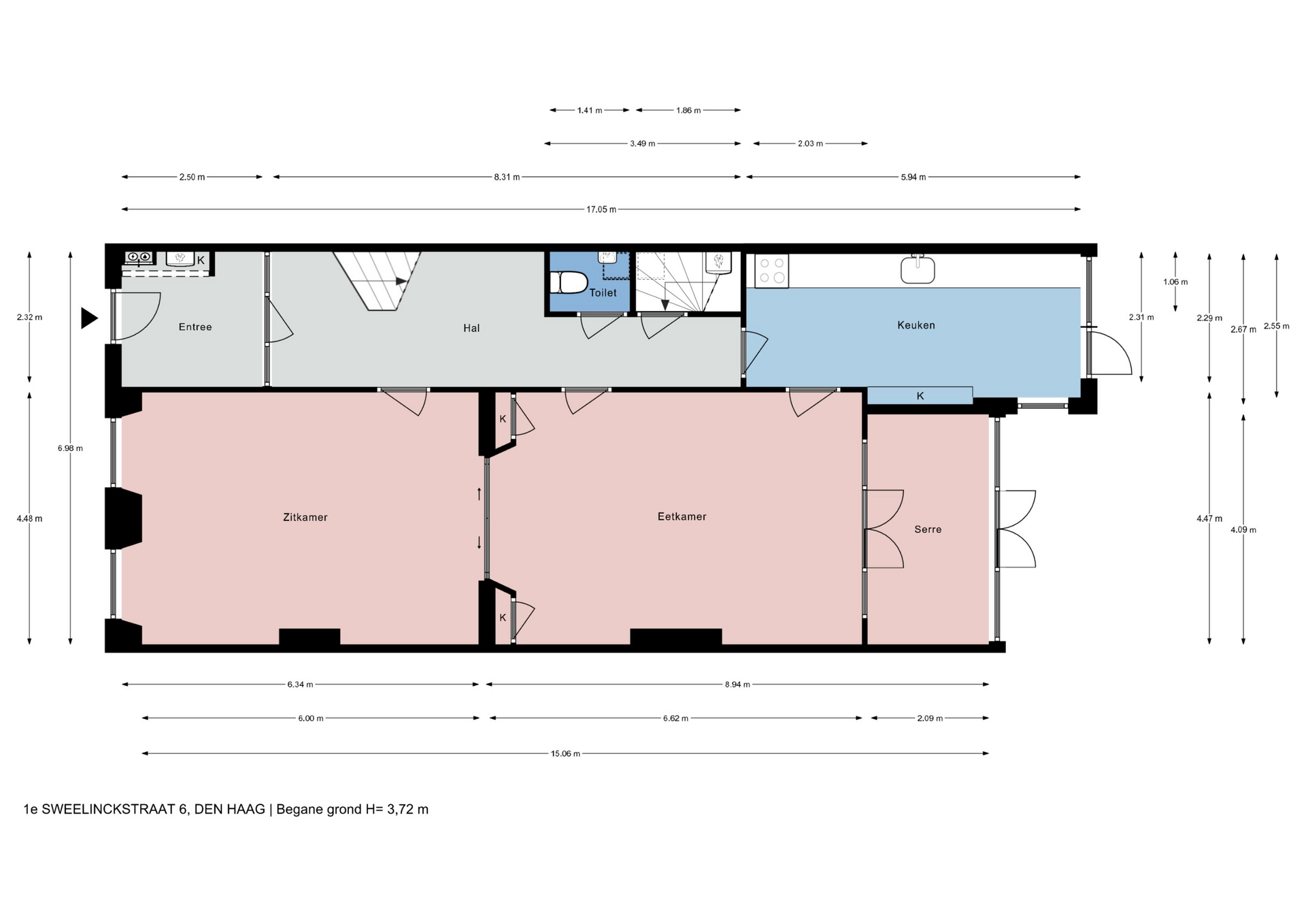 Indeling: entree, ruime hal met marmeren vloeren, tochtseparatie, brede gang met marmeren vloerdelen, fraai trappenhuis met spijltjes, open ruimte onder de trap, moderne wc met fonteintje. Royale brede kamers met marmeren schouwen (met in de voorkamer een houthaard), hoge geornamenteerde plafonds, suite separatie met schuifdeuren en vaste kasten en fraaie parketvloeren. De achterkamer heeft dubbele deuren naar de serrekamer en is eveneens in verbinding met de royale moderne keuken voorzien van (inbouw)apparatuur aan de ene zijde en een prachtige originele ingebouwde servieskast aan de andere zijde. Zowel de keuken als de serrekamer bieden toegang tot de ruime zonnige achtertuin met diverse schuurtjes en een achteringang (afsluitbare toegangsdeur aan de straat). Onder de keuken ligt een praktische kelderruimte van ca. 14 m2 en 1,81m hoog.
