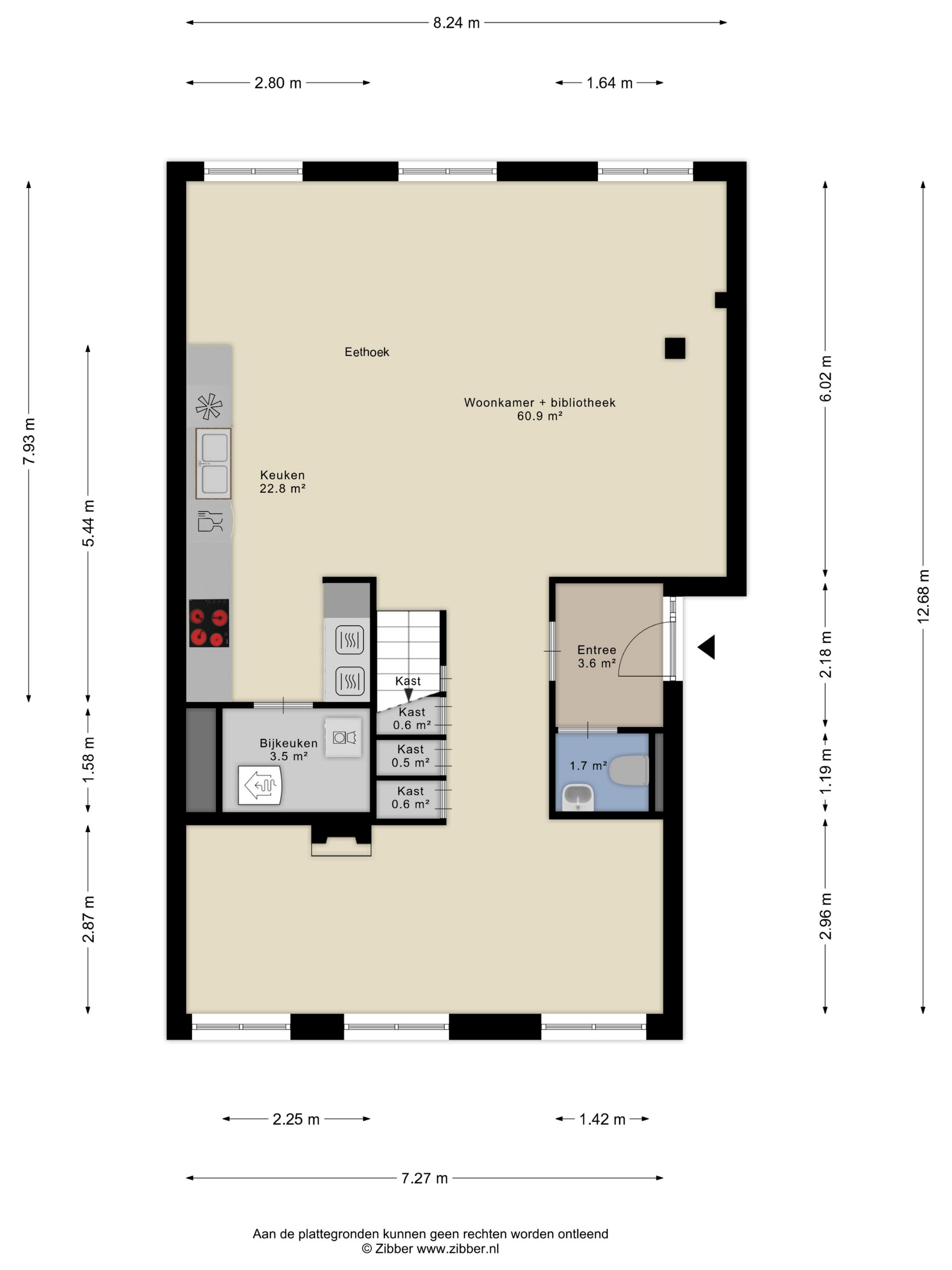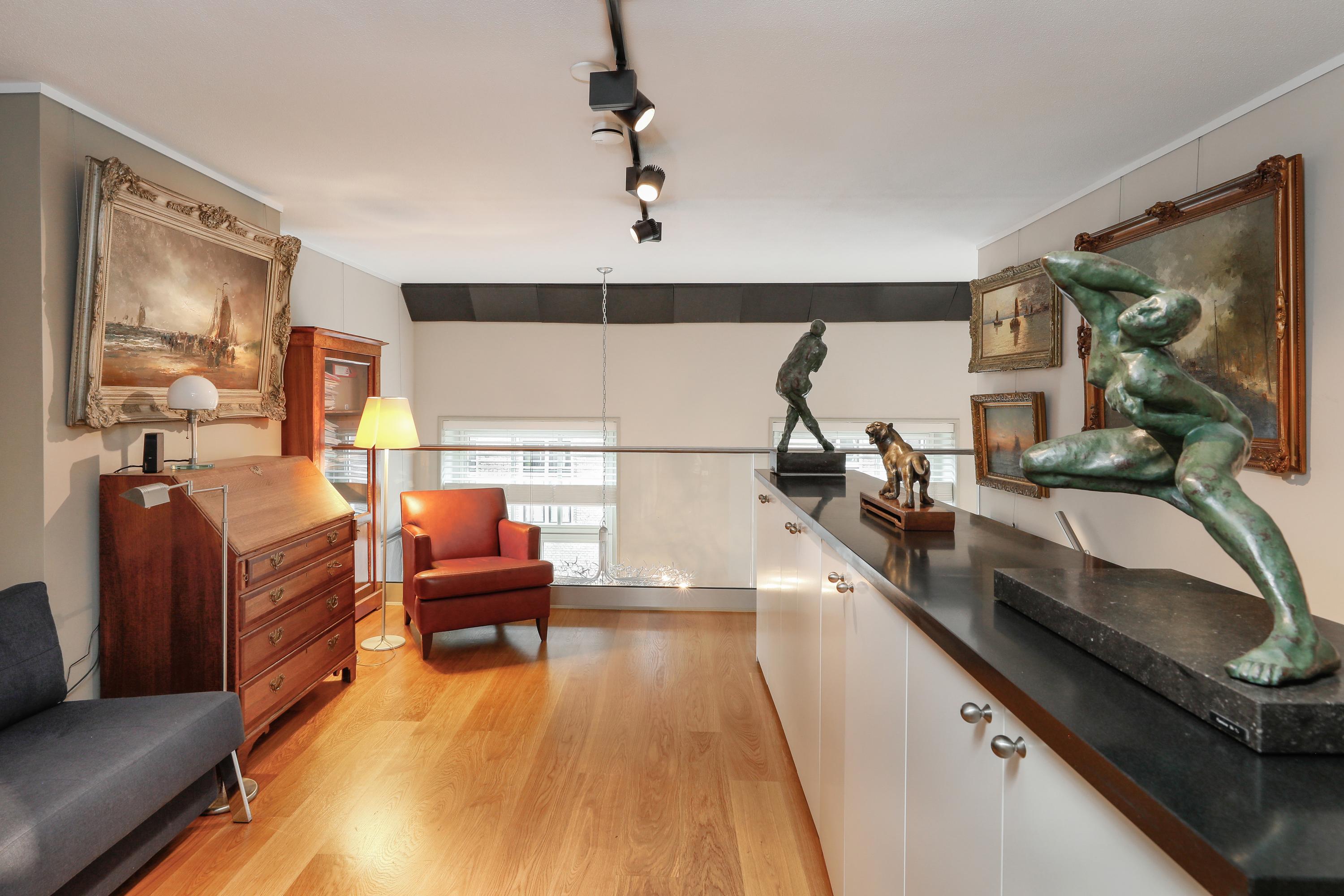 Het is heel bijzonder om, achter de historische gevel, deze moderne woning te vinden. Bij de renovatie / herbouw is dan ook alleen die voorgevel blijven staan. Met de hoge ramen dringt die historie je luxe appartement dan ook nog steeds binnen. Gelukkig maar. Aan de gevel is de plafondhoogte nog steeds ca. 580 cm. Prachtig, en zo valt het licht ook heel diep in je woning. Waar op tekening een loggia was gepland in 2001 is nu een ruimte die het hele jaar door gebruikt kan worden. Dus ook op die zomerse dag als loggia, door de grote hoge ramen open te zetten. Een knusse zit en de keuken treft u aan onder de verdieping.