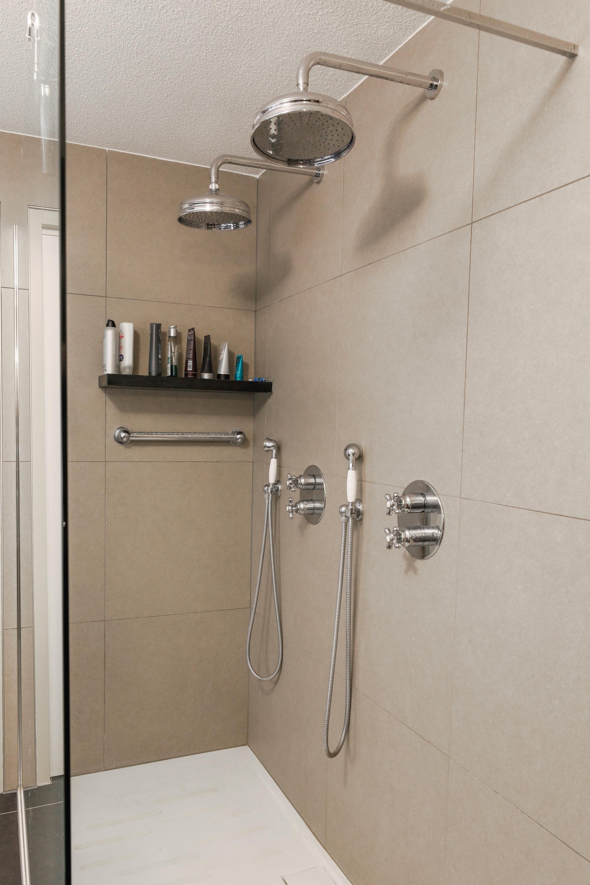 Met zachte tinten, grote tegels en een goede indeling is hier in 2018 een dubbele inloop douche gerealiseerd waar u veel plezier van zult hebben. Op de vloer liggen stroeve tegels met vloerverwarming. Het Geberit Mera aquaclean toilet is, gezien privacy, achter een laag wandje geplaatst. Er is een dubbele douche en een iets verhoogd wastafelmeubel met twee wasbakken en verwarmde spiegel. Handdoeken en ander badkamergerei kunt u praktisch opbergen in kastjes en op open glazen schappen.