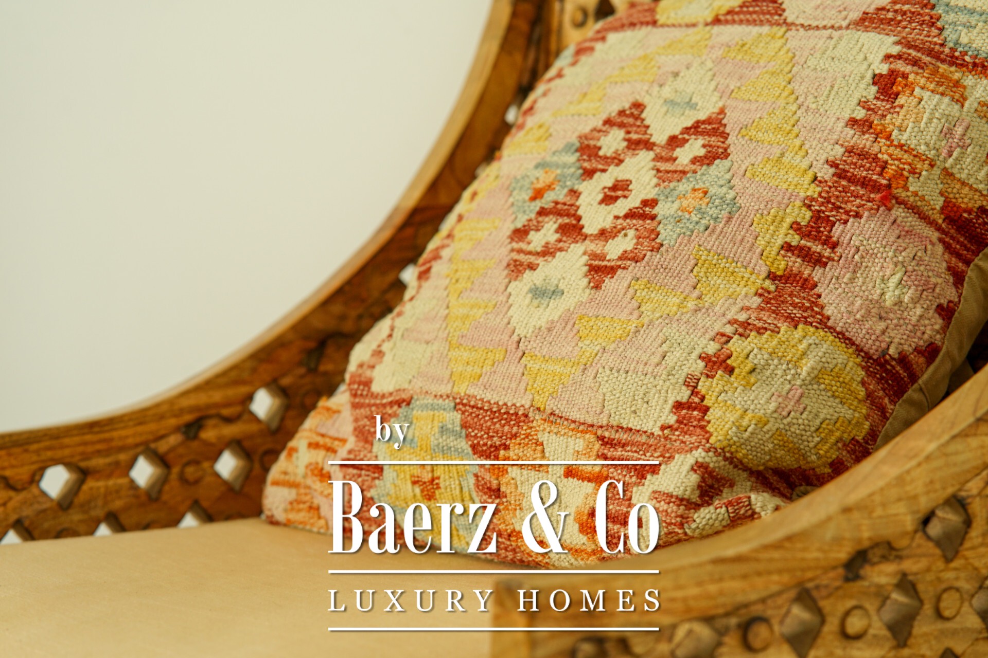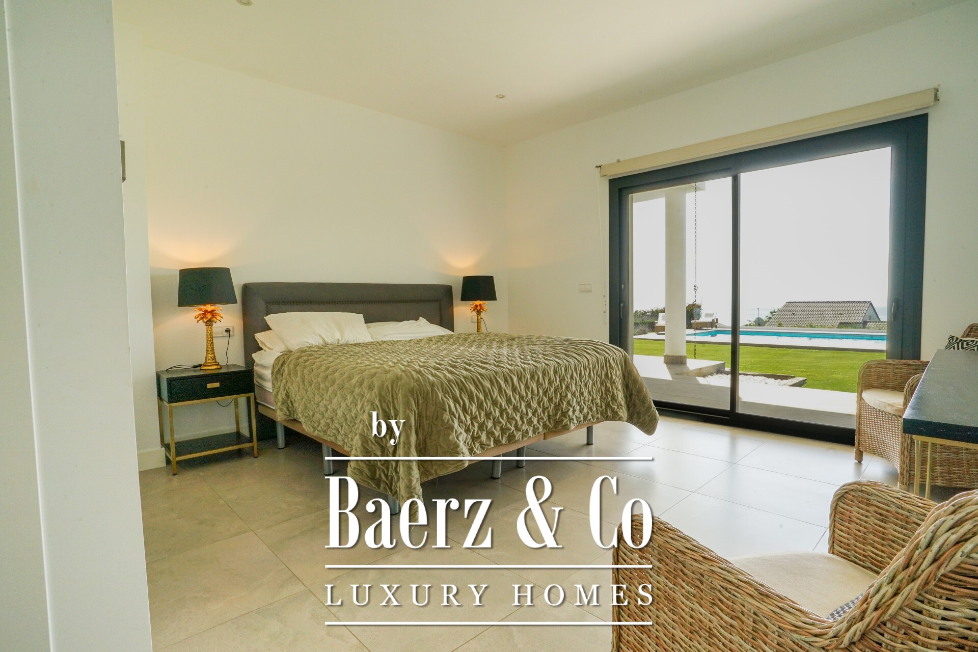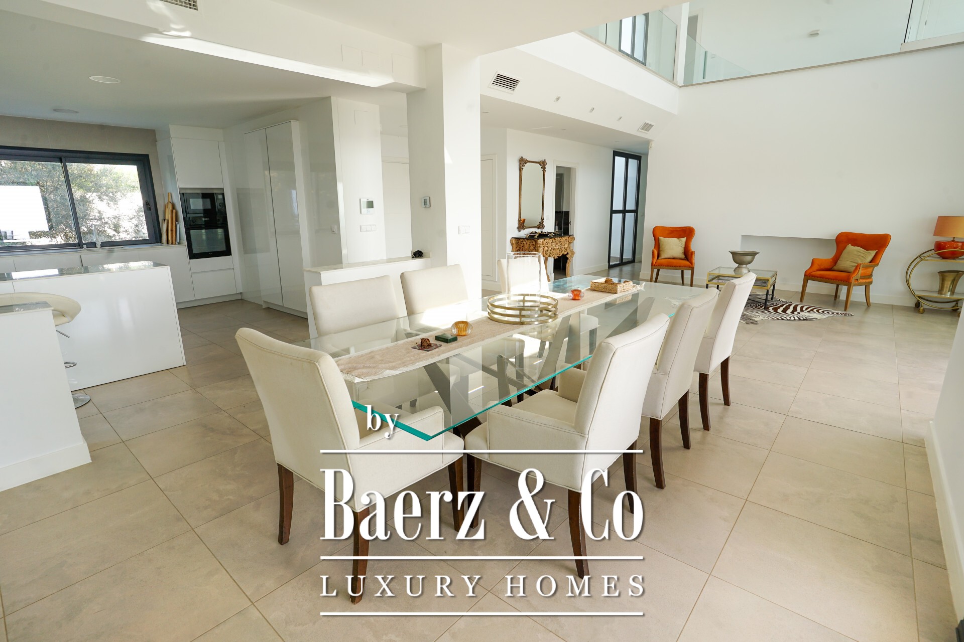 De belangrijkste leefruimtes zijn open en verbonden, met kamerhoge glaspartijen die de royale lounge en eetruimte verbinden met overdekte buitenzones. Een elegante, volledig uitgeruste keuken met hoogwaardige apparatuur grenst aan een buitenbarbecue, terwijl een aparte tv-kamer, privé gym, stoombad en kantoor bijdragen aan optimaal wooncomfort. Vier slaapkamers en vijf badkamers, waarvan drie en suite, bieden flexibiliteit en privacy; het kantoor kan eenvoudig als vijfde suite dienen.