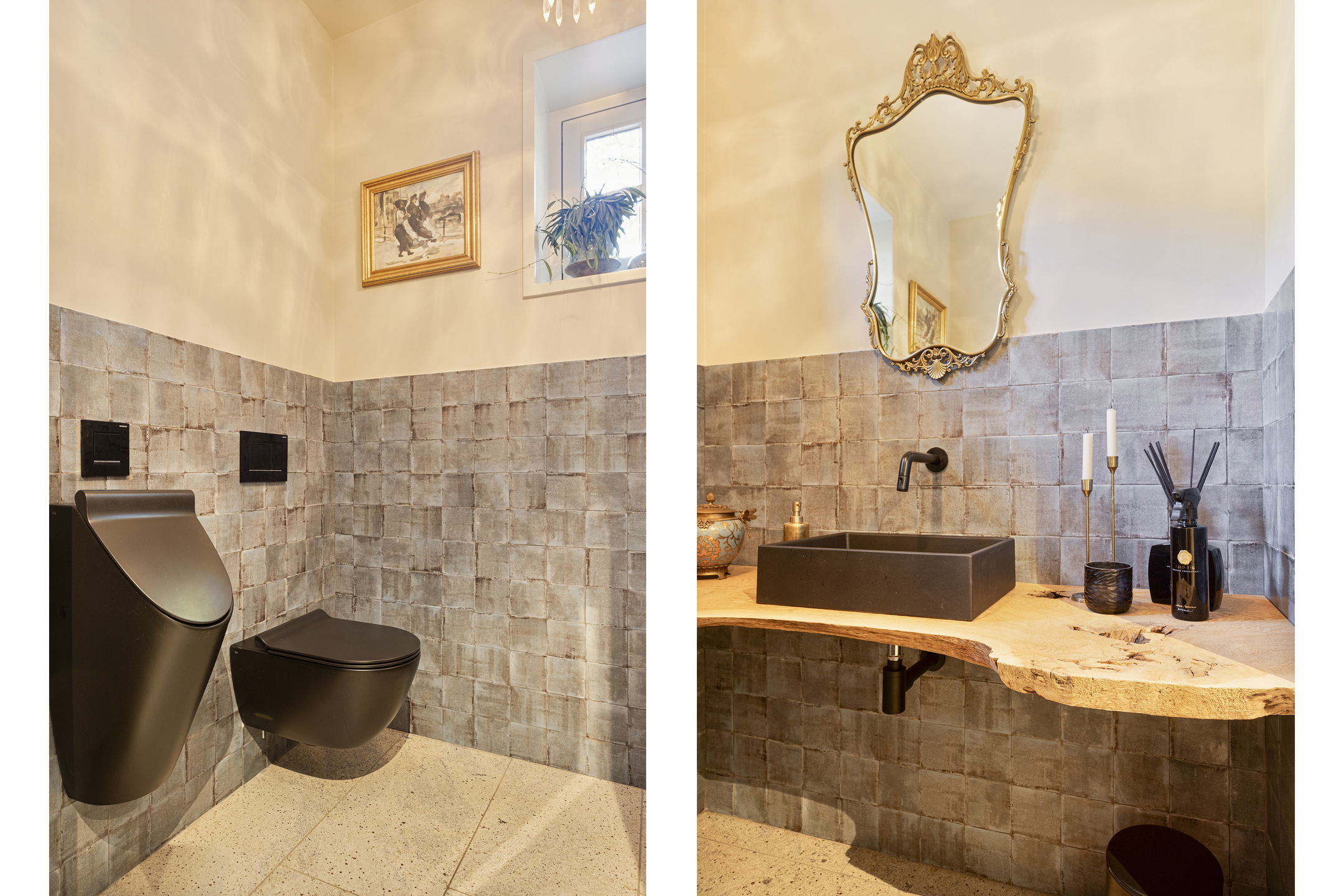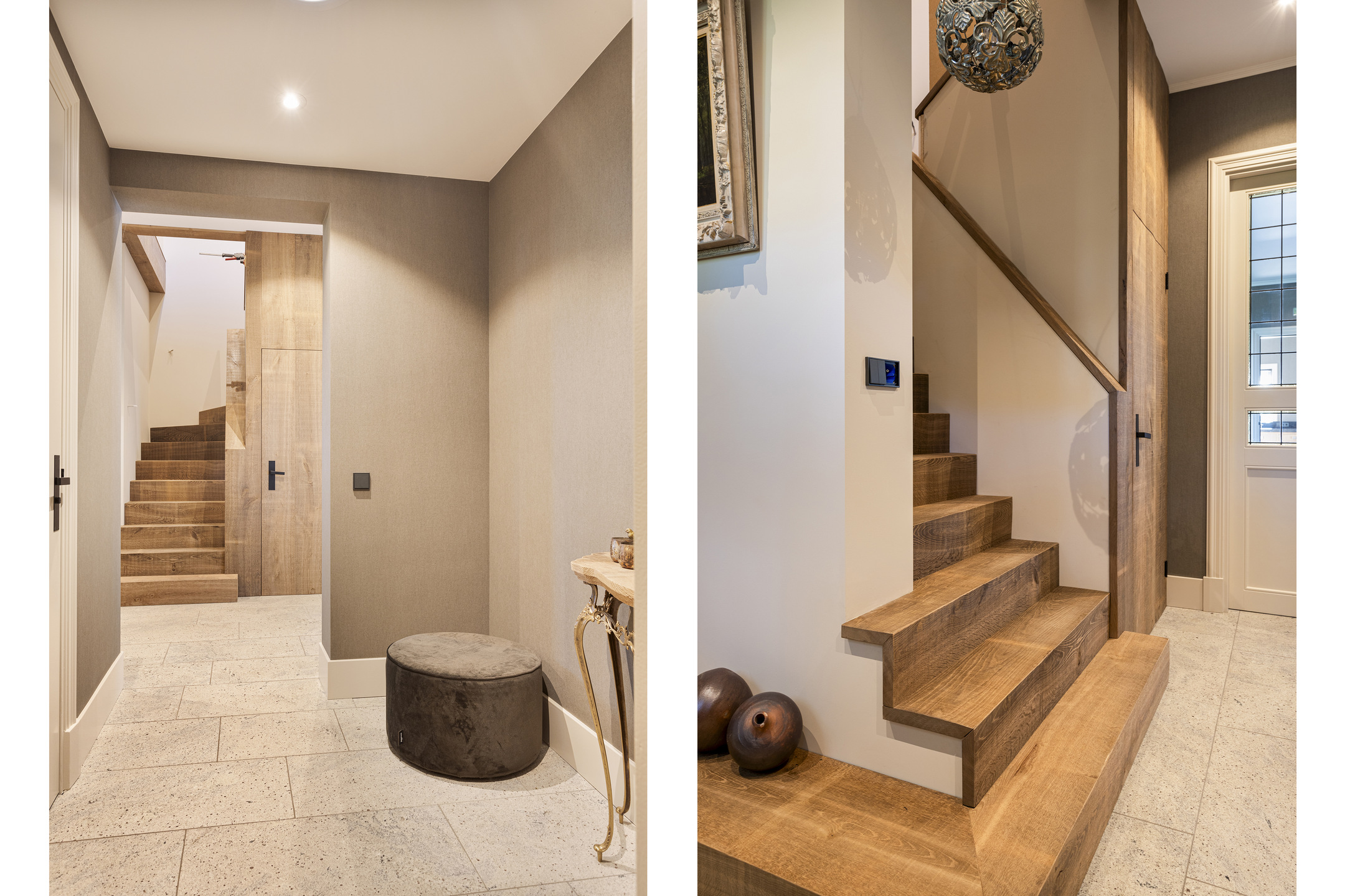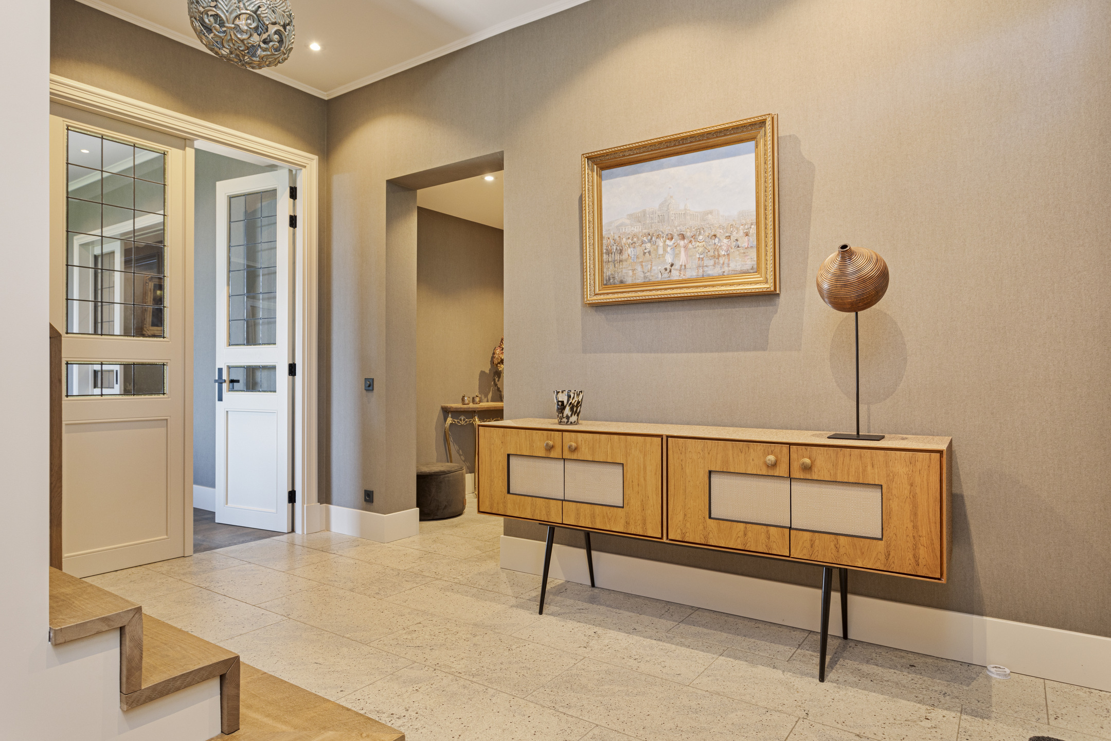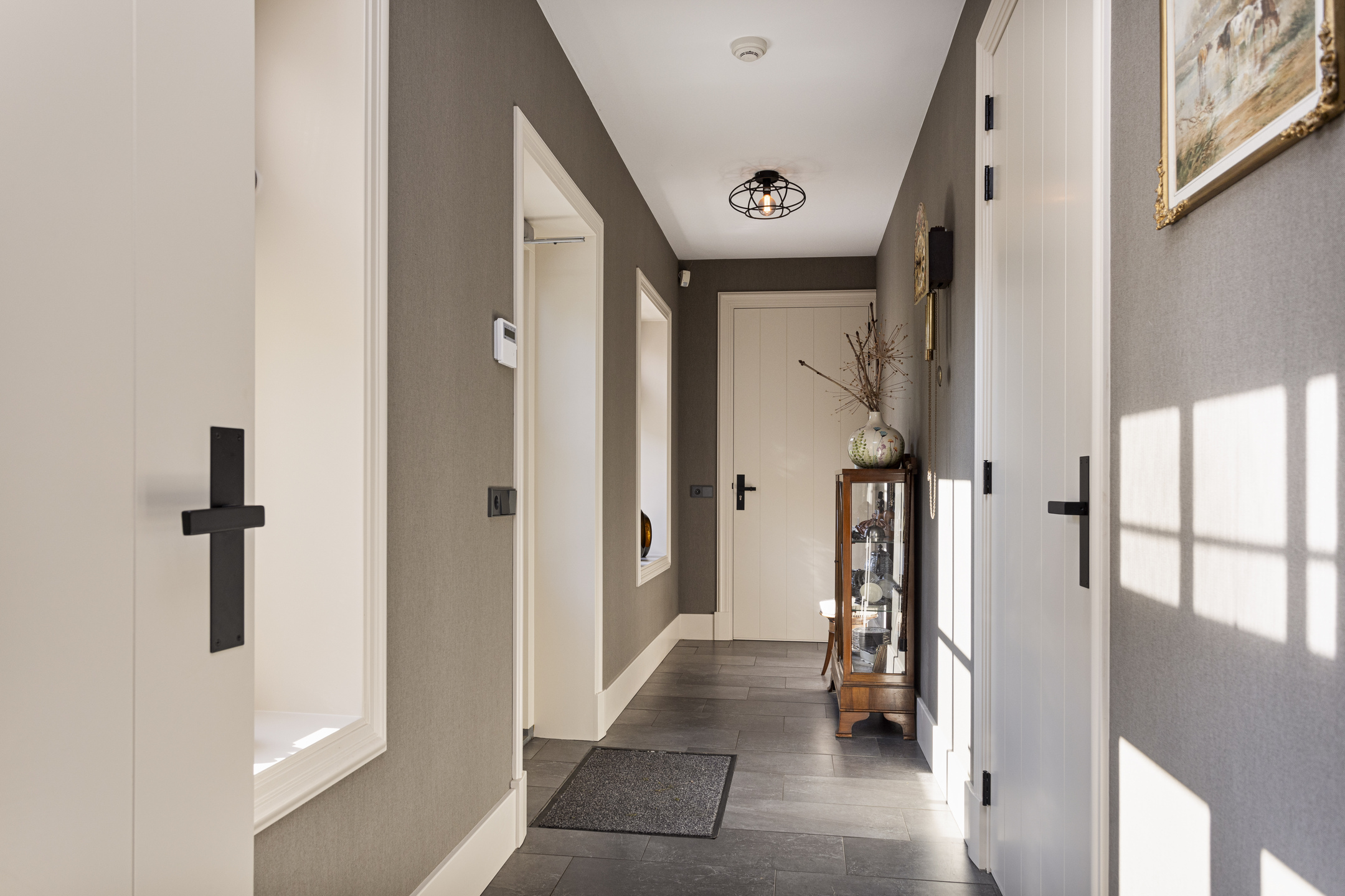 In de hal op de vloer de travertin Vieux de Bourgogne-dallen die ook in de keuken en de gang hun opwachting weer maken. Op de wand een uiterst smaakvol linnenstructuurbehang in een fijne taupekleur, die een fraaie achtergrond biedt voor ieder type interieur. Er is hier gekozen voor modern landelijk en alle elementen werken in volle harmonie samen tot een schitterende compositie. Links de trap naar de verdieping, rechts de WC – uit de kunst met schitterende geglazuurde Portugese tegels en matzwart keramiek sanitair in de vorm van hangcloset en wastafelopstelling- en de toegang tot de studio. Links de ruime kelder.