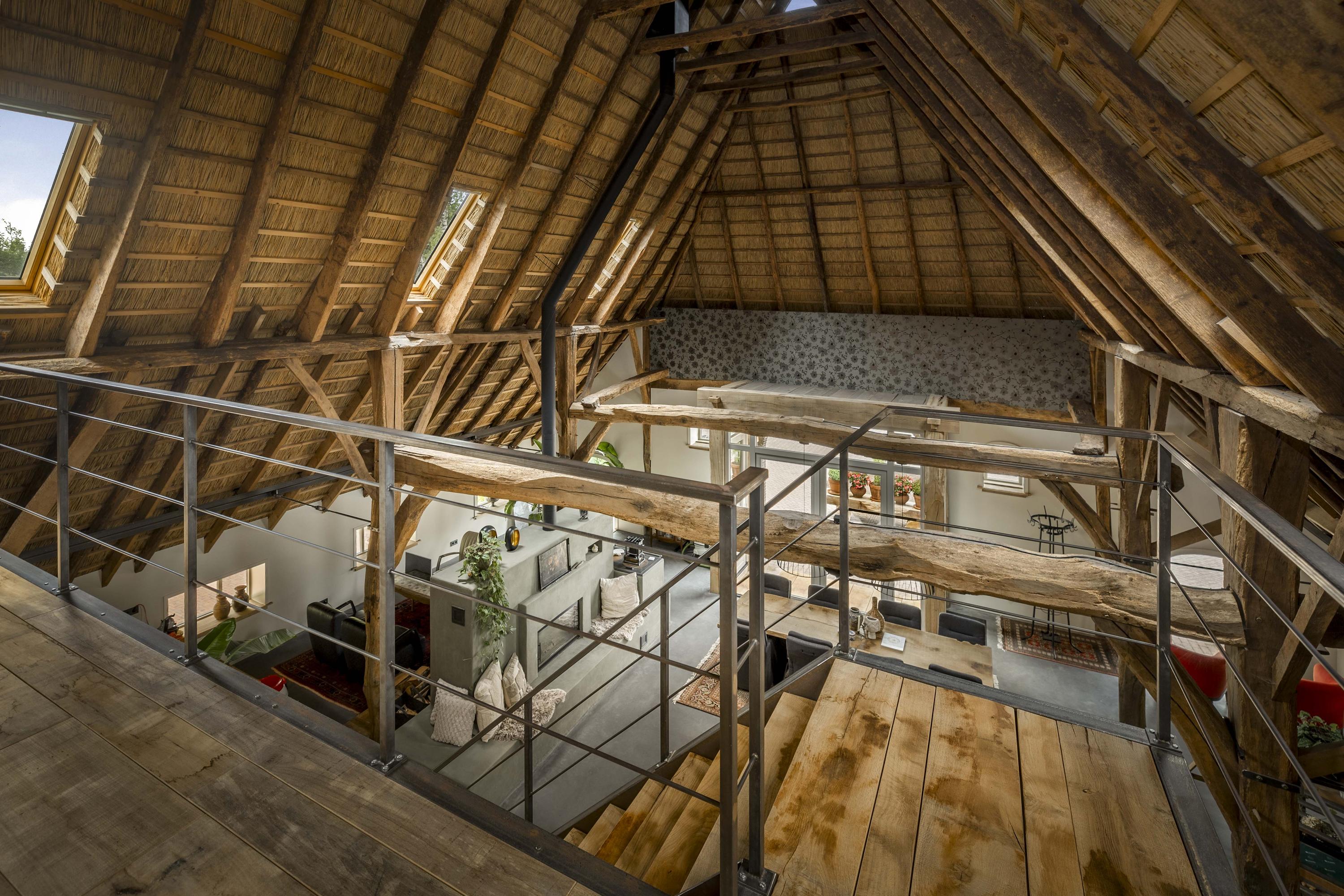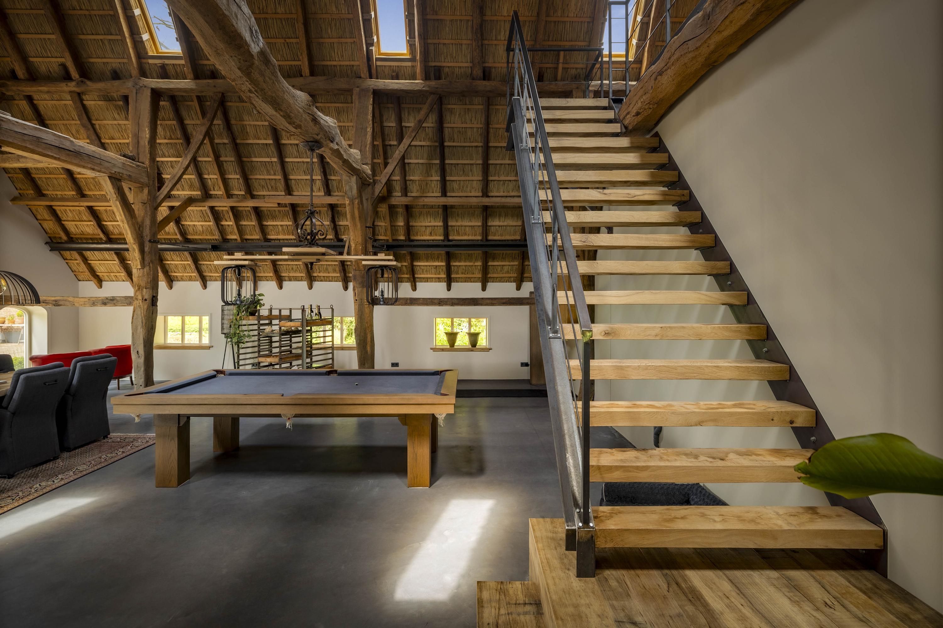 De deel, waar vroeger de koeien lekker stonden te herkauwen, is omgetoverd tot een supergave ruimte; de spanten en het dikke rietpakket (er zit nog isolatiemateriaal tussen) zijn in het zicht gelaten en de ruimte is lekker licht door de dakramen. De betonvloer – gereed voor het aanbrengen van vloerverwarming –, de schitterende leemkachel en de trap (smederij Oldenhave uit Vorden) geven het een rauw, industrieel randje. Beneden zijn er twee separate WC’s aangelegd. Boven wordt de biljartkamer gerealiseerd.