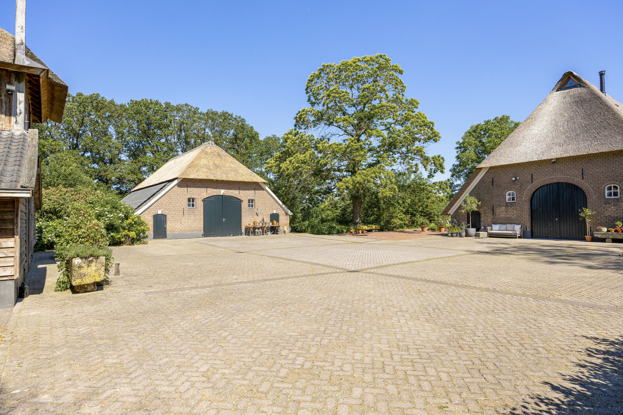 Door de grote houten poort, het erf op. De enorme Bentheimer voederbak die nu slechts nog dienst doet als landschappelijke verfraaiing, staat als een kunstobject voor de boomgaard. De grote deeldeuren bieden een vriendelijk aanzicht. Aan de linkerzijde de hoofdentree. Al het houtwerk zit dik in de lak (natuurlijke houtlakken op basis van lijnzaadolie waardoor het hout ademen kan) en ziet er ronduit fantastisch uit. Ook binnen wordt gauw duidelijk dat er kosten noch moeite gespaard zijn, en dat er uitsluitend de beste materialen gebruikt zijn.