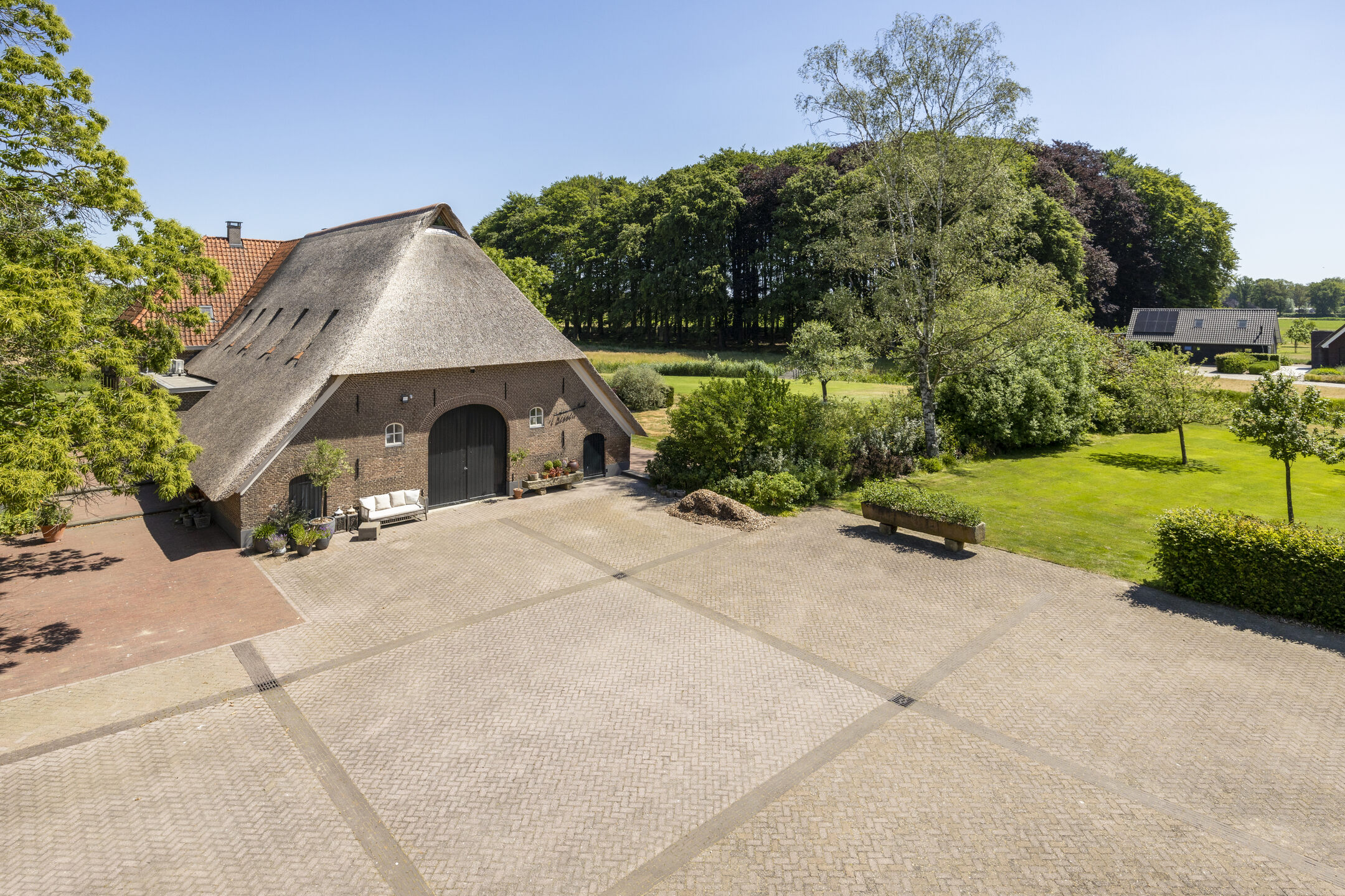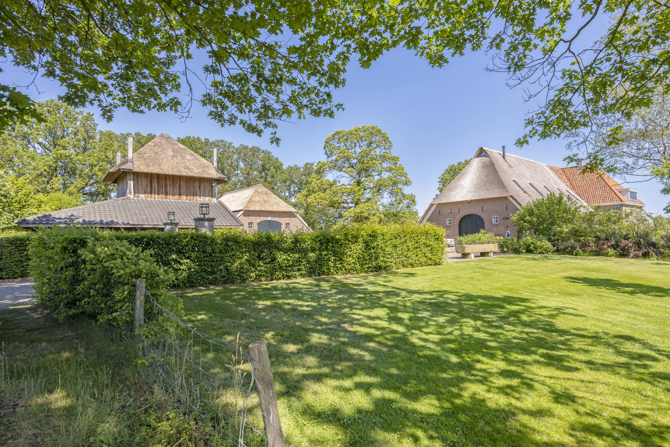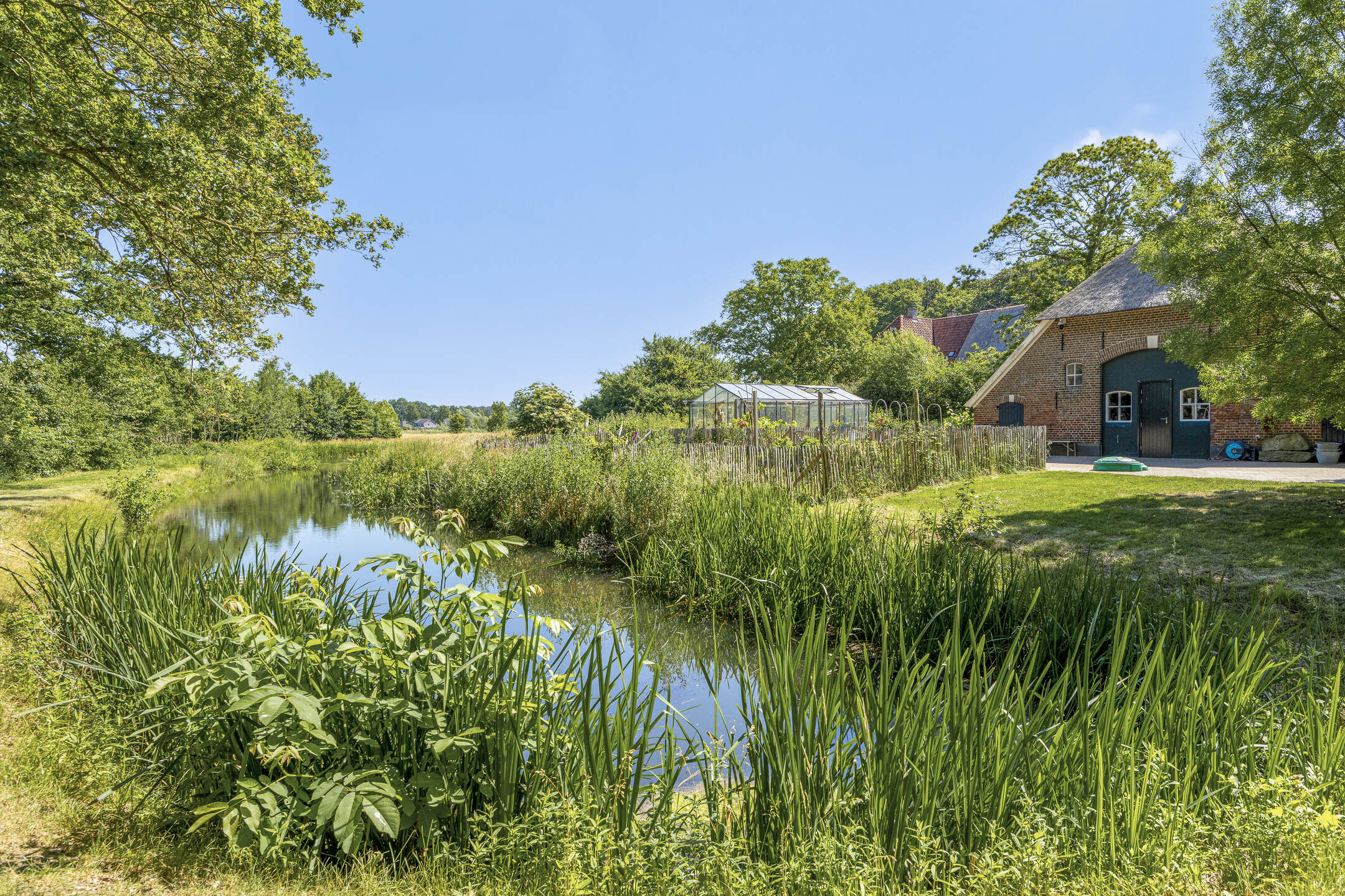 Na een lang leven – eeuwenlang – werd in 2011 deze fraaie hoeve omgebouwd tot een hoogwaardig afgewerkt en optimaal verduurzaamd woonhuis. Omdat de agrarische bestemming eraf ging, werd ook landschappelijk de omgeving anders ingevuld. Zo besloot men destijds om de historische gracht in ere te herstellen en weer rondom het huis te leiden.