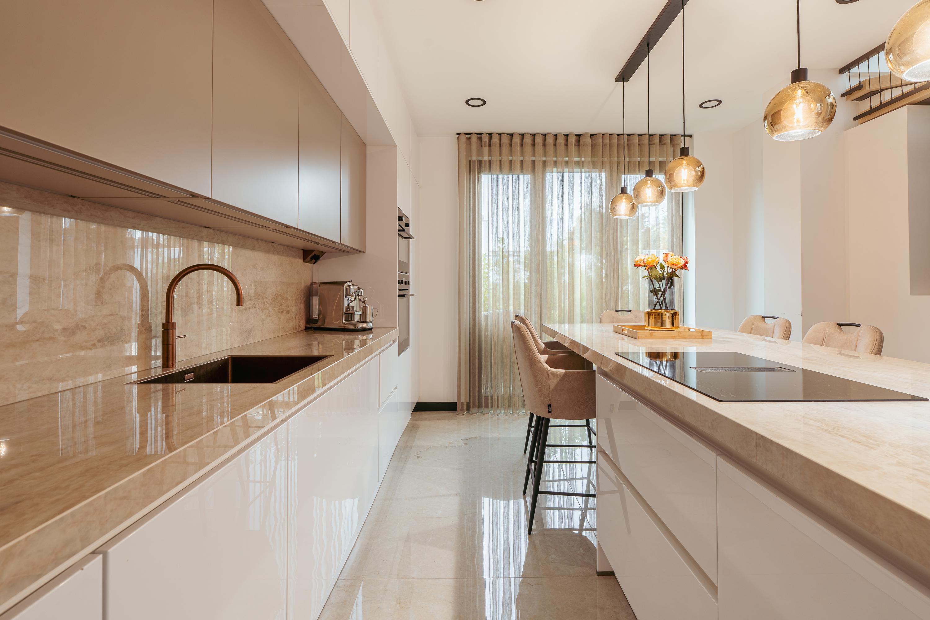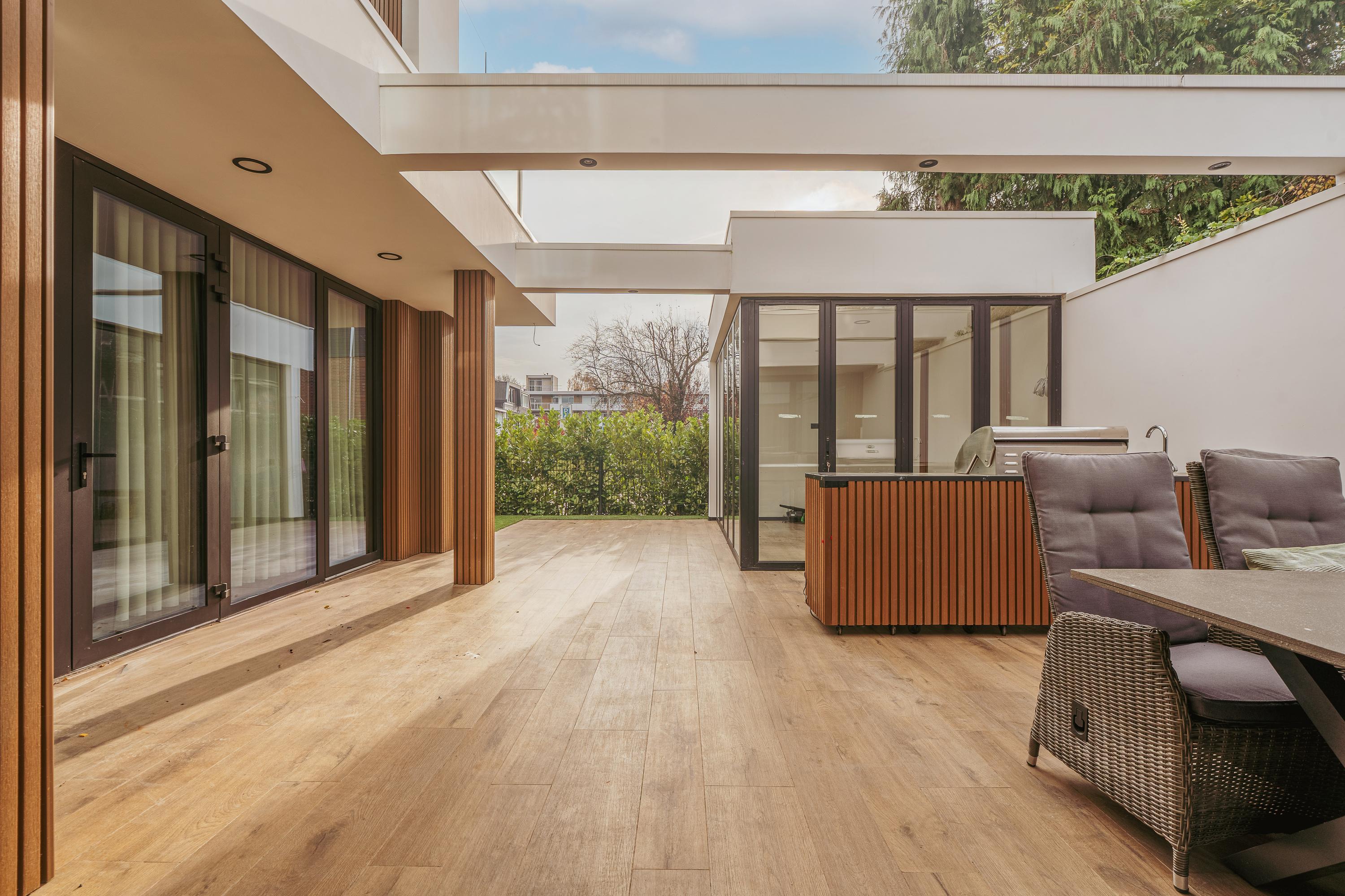 Middels de verzorgde voortuin bereikt u de entree van de woning. De ruime hal vormt een prettige binnenkomst. Vanuit de hal betreedt u de royale woonkamer, die wordt gekenmerkt door een overvloed aan daglicht. De woonkamer staat middels grote raampartijen en glazen deuren in directe verbinding met het terras in de tuin, waardoor binnen en buiten op natuurlijke wijze in elkaar overlopen. Aangrenzend bevindt zich de luxe woonkeuken, uitgevoerd met een royaal kookeiland dat tevens fungeert als gezellige bar om aan te zitten. De keuken is van alle gemakken voorzien en beschikt over een oven en combi-oven, inductiekookplaat met interne afzuiging, klimaatkast, Quooker, vaatwasser, koelkast en vriezer. Er is volop ruimte voor een grote eettafel. Tevens is er achter de keuken een ruime bijkeuken en berging met genoeg ruimte voor opslag van apparatuur en etenswaren.