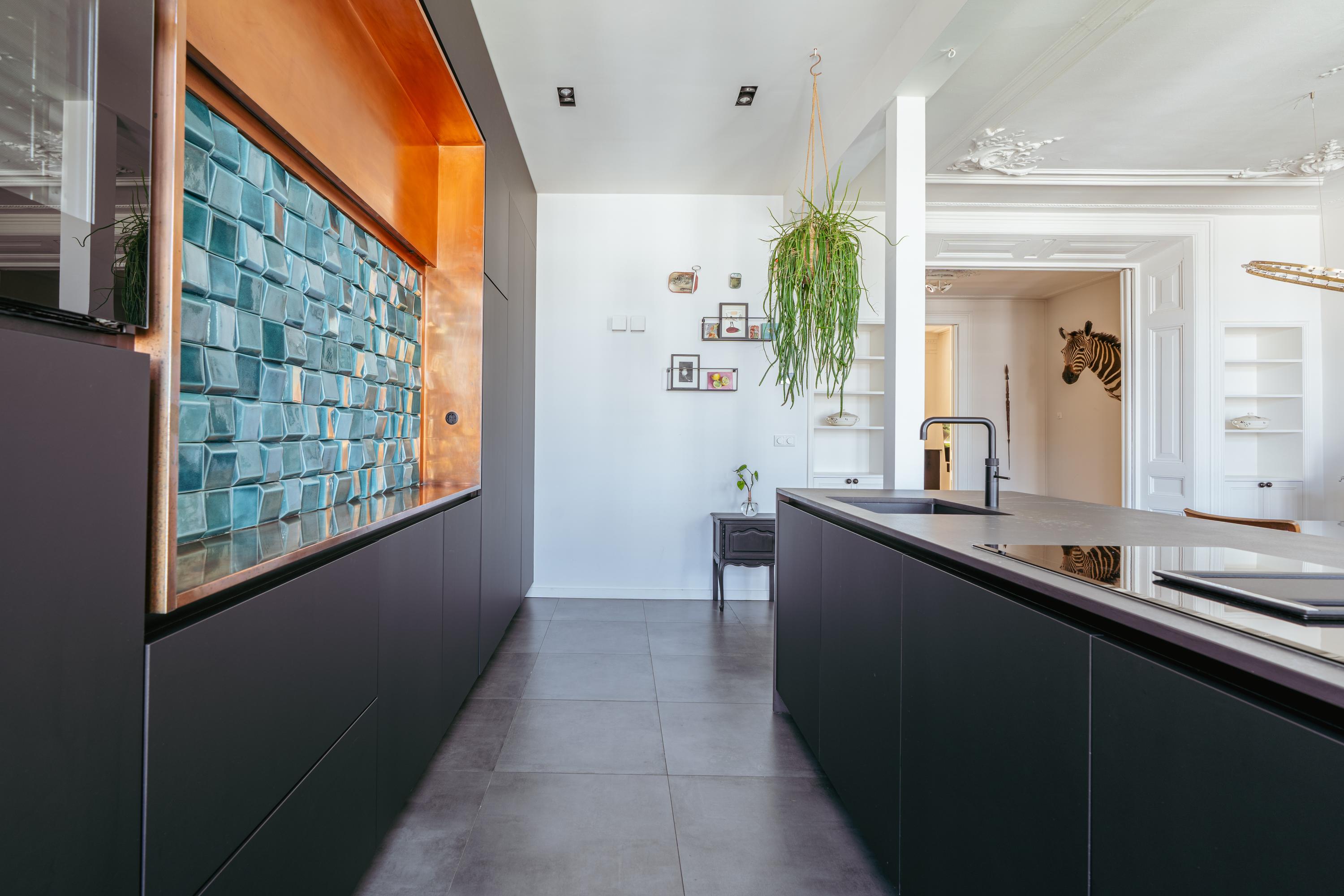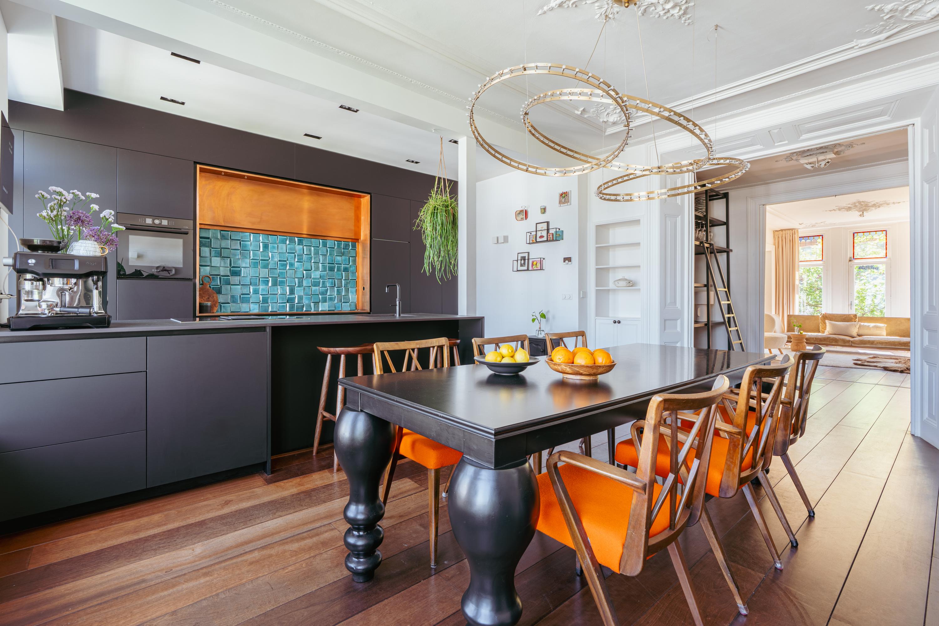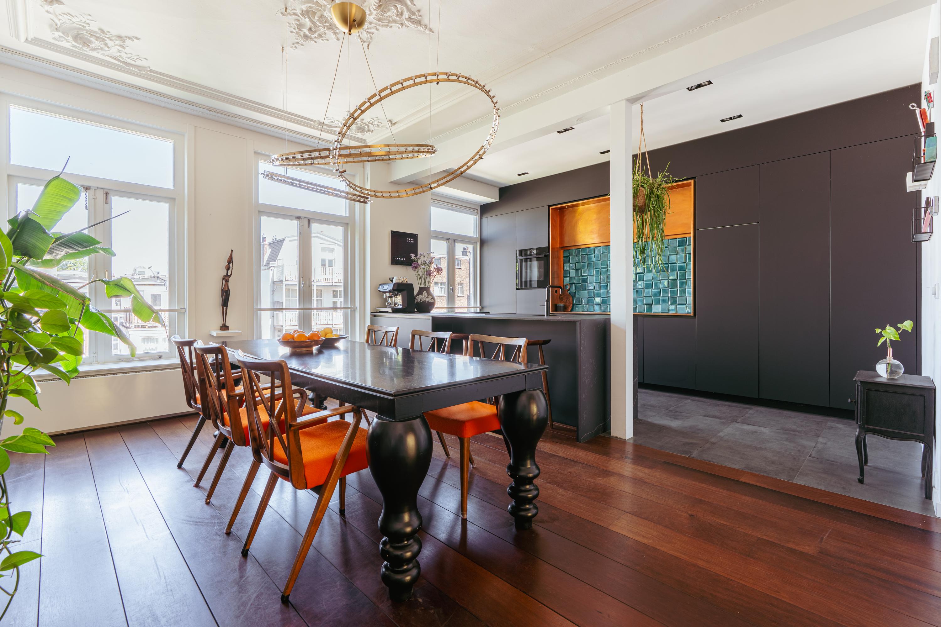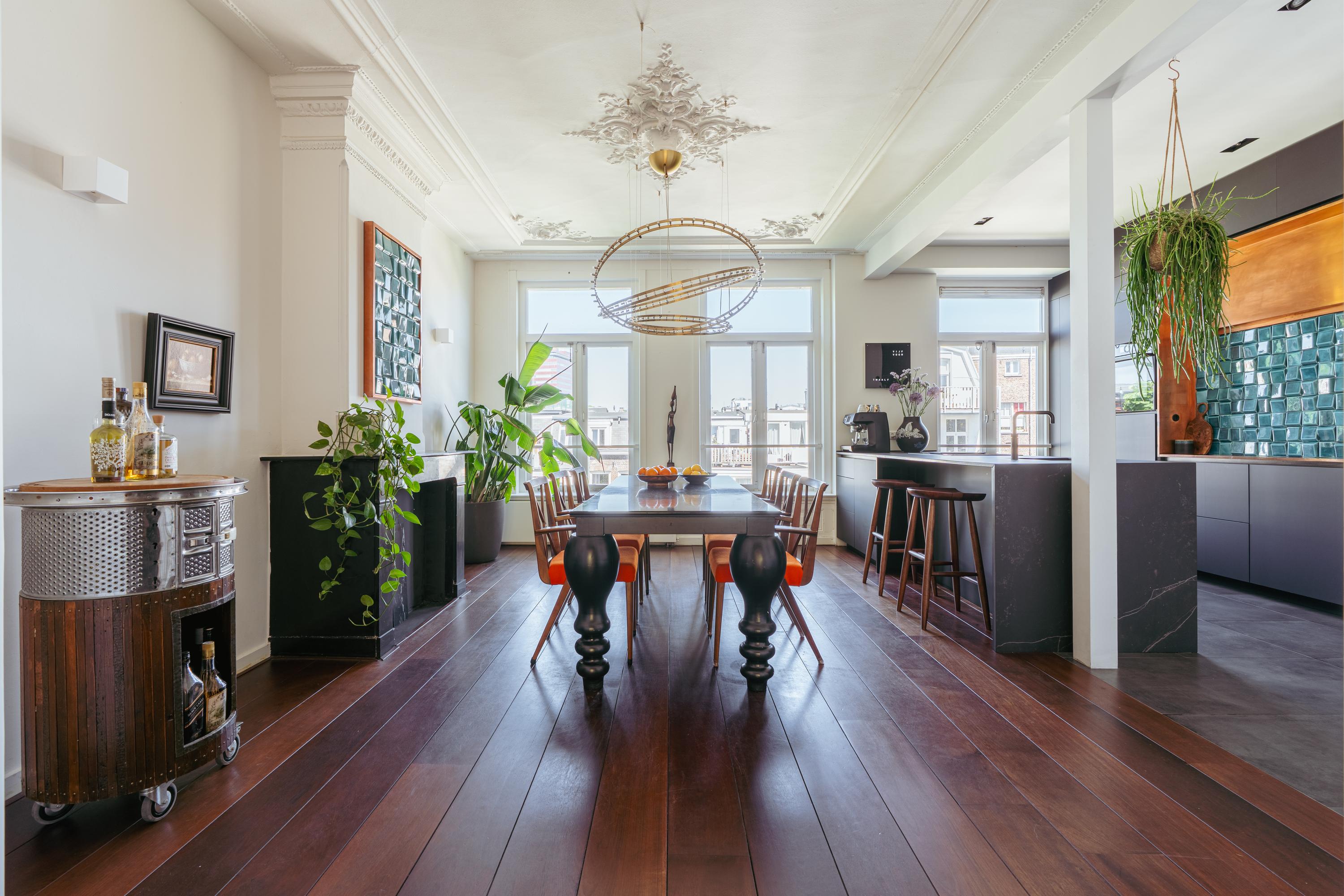 Vanuit de hal, voorzien van op maat gemaakte garderobekasten, heeft u toegang tot de zonnige woonkamer met houtkachel en originele natuurstenen schouw. Aan de voorzijde van het pand, aangrenzend aan de woonkamer, bevindt zich een fijne werkruimte en een breed zonnig balkon. Centraal gelegen een tussenruimte met een prachtige op maat gemaakte kast inclusief klimaatkoelkast. Deze ruimte is tevens geschikt als bibliotheekruimte. Deze ruimte verbindt woonkamer en eetkamer met elkaar via karakteristieke schuifdeuren. De moderne open keuken, gelegen aan de lichte achterzijde van de woning, beschikt over een uniek kookeiland met Dekton werkblad en koperen achterwand met Portugese 3D tegels. Andere luxe voorzieningen zijn een inductiekookplaat met geïntegreerd afzuigsysteem, een (stoom)oven met sous-vide en serviesverwarmingsfunctie, ruime koelkast en aparte vriezer, vaatwasser en tot slot een Quooker met bruiswaterfunctie. Een gezellige brede eetkamer met oppervlakte van maar liefst 35 m²! Dit is dé plek voor vele onvergetelijke familie en/of vrienden momenten.