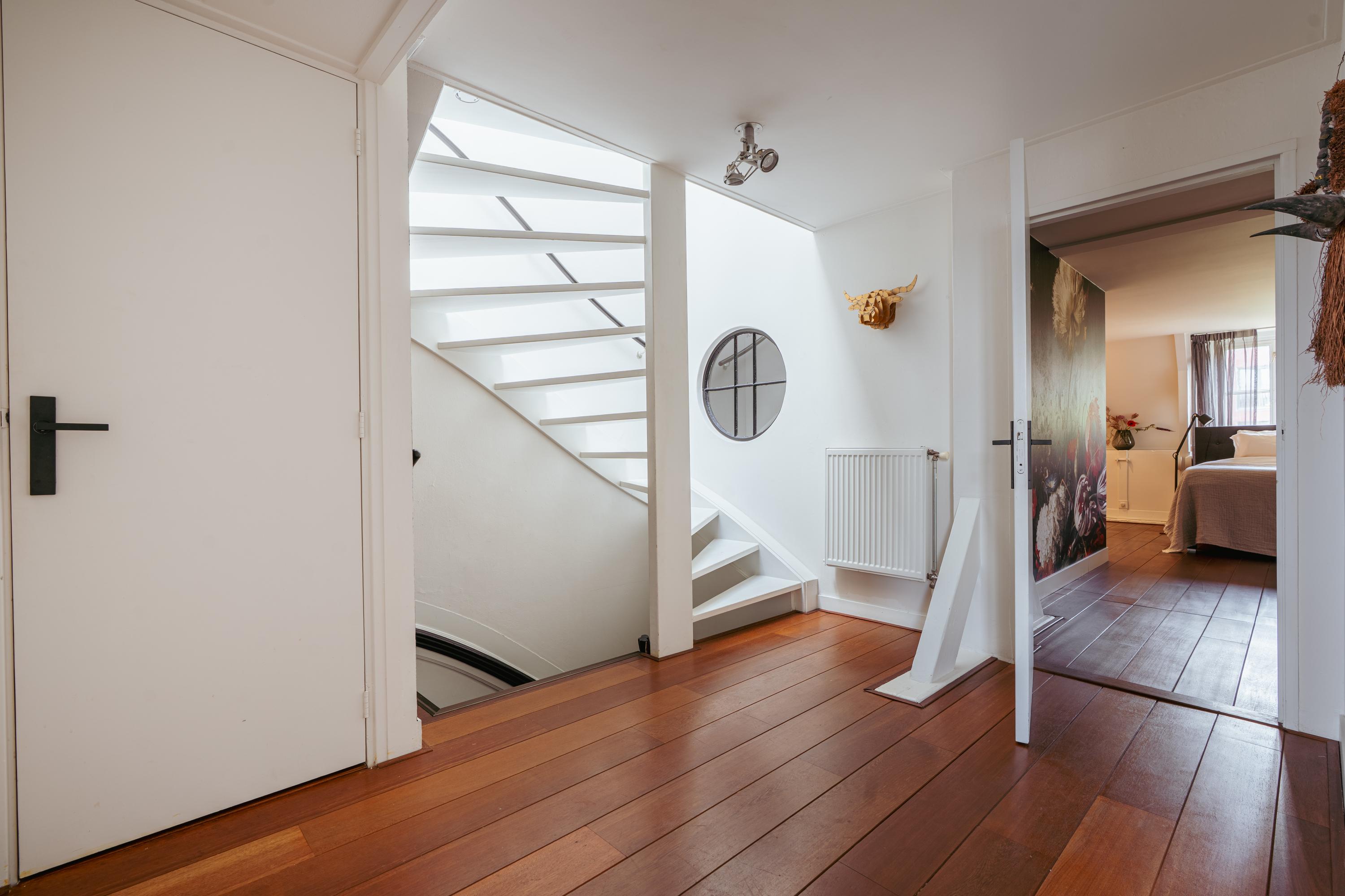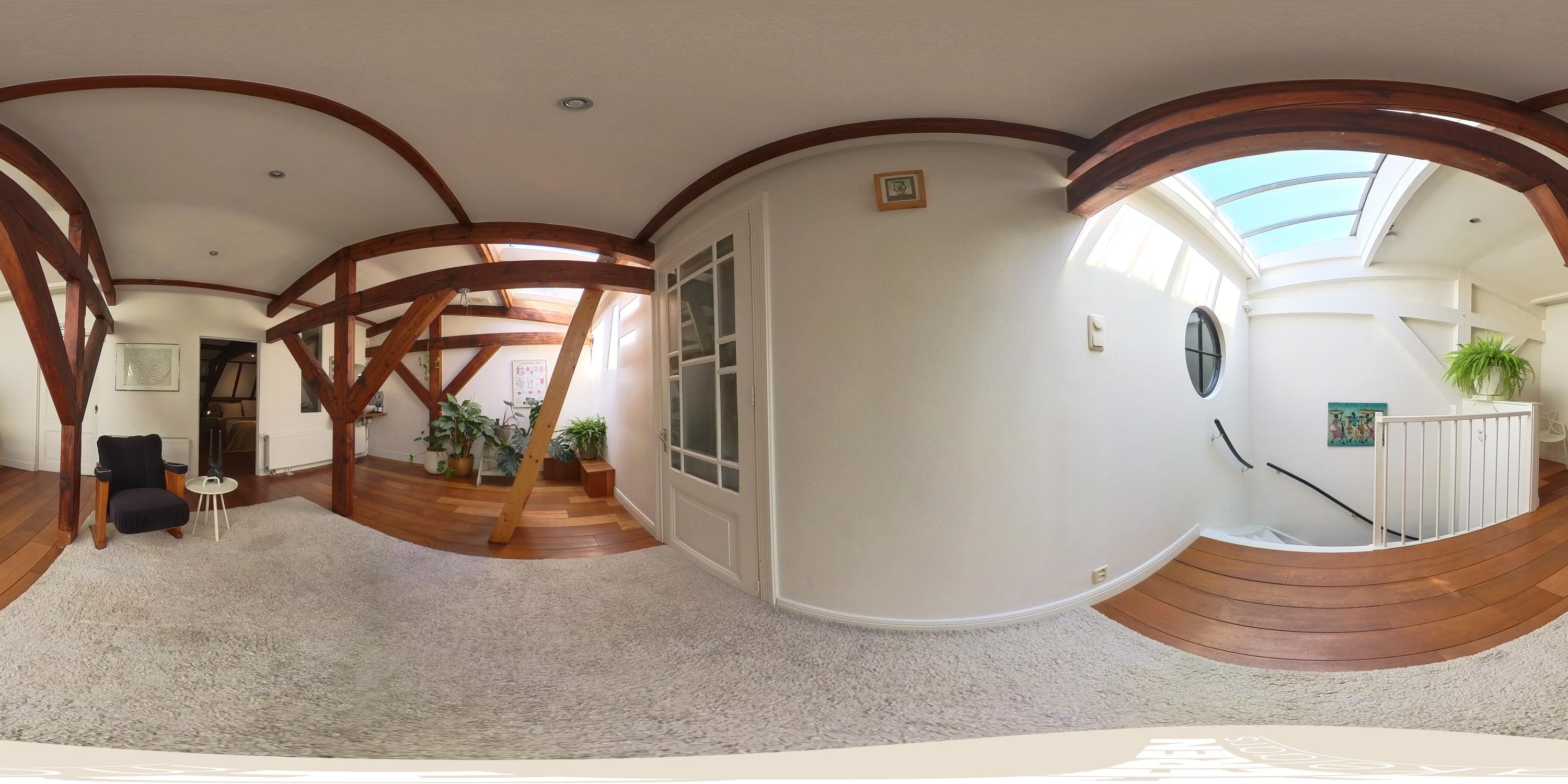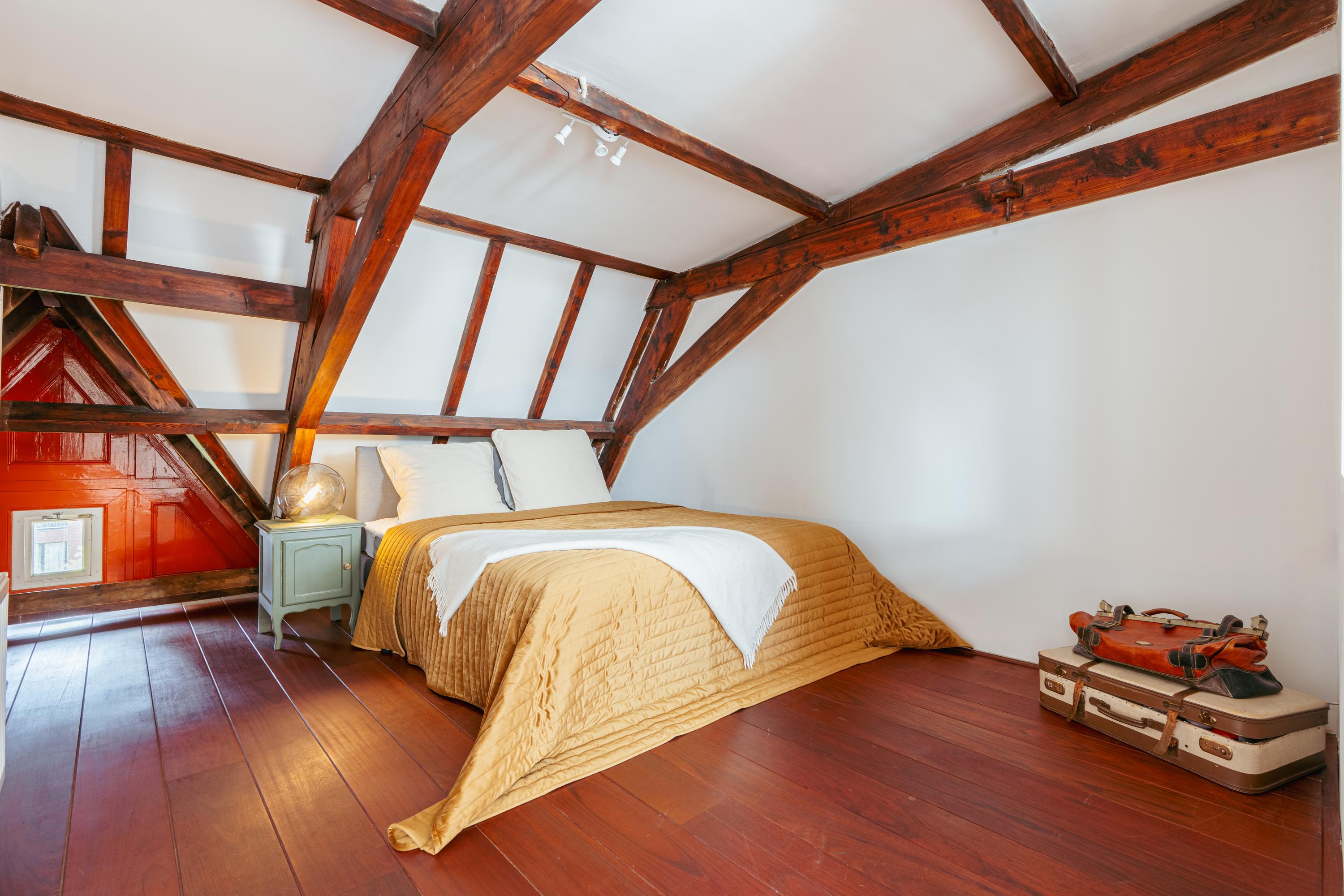 Ruime overloop met authentieke houten constructiebalken. Deze ruimte leent zich uitstekend voor meerdere doeleinden zoals muziekkamer, werkplek of gameroom. De vierde slaapkamer en een handige bergruimte bevinden zich aan de voorzijde. Een extra wastafel treft u eveneens op deze verdieping. Middels een trap heeft u toegang tot het dak, vanwaar Carré en zelfs het Rijksmuseum zichtbaar zijn.