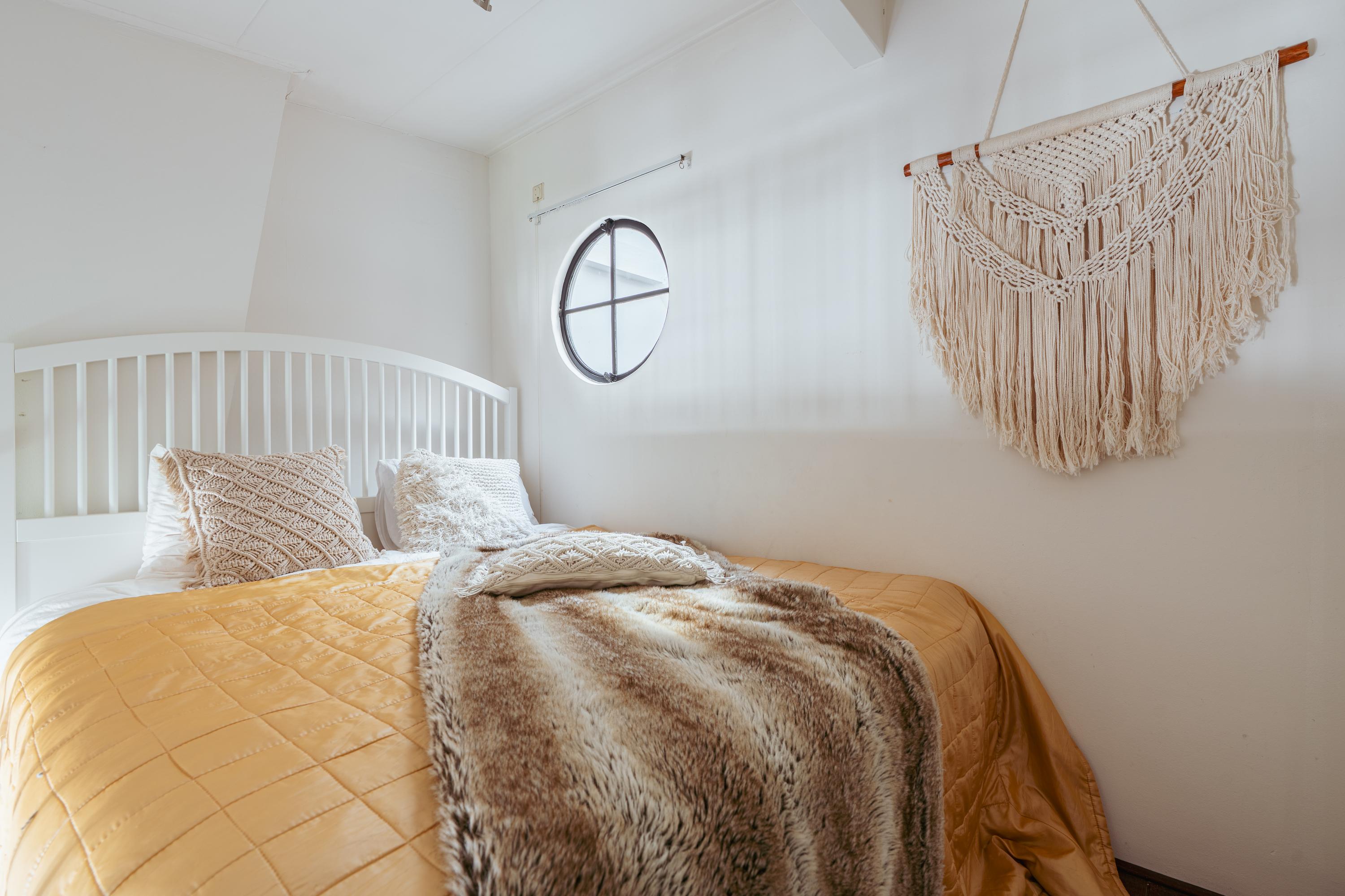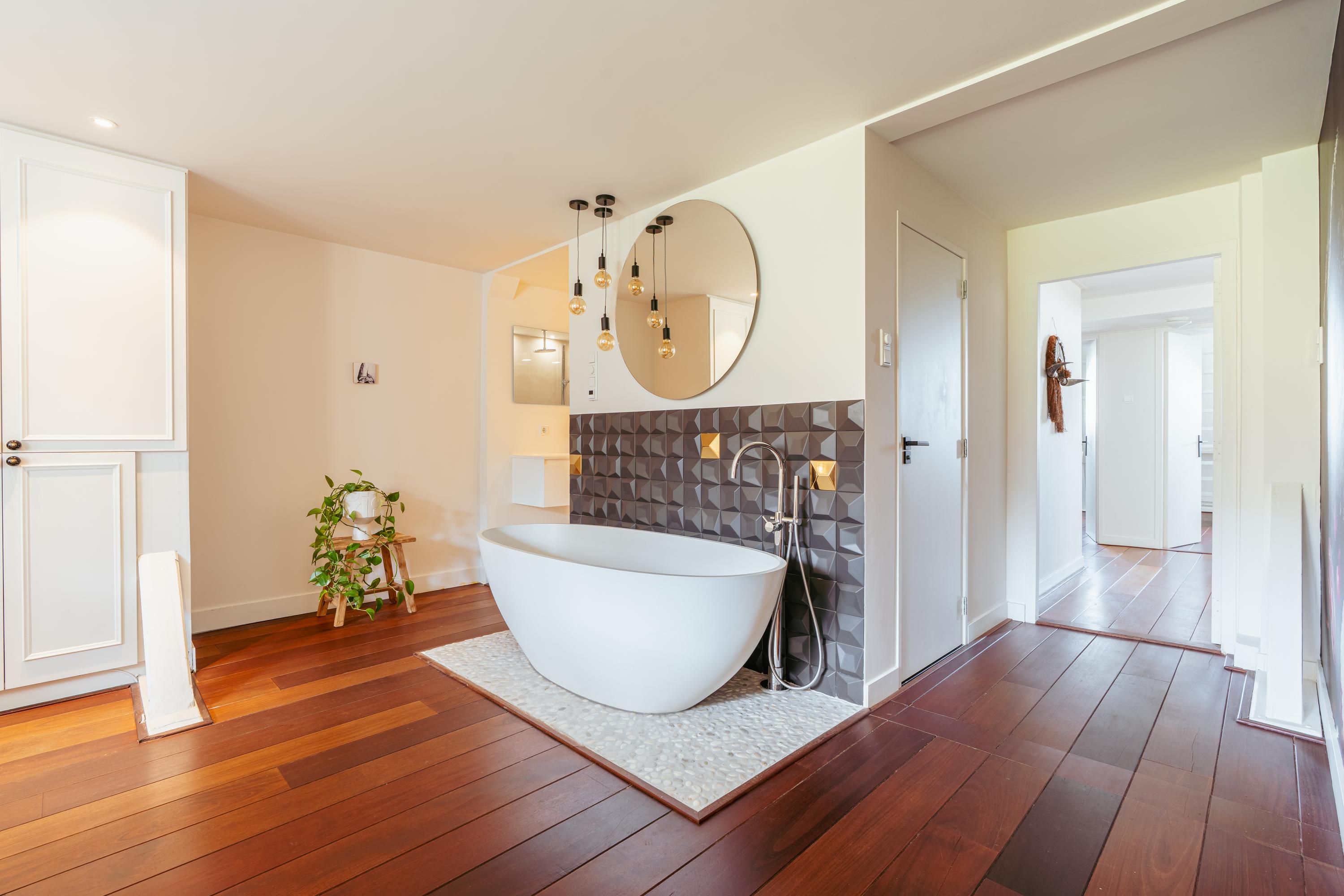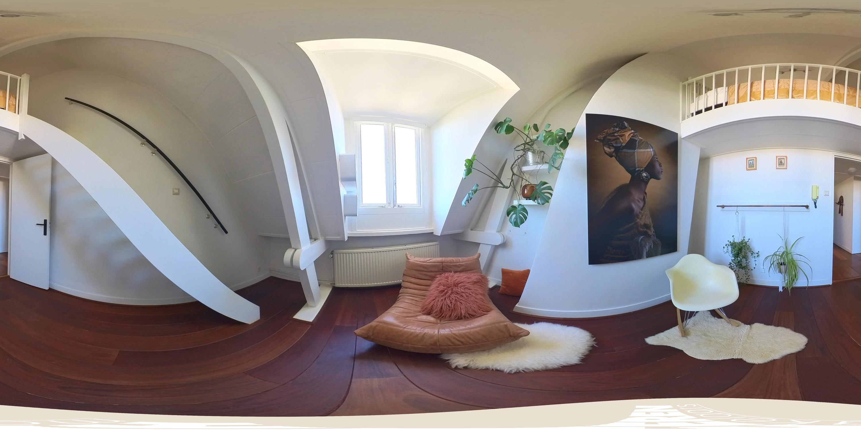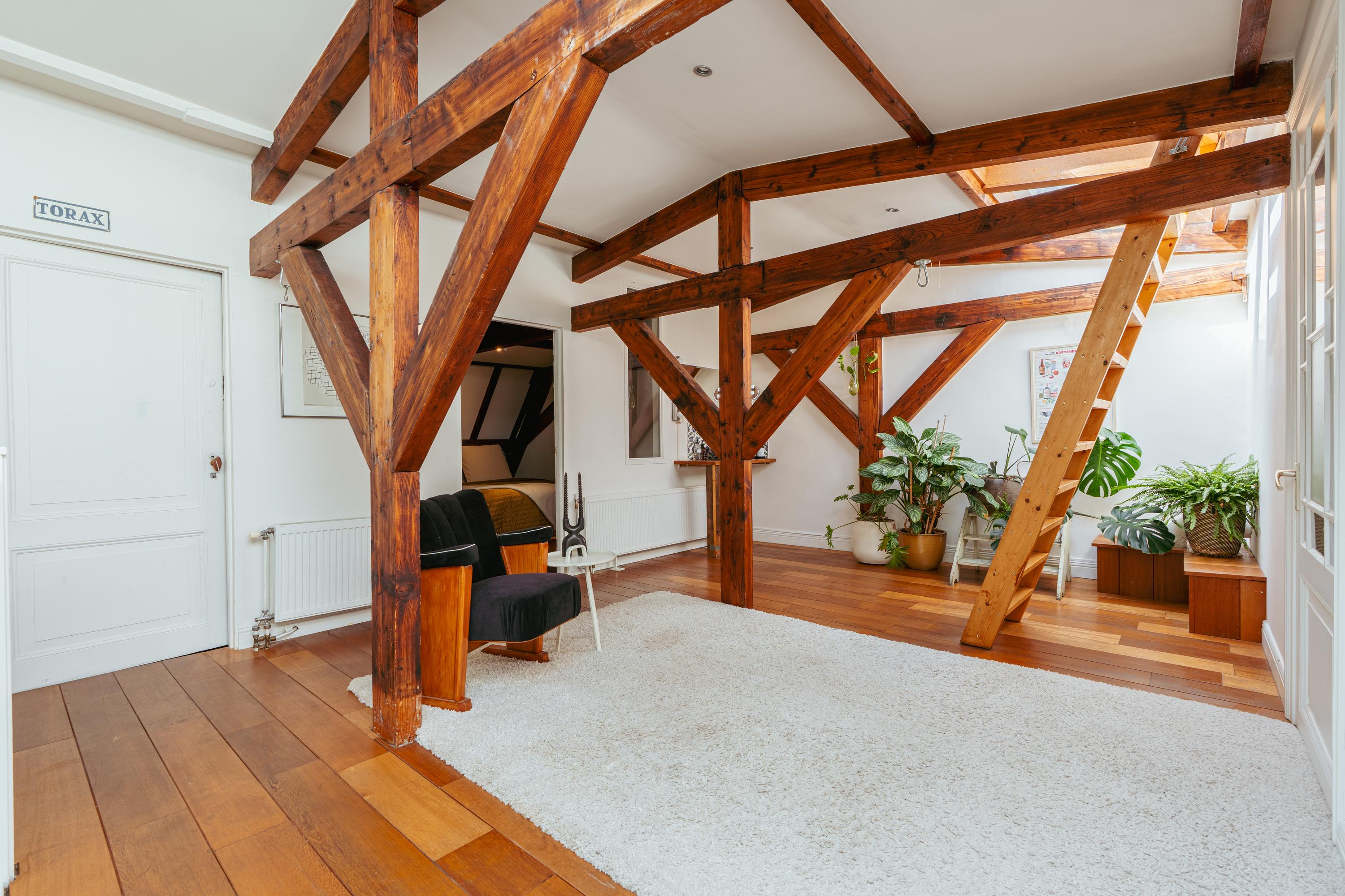 Ruime overloop met authentieke houten constructiebalken. Deze ruimte leent zich uitstekend voor meerdere doeleinden zoals muziekkamer, werkplek of gameroom. De vierde slaapkamer en een handige bergruimte bevinden zich aan de voorzijde. Een extra wastafel treft u eveneens op deze verdieping. Middels een trap heeft u toegang tot het dak, vanwaar Carré en zelfs het Rijksmuseum zichtbaar zijn.