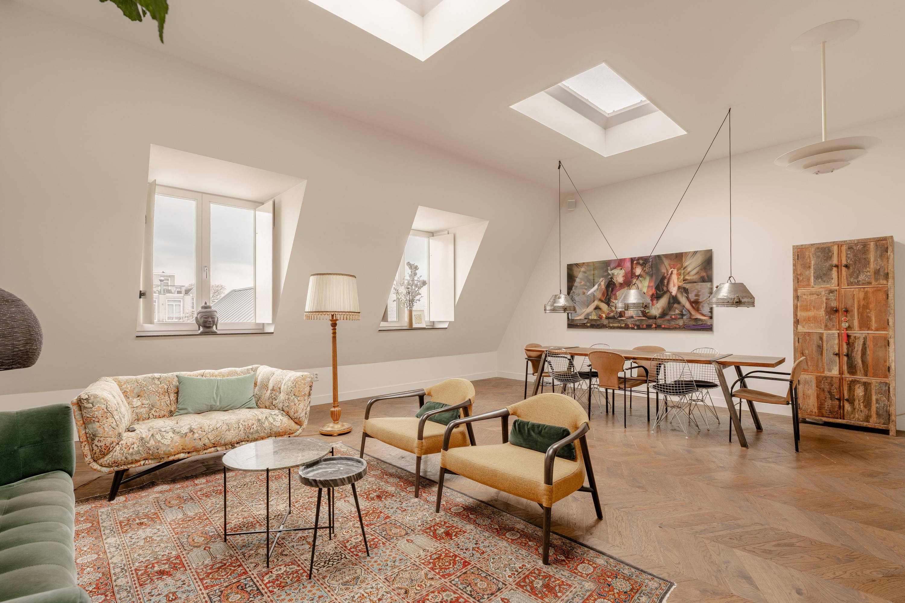 De derde verdieping vormt de woonverdieping van de woning. Hier bevindt zich de royale en lichte woonkamer met open keuken aan de voorzijde. Dankzij de indrukwekkende plafondhoogte en meerdere dakramen valt er veel daglicht naar binnen, wat de ruimte een bijzonder open en ruimtelijk karakter geeft. De houten vloer en de strakke afwerking zorgen voor een warme en moderne uitstraling.