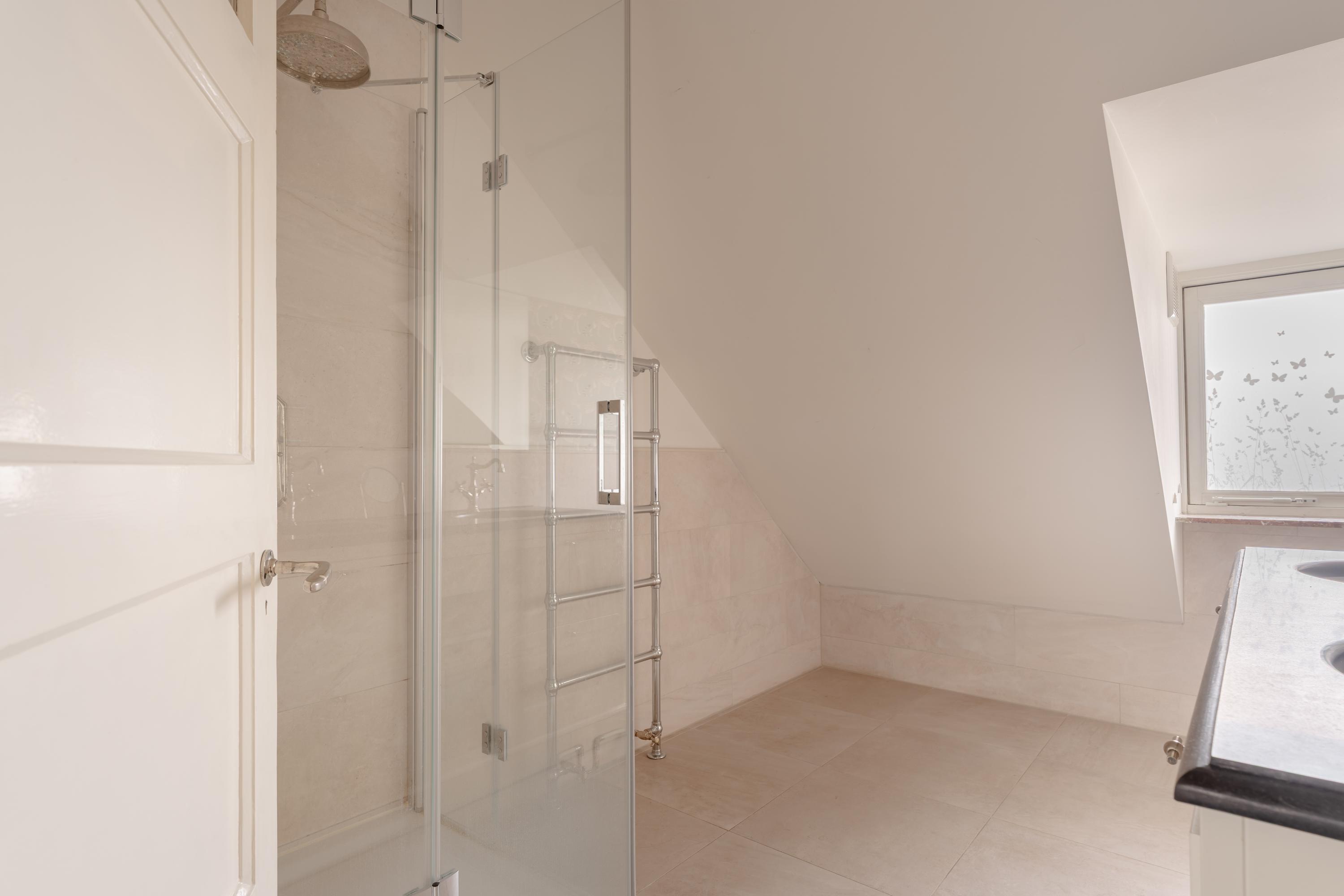 Aan de voorzijde bevindt zich een derde slaapkamer. De badkamer op deze verdieping is voorzien van een dubbele wastafel met meubel, een royale inloopdouche en een handdoekradiator.