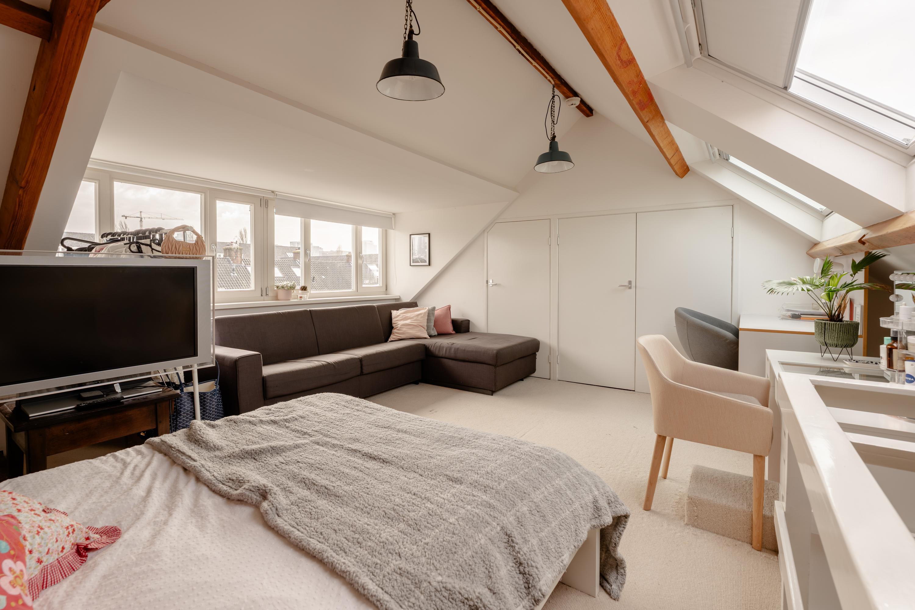 Via een vaste trap bereikt u de derde verdieping. Hier bevindt zich een zeer ruime en sfeervolle slaapkamer met zichtbare houten kapconstructie. Dankzij de dakkapel en dakramen valt er veel natuurlijk licht naar binnen, wat deze verdieping een bijzonder ruimtelijk karakter geeft.