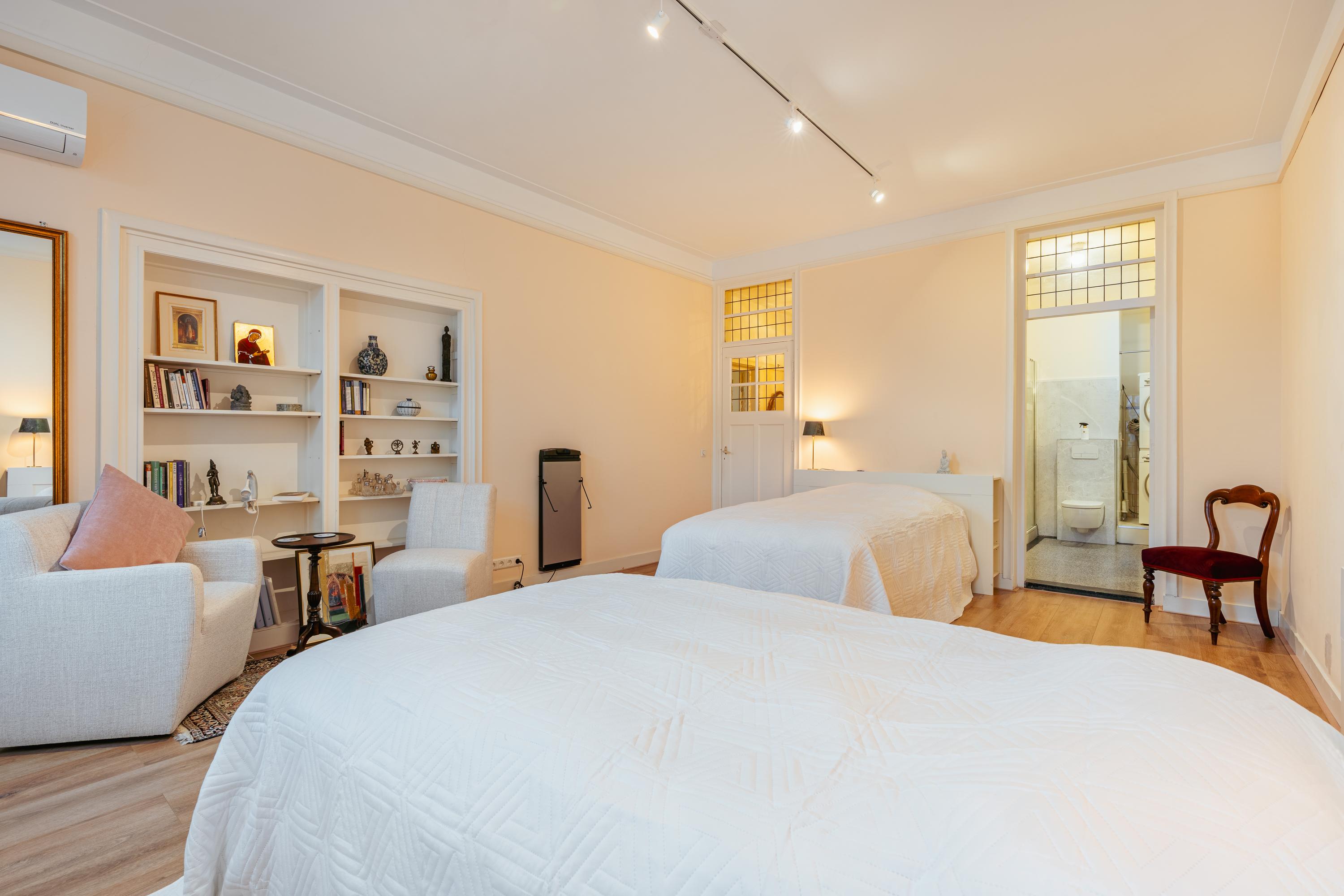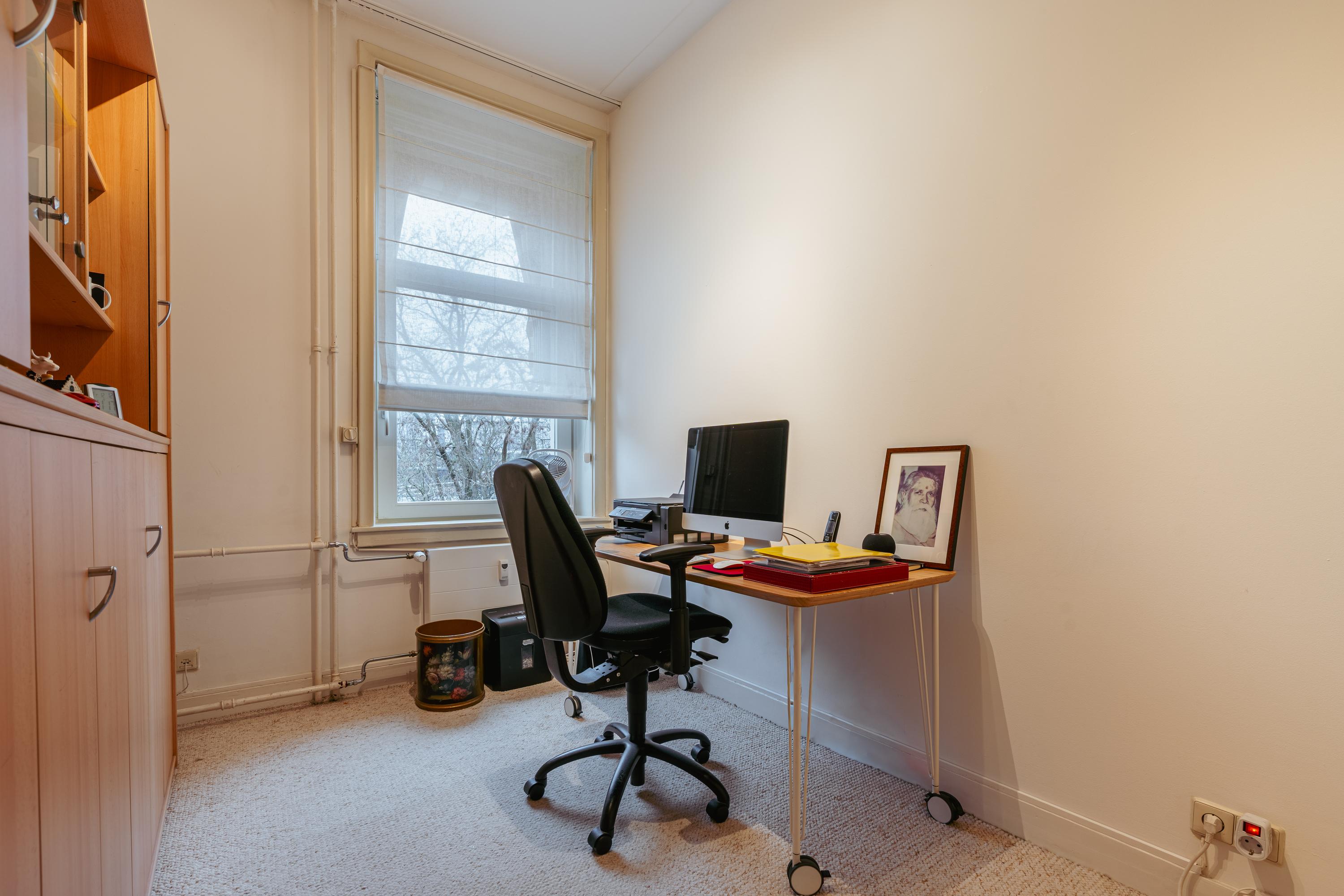 Aan de voorzijde van de woning ligt een ruime slaapkamer van goed formaat, ideaal als hoofdslaapkamer. Dankzij de royale afmetingen is er voldoende ruimte voor een groot bed én een kastenwand. Daarnaast beschikt de woning over een tweede kamer aan de voorzijde, die uitstekend geschikt is als werk-/logeerkamer, hobbyruimte of kinderkamer.