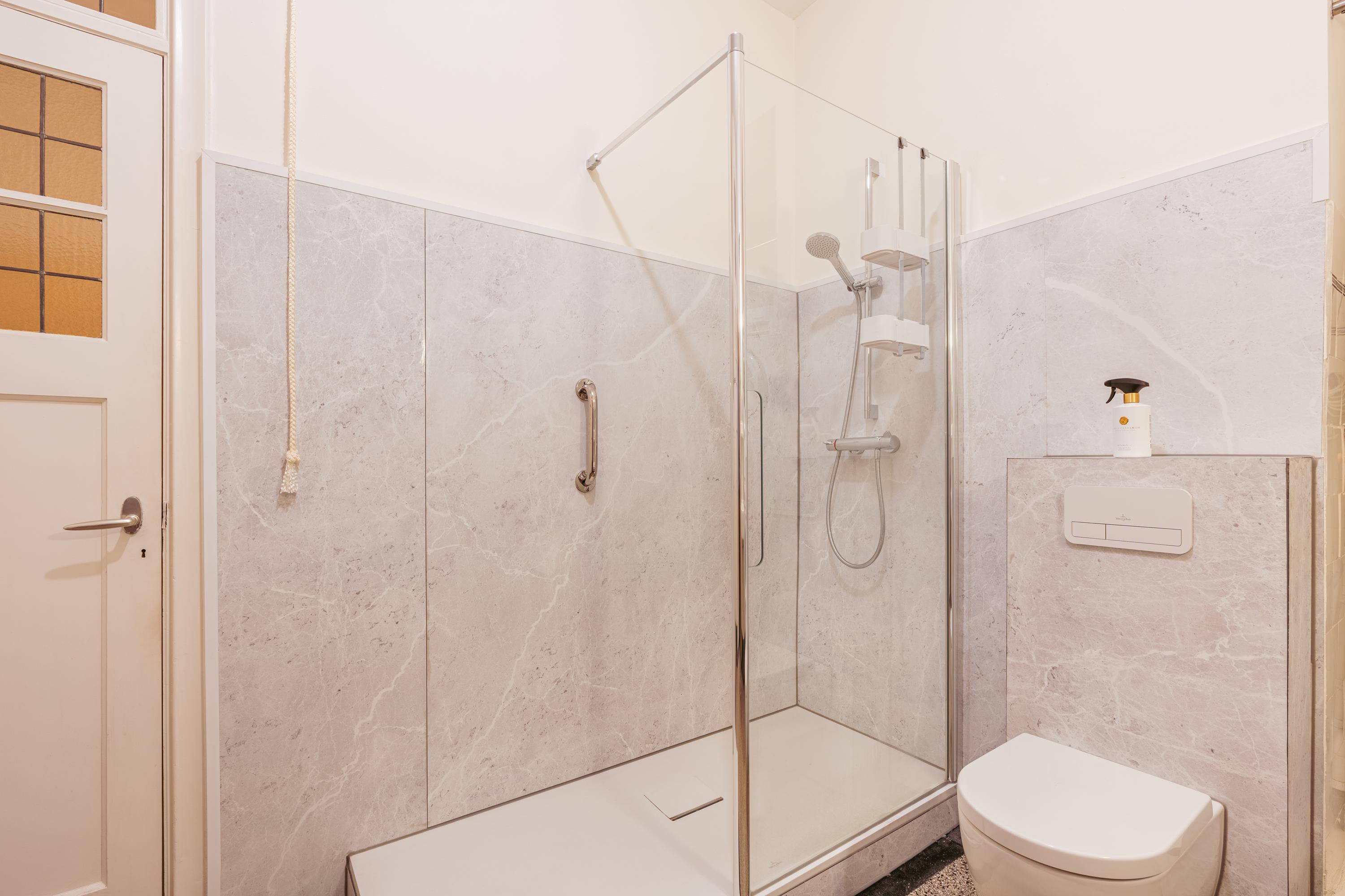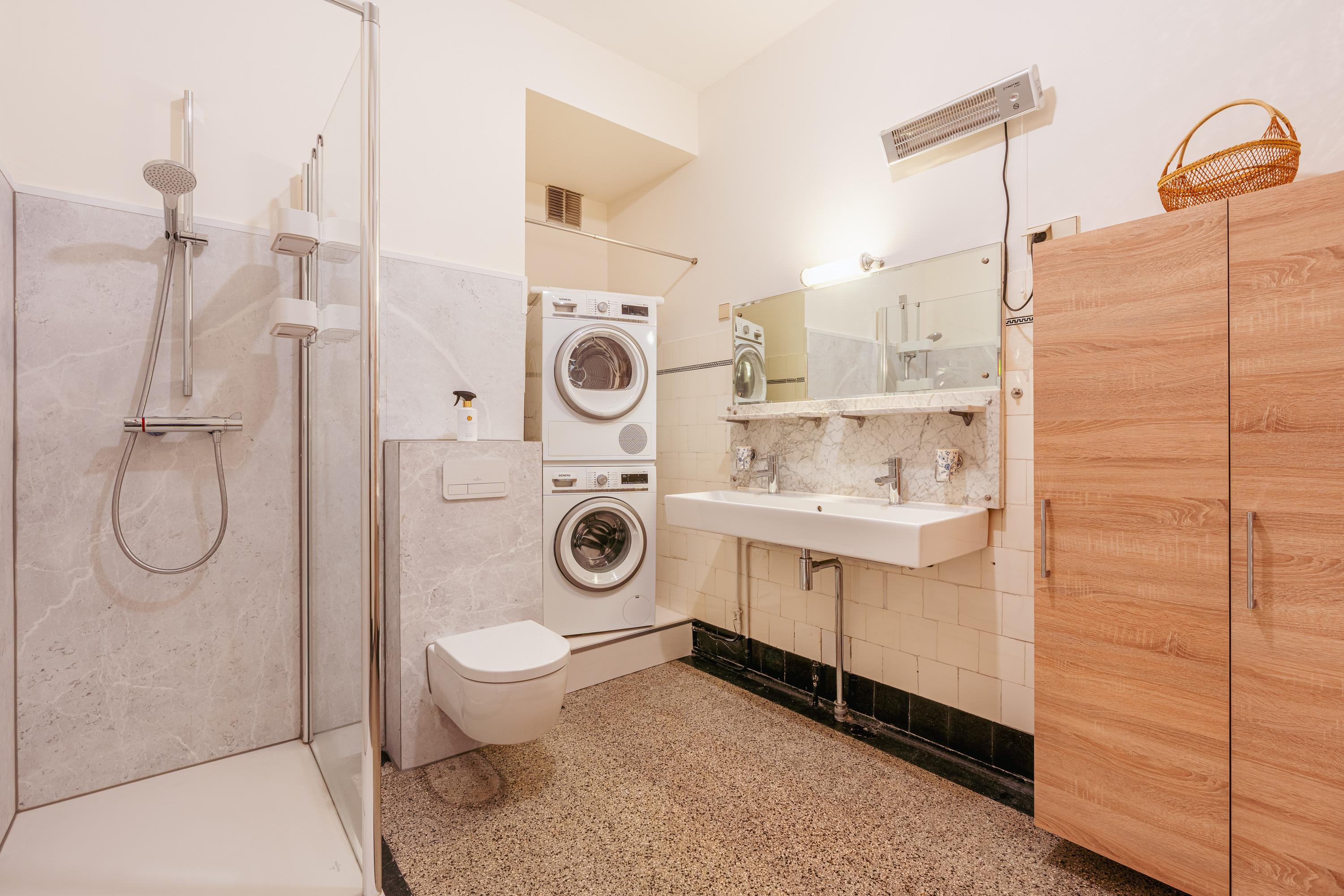 Centraal in de woning bevindt zich de badkamer, verzorgd en praktisch ingedeeld met een inloopdouche, een dubbele wastafel en een toilet. Daarnaast is er ruimte voor de opstelling van wasmachine en droger, waardoor alles comfortabel binnen handbereik is.