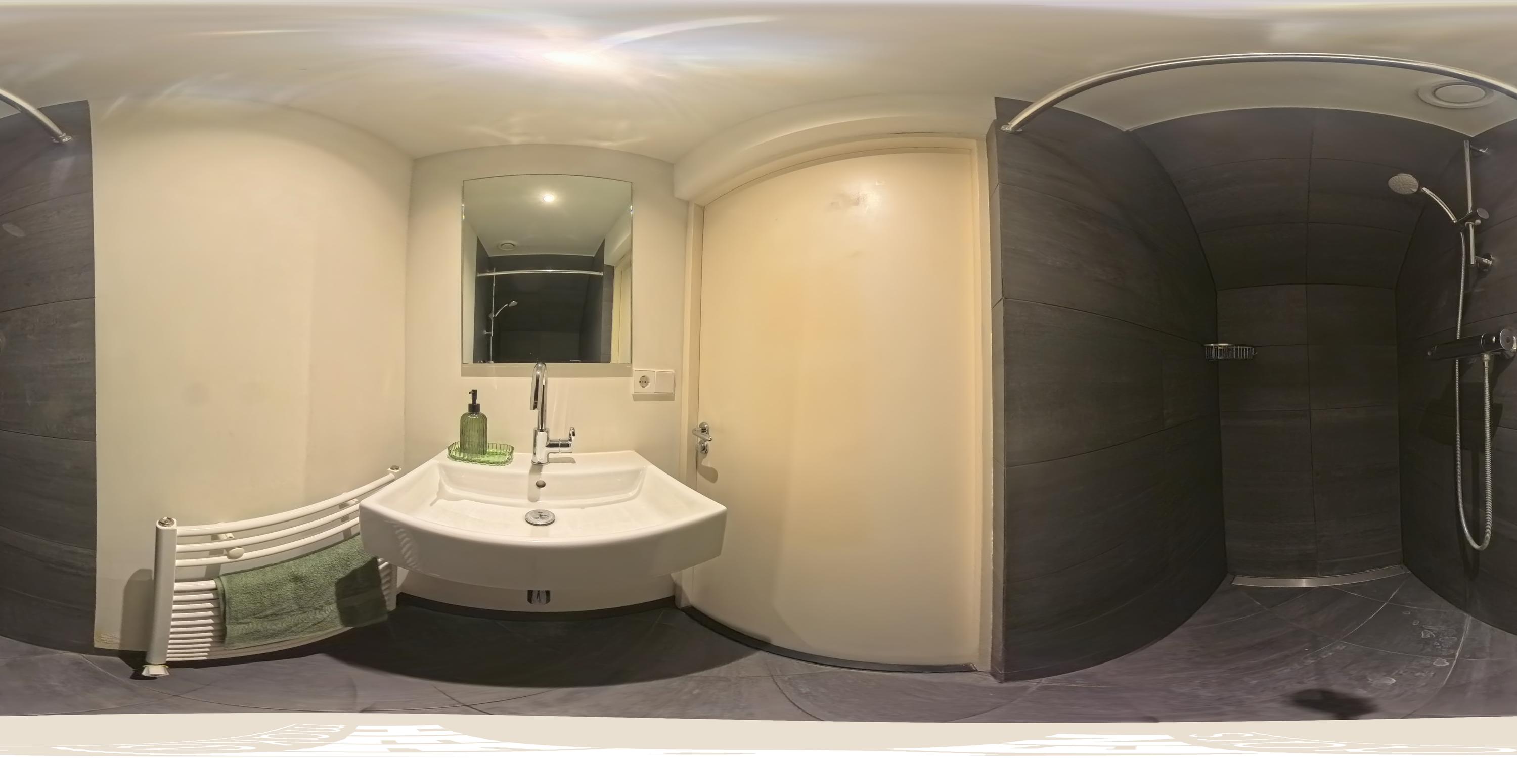 Via de open trap in de woonkamer loopt u naar de eerste verdieping, die eveneens een eigen entree heeft via het gemeenschappelijke trappenhuis. De ruime hal biedt voldoende plek voor een garderobe en extra kastruimte. Hier bevindt zich ook de eerste badkamer, uitgerust met een inloopdouche, wastafelmeubel en een separaat toilet met fontein. Aan de voorzijde ligt de royale master bedroom, voorzien van inbouwkasten, grote ramen en een en-suite badkamer met inloopdouche, wastafel en toilet. Aan de achterzijde bevindt zich de derde, goed bemeten slaapkamer met op maat gemaakte kasten en openslaande deuren naar het tweede balkon. Aangrenzend vindt u de wasruimte met gootsteen, die eveneens toegang biedt tot het balkon.