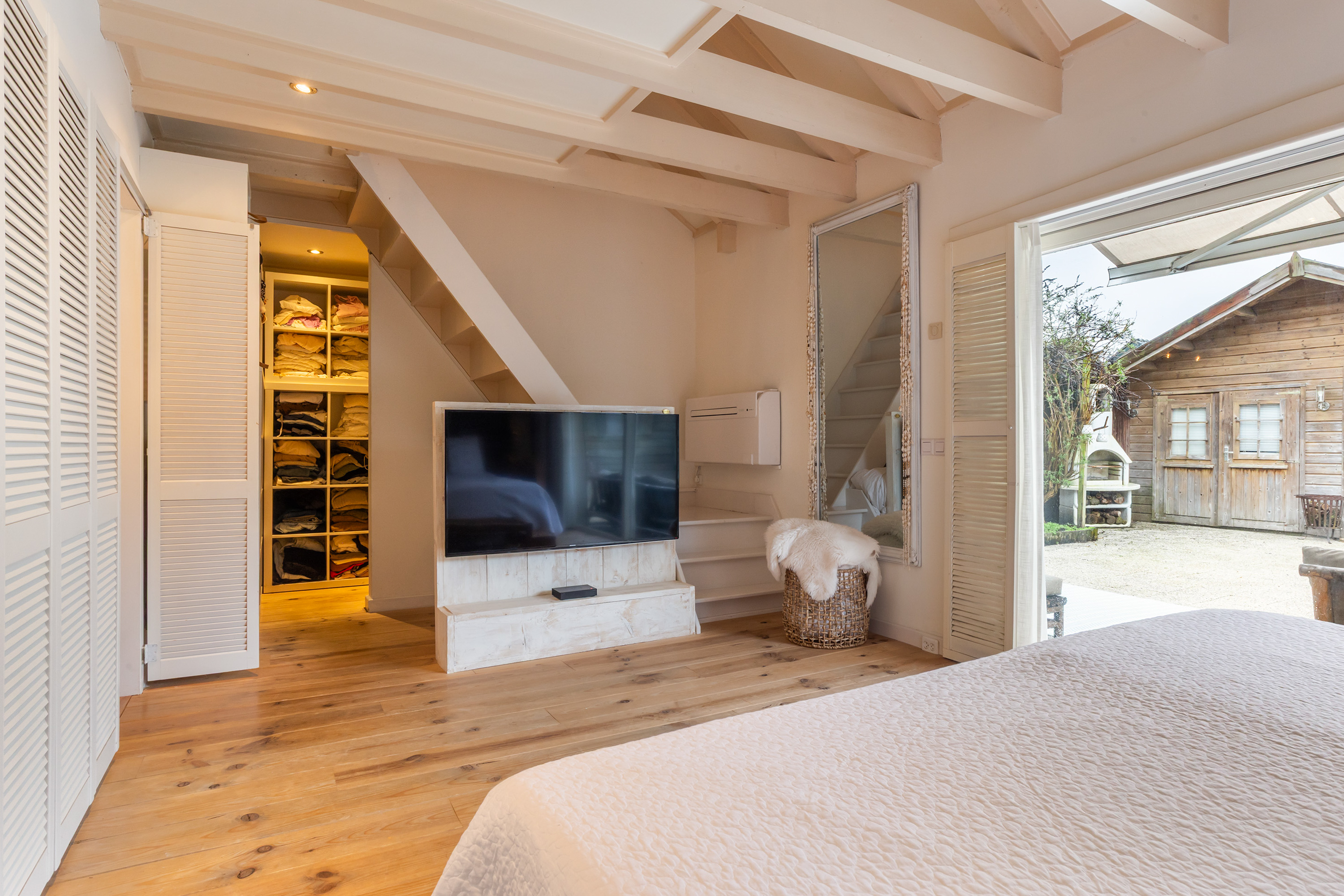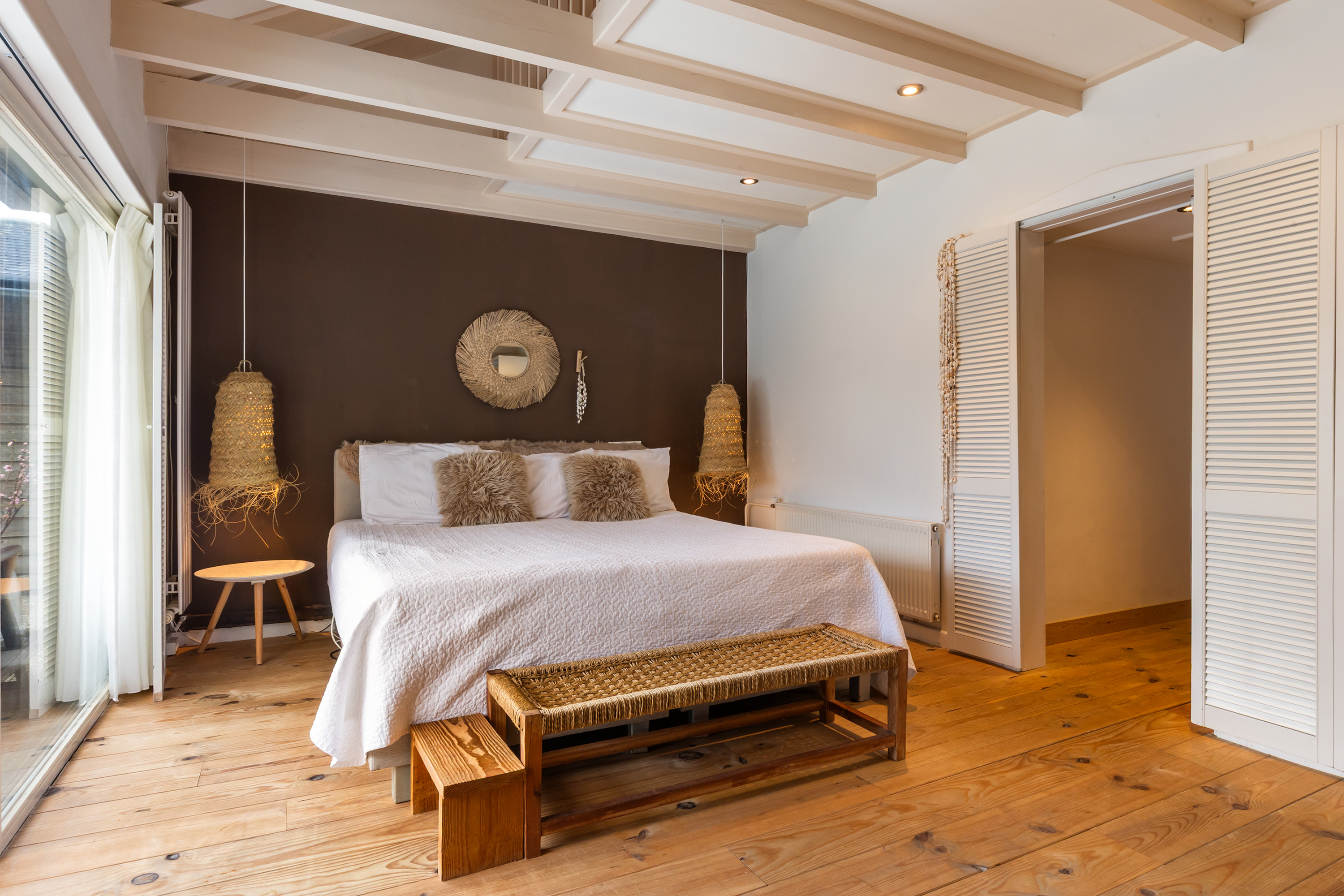 Daarachter bevindt zich een royale hoofdslaapkamer met een eigen luxe badkamer. De slaapkamer heeft een bijzonder karakter door de zichtbare balken en een vaste trap naar een ruime vide. Deze kan uitstekend dienen als werkplek, studeerruimte of extra bergruimte. Zowel boven als beneden zijn praktische inloopkasten aanwezig. Via een schuifpui vanuit de slaapkamer loopt u direct de tuin in.