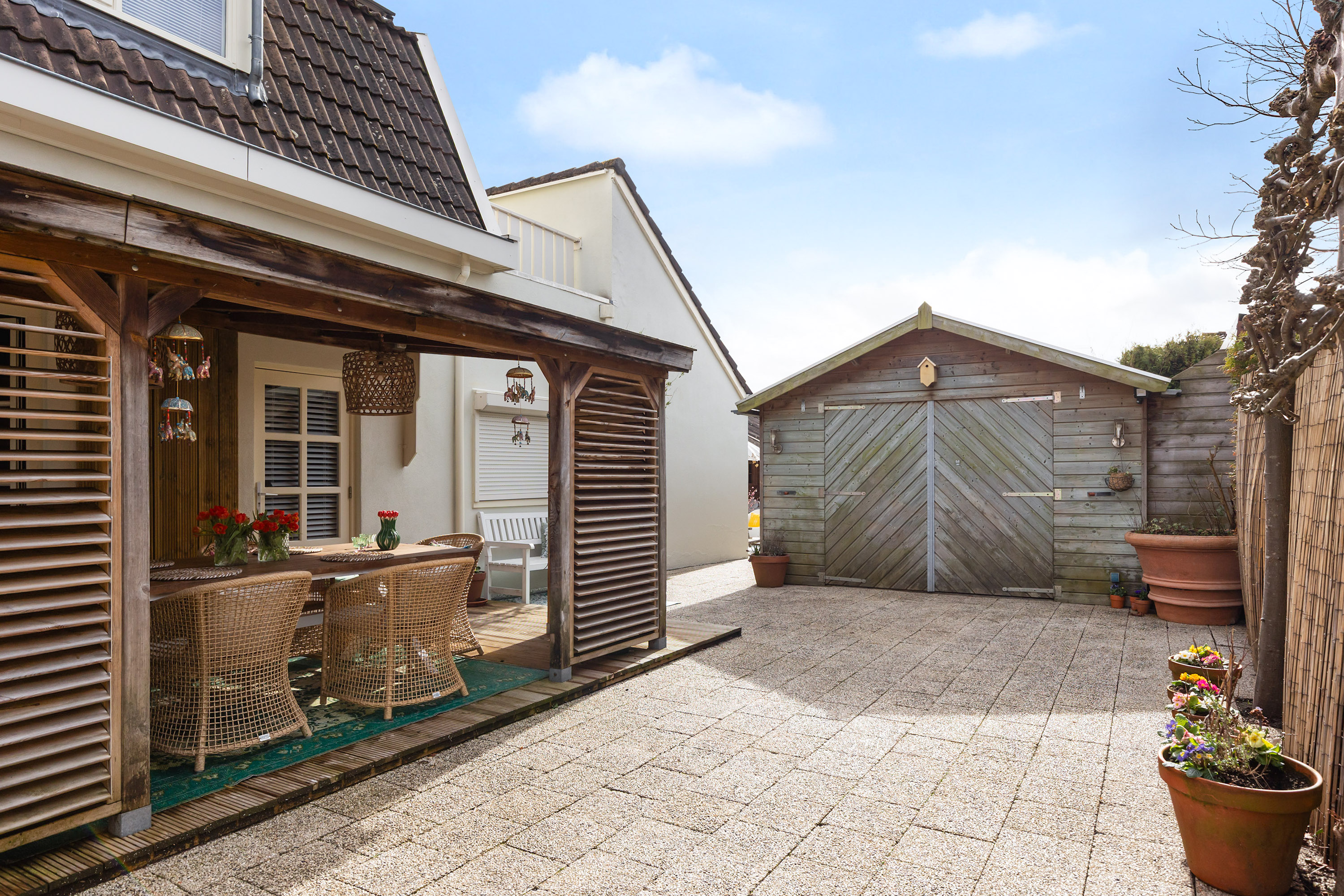 Naast de woning bevinden zich drie parkeerplaatsen op eigen terrein en is er ruimte die tevens geschikt is voor het stallen van een camper. Via dubbele tuindeuren is vanuit deze zijde toegang tot de houten garage met smeerput. De tuin is volledig besloten en biedt een grote mate van vrijheid en privacy. Door de ligging op het zuiden is er tot in de avonduren zon.