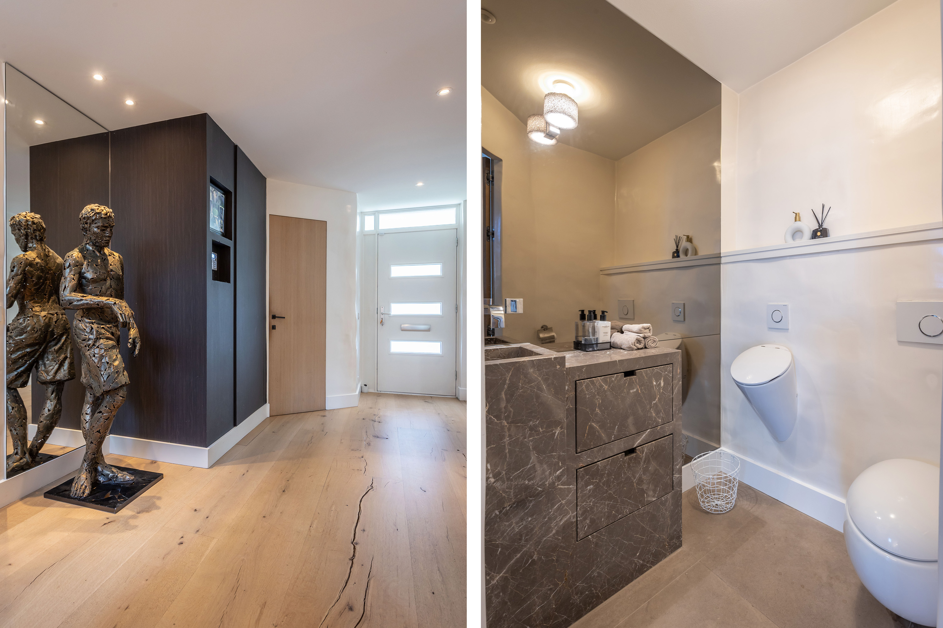 De entree is royaal, met open eiken trappen en sfeervolle verlichting. Het toilet is luxe uitgevoerd met een wandcloset, urinoir en marmeren wastafelmeubel.