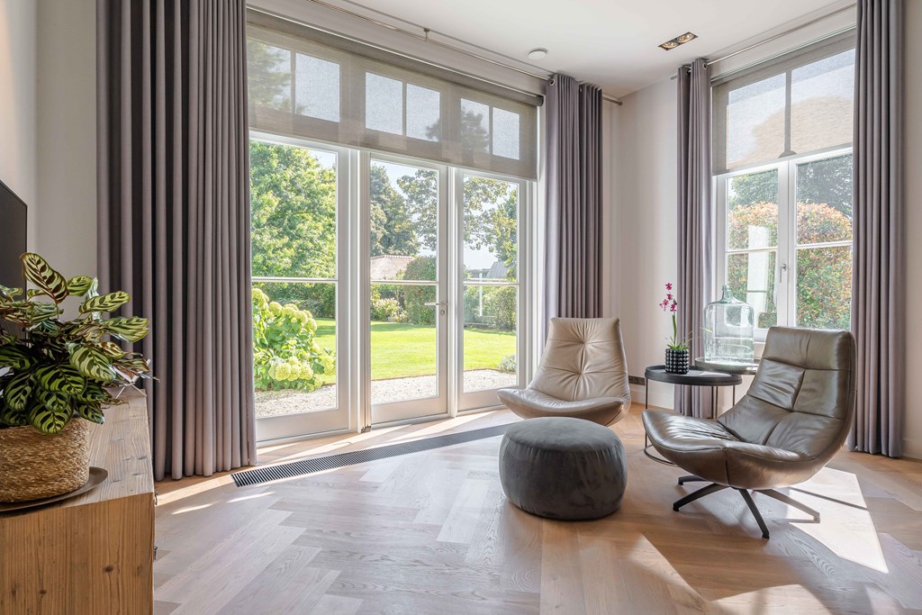 De zitkamer is voorzien van een parketvloer, een ingebouwde gashaard, inbouwverlichting en een tuindeur. Door de grote raampartijen aan zowel de voor, zij-als achterzijde is er veel natuurlijke lichtinval en heeft u een heerlijk uitzicht op de tuin.