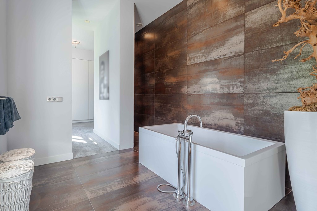 Slaapkamer 1 gelegen aan de voorzijde van de woning. Deze master suite, met doorkijkjes naar de tuin, is een oase van rust. Aansluitend heeft u toegang tot een kleedkamer en een complete badkamer met inloopdouche, een vrijstaand ligbad en 2 waskommen met meubel.