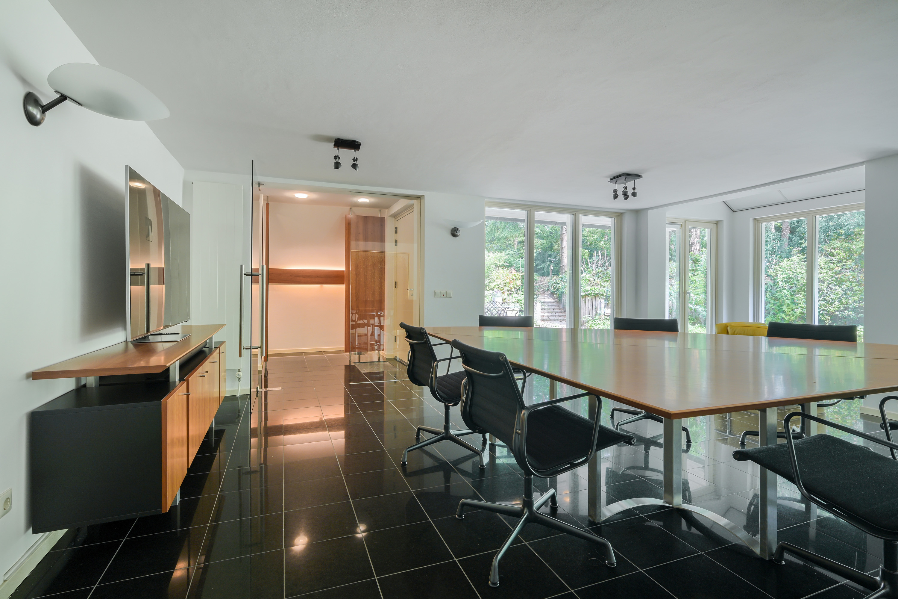 Prachtige woon- annex werkkamer met uitzicht op de tuin en terrassen. Deze lichte ruimte, voorzien van royale raampartijen, is gelegen aan de voorzijde van de woning. In een vaste kast bevindt zich de verdeelunit ten behoeve van de vloerverwarming.
