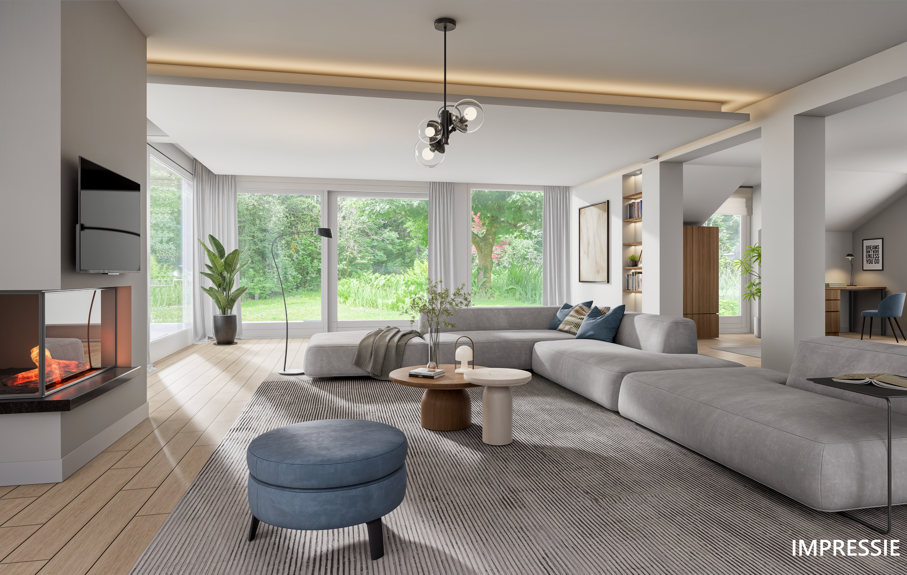 De woonkamer vormt het hart van de woning en is georiënteerd op de achtertuin. De ruimte is onderverdeeld in meerdere compartimenten:
