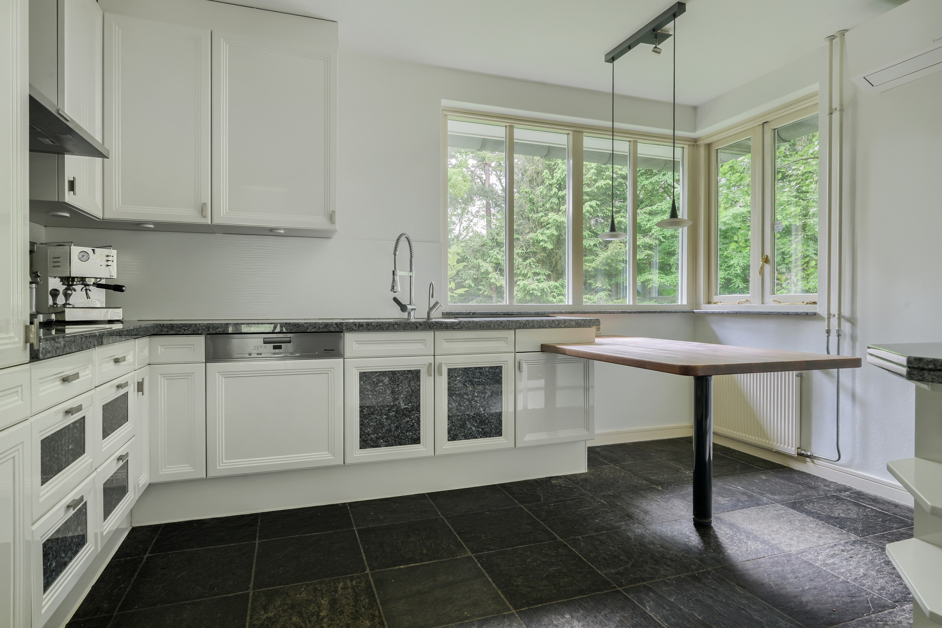 De uitermate royale en lichte zitkamer, met een afmeting van circa 9 bij 6 meter, grenst aan de tuin, welke u via twee schuifpuien rechtstreeks kan betreden. De woonkamer wordt gekenmerkt door een overvloed aan natuurlijk daglicht,