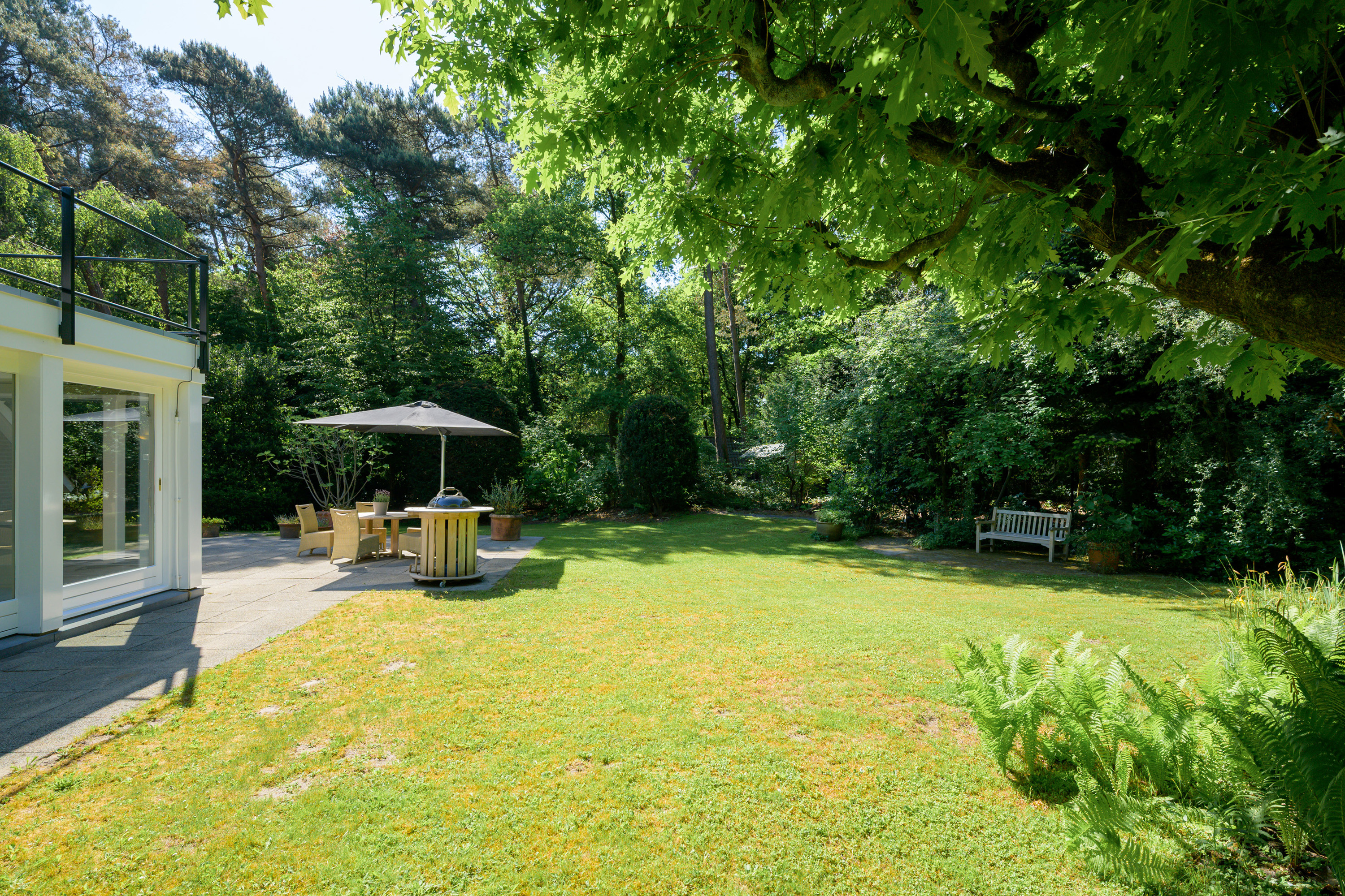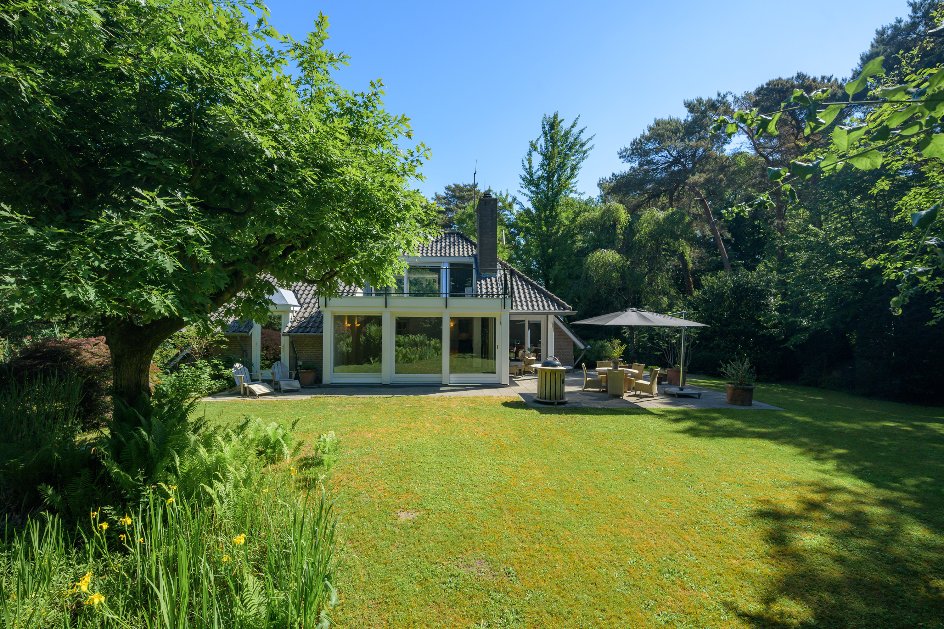 De prachtige, parkachtige (bos)tuin is rondom de woning gesitueerd en biedt ultieme privacy en het genot van het buitenleven. De ligging is uniek, een rustige, groene omgeving maar tevens nabij alle voorzieningen.