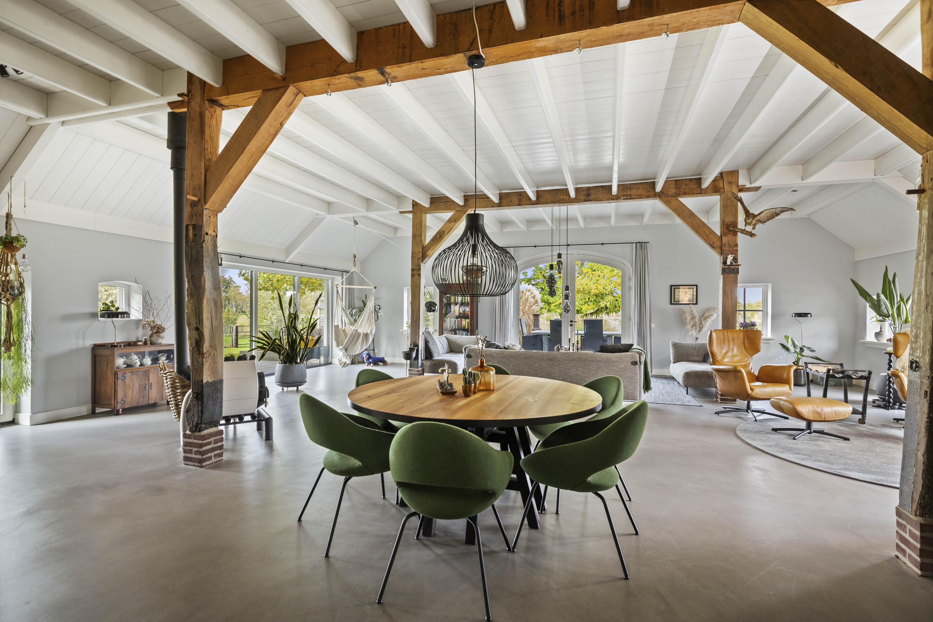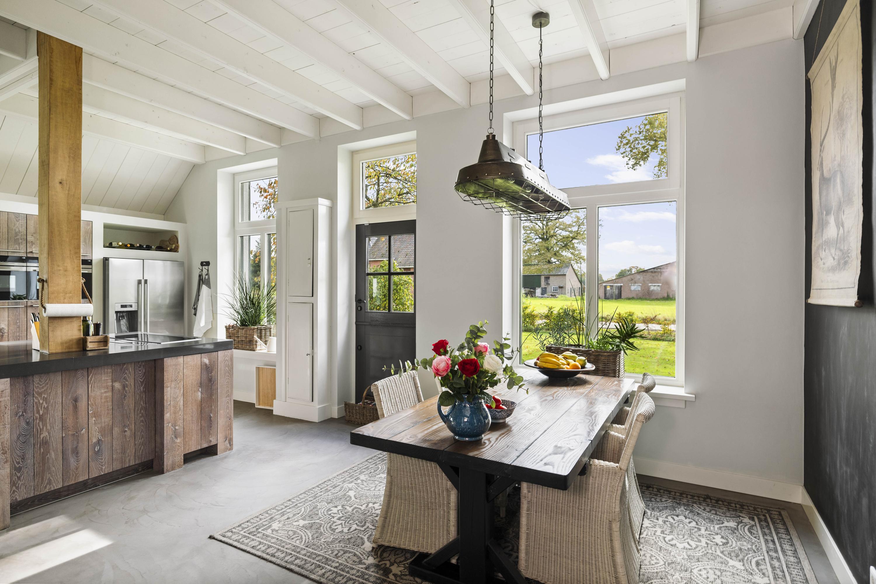 De keuken is maatwerk van Scheffer Keukens Zelhem en is ronduit indrukwekkend; met een dik, composiet werkblad, robuuste massief eiken fronten en alle moderne inbouwapparatuur – van inductieplaat tot Quooker - is het een heerlijke plek om je als chef-kok uit te leven. In de oude schouw staat nog een stoere Nordic Fire houtkachel, die de keuken voorziet van extra sfeer en warmte.