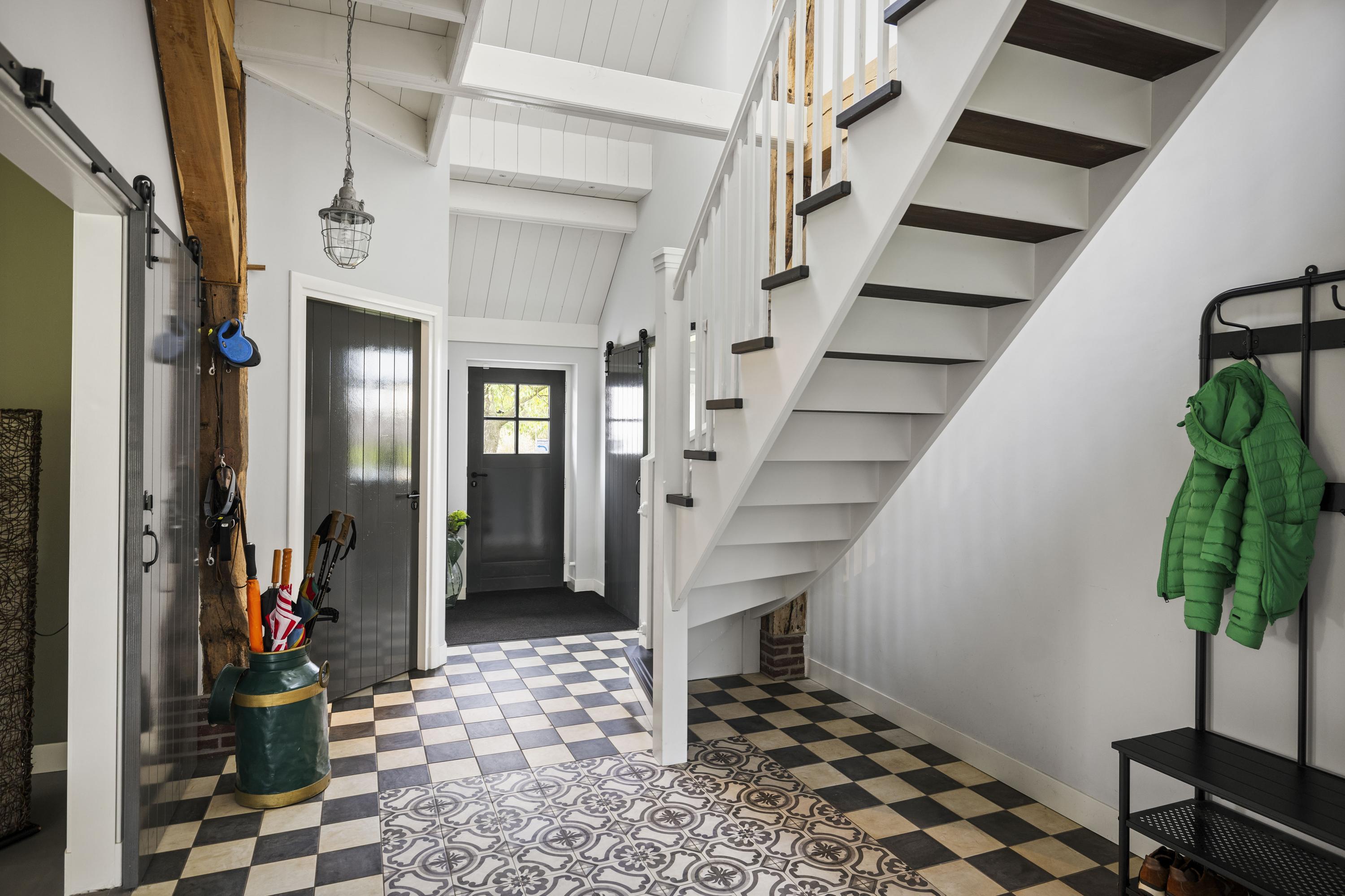 De ruime hal met Portugese tegels biedt een royaal welkom. In de hal de toegang tot de technische ruimte, de trap naar de verdiepingen en de leefruimtes op de begane grond. De voormalige deel is nu een heerlijke woonkamer en de oude deeldeuren zijn vervangen door grote raampartijen. De Bulle -Jan (FreeFlow, A++) houtkachel zorgt voor een gezellige warmte.