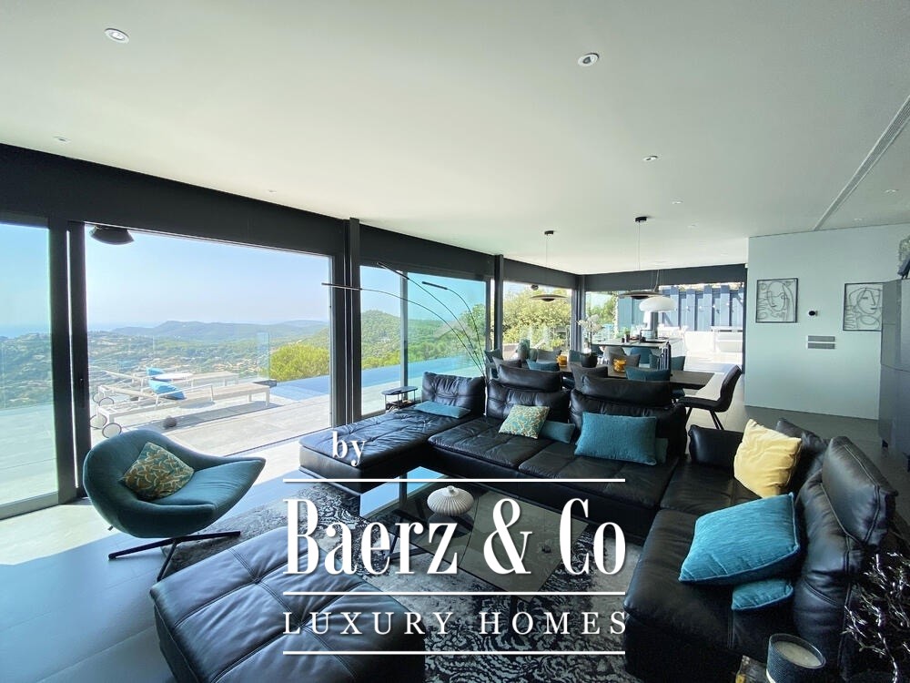 Op het volgende niveau bevindt zich een elegante woonkamer met eetkamer en open keuken, waar modern design wordt gecombineerd met de warmte van de Begur-steen. Vanuit de woonkamer heeft men toegang tot een groot zonneterras met een spectaculair overloopzwembad, barbecuezone en badkamer.