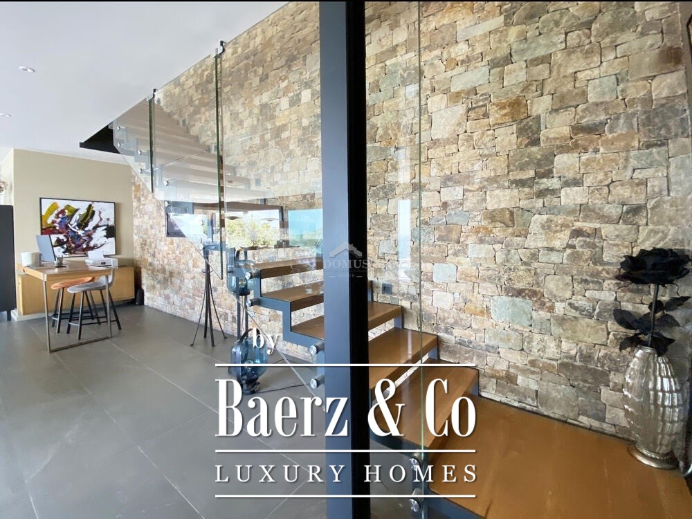 De woning is verdeeld over drie niveaus die allemaal baden in overvloedig licht. Op de bovenste verdieping bevinden zich een grote garage, hal, wasruimte en een tweepersoonskamer in suitesstijl met privébadkamer, keuken en toegang tot een ruim terras.