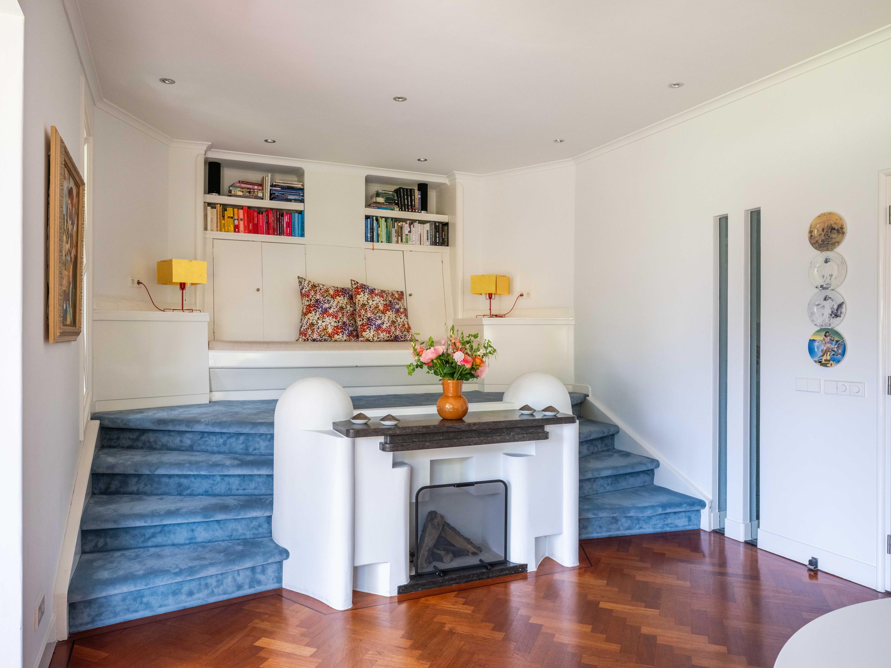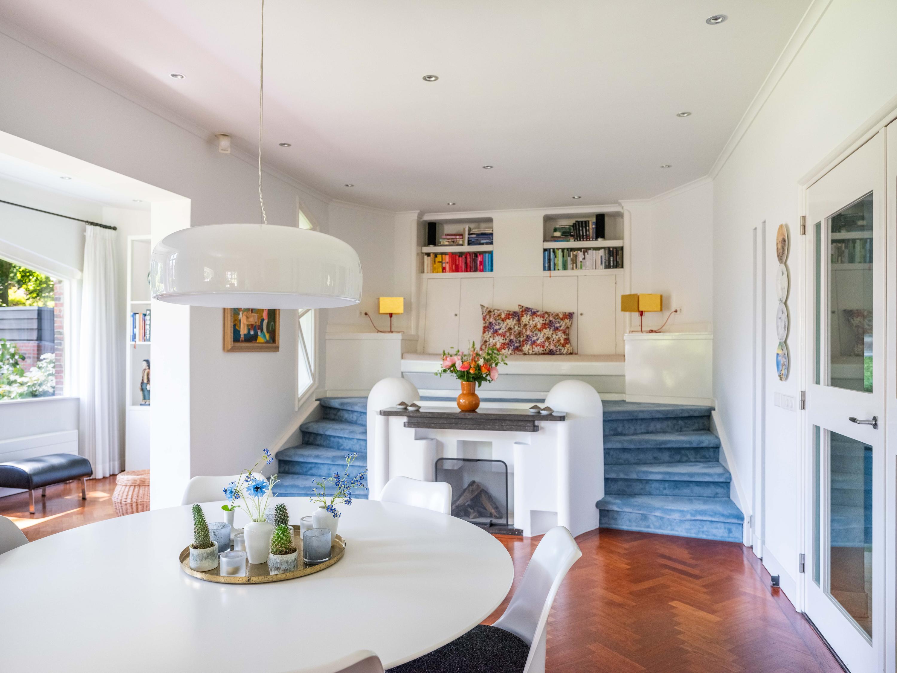 Openslaande deuren leiden naar de royale woonkamer met open haard, een eetgedeelte en serre. Opvallend is het verhoogde gedeelte "de stuurhut". Een mooie parketvloer met bies, de ronde vormen van de open haard , de "kompasbollen" bij de verhoging en het trapeziumvormige raam met kolommen geven het geheel een bijzondere uitstraling.
