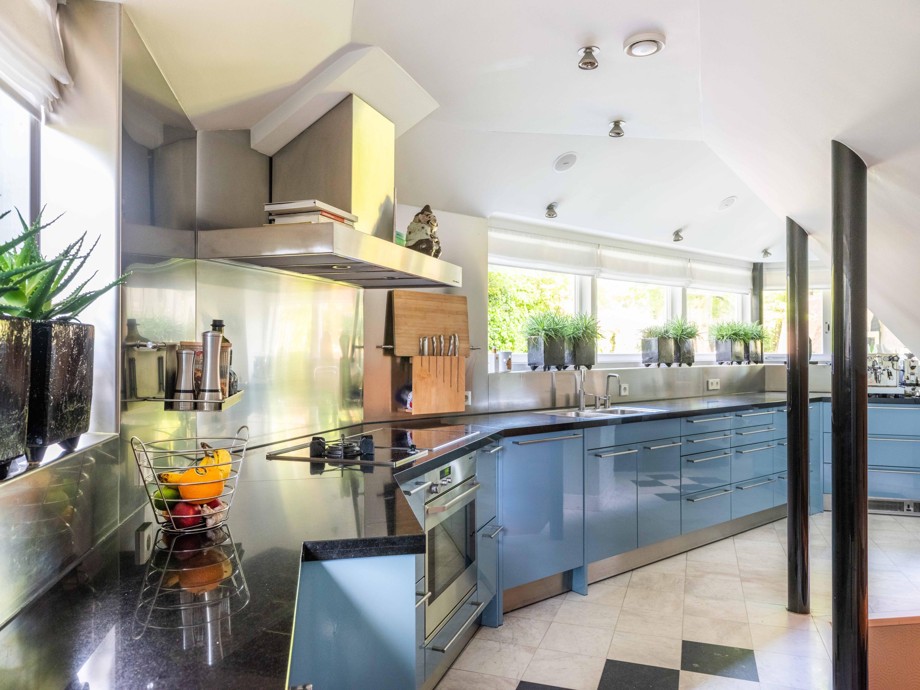 Via de hal bereiken we de woonkeuken voorzien van moderne inbouwapparatuur. Door de vorm, een halve zeshoek, is deze speels en bijzonder van opzet, dit ook door het eetgedeelte, met ruimte voor een grote tafel, dat een niveau lager is gelegen.