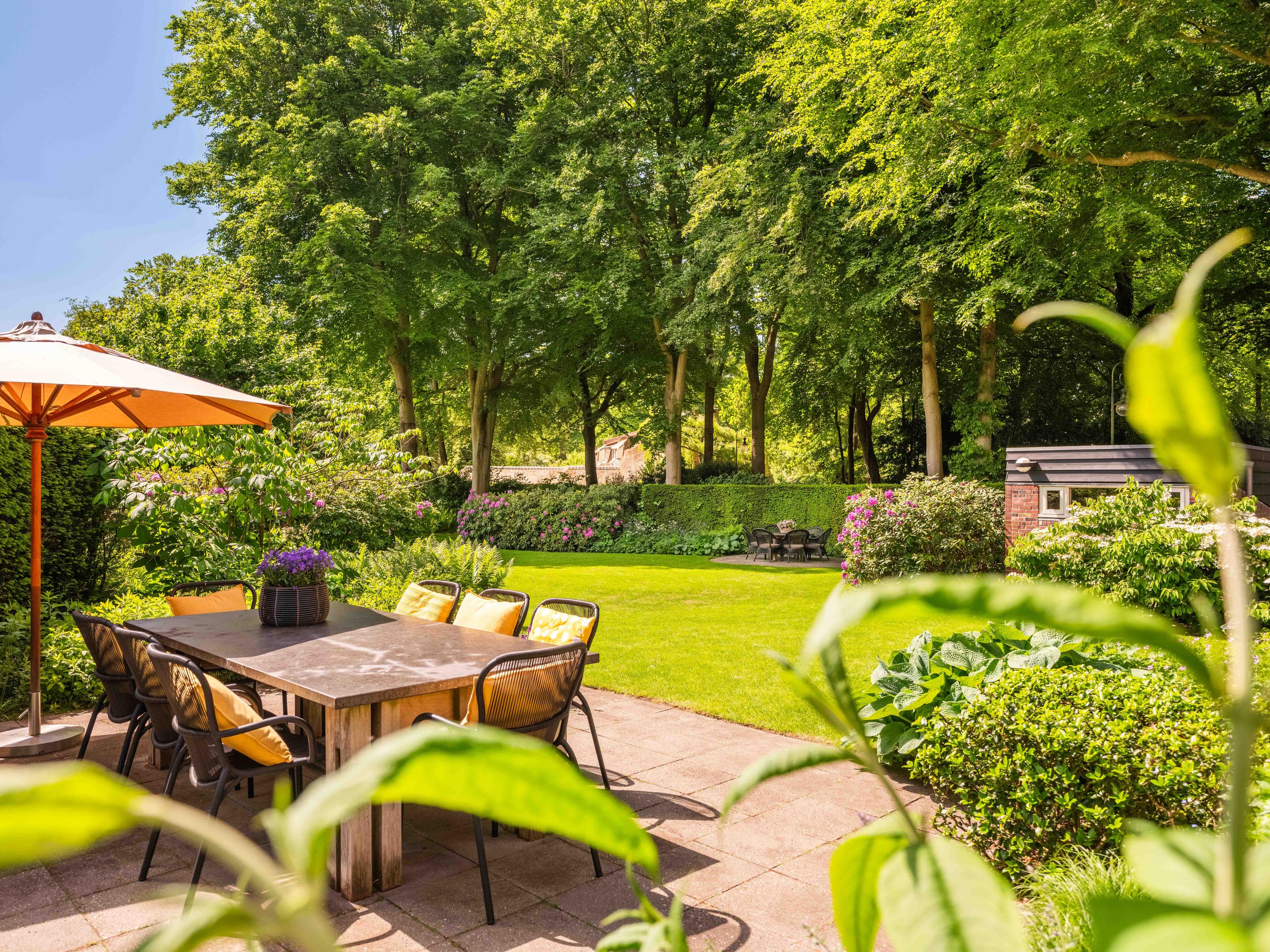 De prachtige parktuin met ligusterhagen, bloempartijen en imposante bomen is rondom de villa gelegen. Naast de villa staat een in dezelfde stijl gebouwde en volledig geïsoleerde schuur voor bijvoorbeeld de fiets, tuinspullen, etc. Hier treft men ook de opvang voor het centrale stofzuigersysteem en de pomp en bewateringsinstallatie voor de tuin.