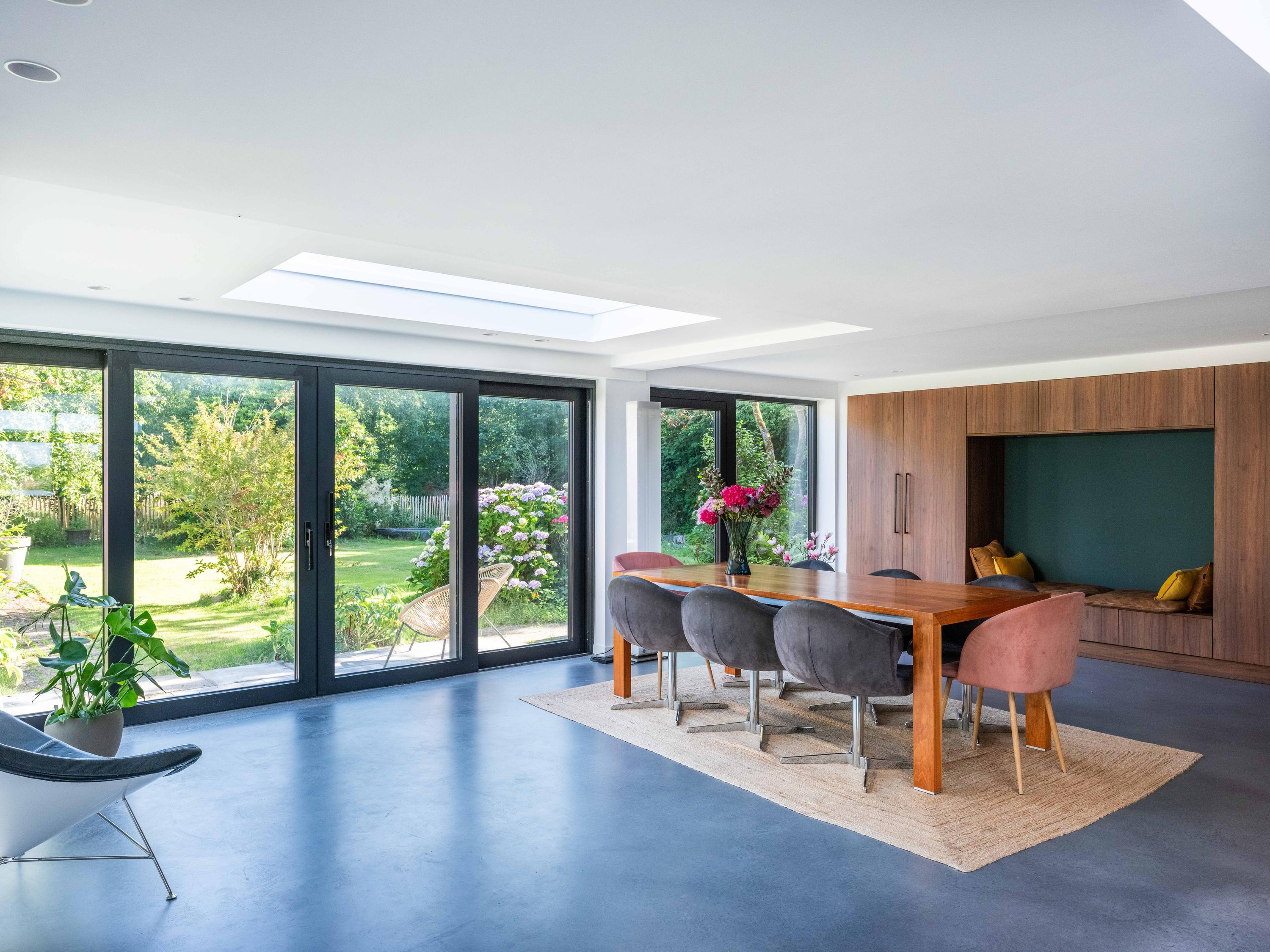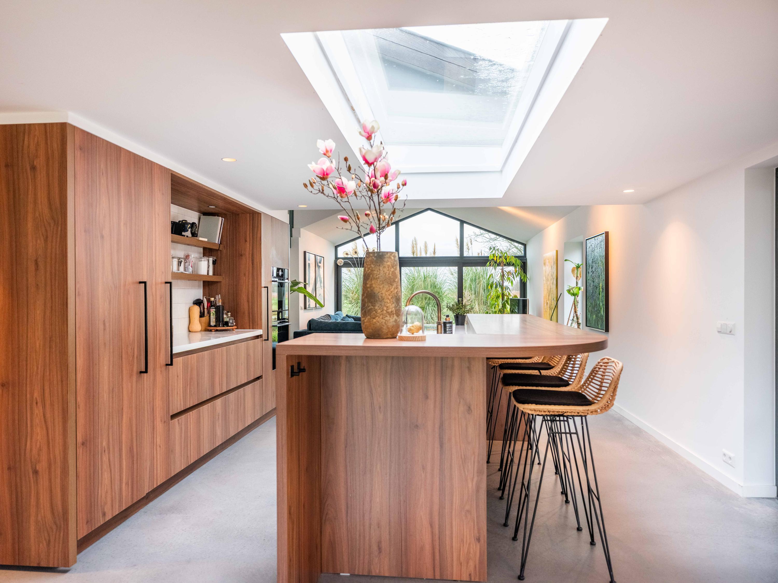 De op maat gemaakte keuken in rijk notenhout-look is een droom voor iedere kookliefhebber: zeer compleet, met hoogwaardige apparatuur waaronder een luxe wijnklimaatkast. Een architectonisch hoogstandje is de notenhoutenlook wand met verborgen deur; hierachter schuilt een ruimte die perfect dienst kan doen als riante bijkeuken. De zitkamer aan de voorzijde biedt een gezellige speel-/leeshoek en een panoramisch uitzicht over de polder. Aan de achterzijde vindt u de lichte eetkamer met grote dakramen, maatwerkkasten en openslaande deuren naar de tuin.